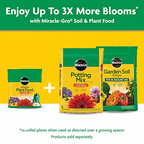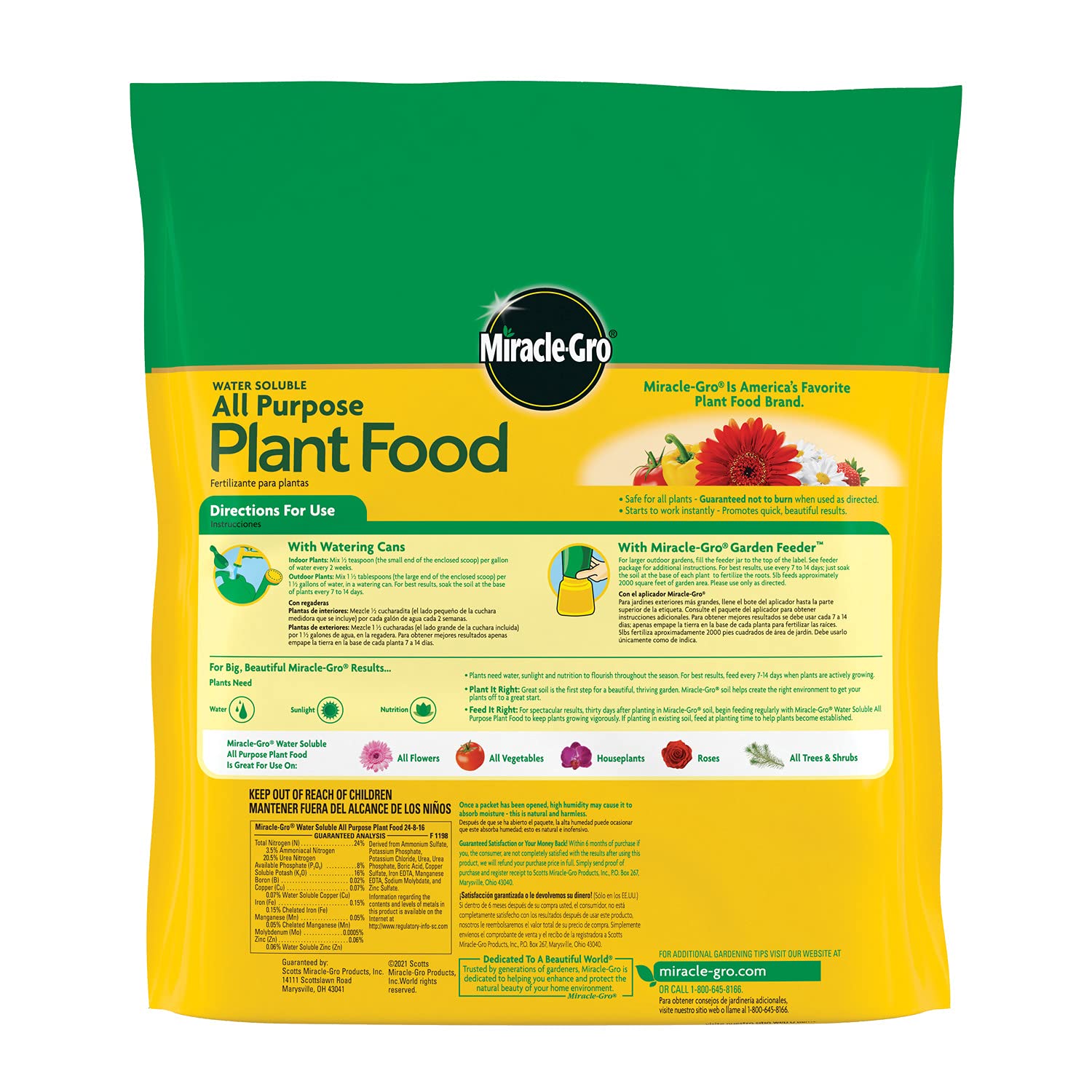 When you use Miracle-Gro® Water Soluble All Purpose Plant Food to instantly feed flowers, vegetables, roses, trees, shrubs, and houseplants you'll enjoy bigger and more beautiful plants vs. unfed plants. For best results, feed your plants every 7 to 14 days when they are actively growing. Use with a Miracle-Gro® Garden Feeder to feed your outdoor flowerbeds. Also, there’s a convenient measuring scoop included so you can easily measure and add to any watering can, then feed your indoor plants or outdoor container plants while watering. For best results, feed your plants by soaking the soil at the base of the plants to fertilize the roots when watering with Miracle-Gro® Plant Food. In-between feedings, reseal the remaining plant food in the waterproof bag change to "for easy storage". The Miracle-Gro® Water Soluble All Purpose Plant Food 5 lb. bag will feed up to 2,000 sq. ft. The formula is safe for all plants and will not burn when used as directed. Enjoy beautiful results with Miracle-Gro®.