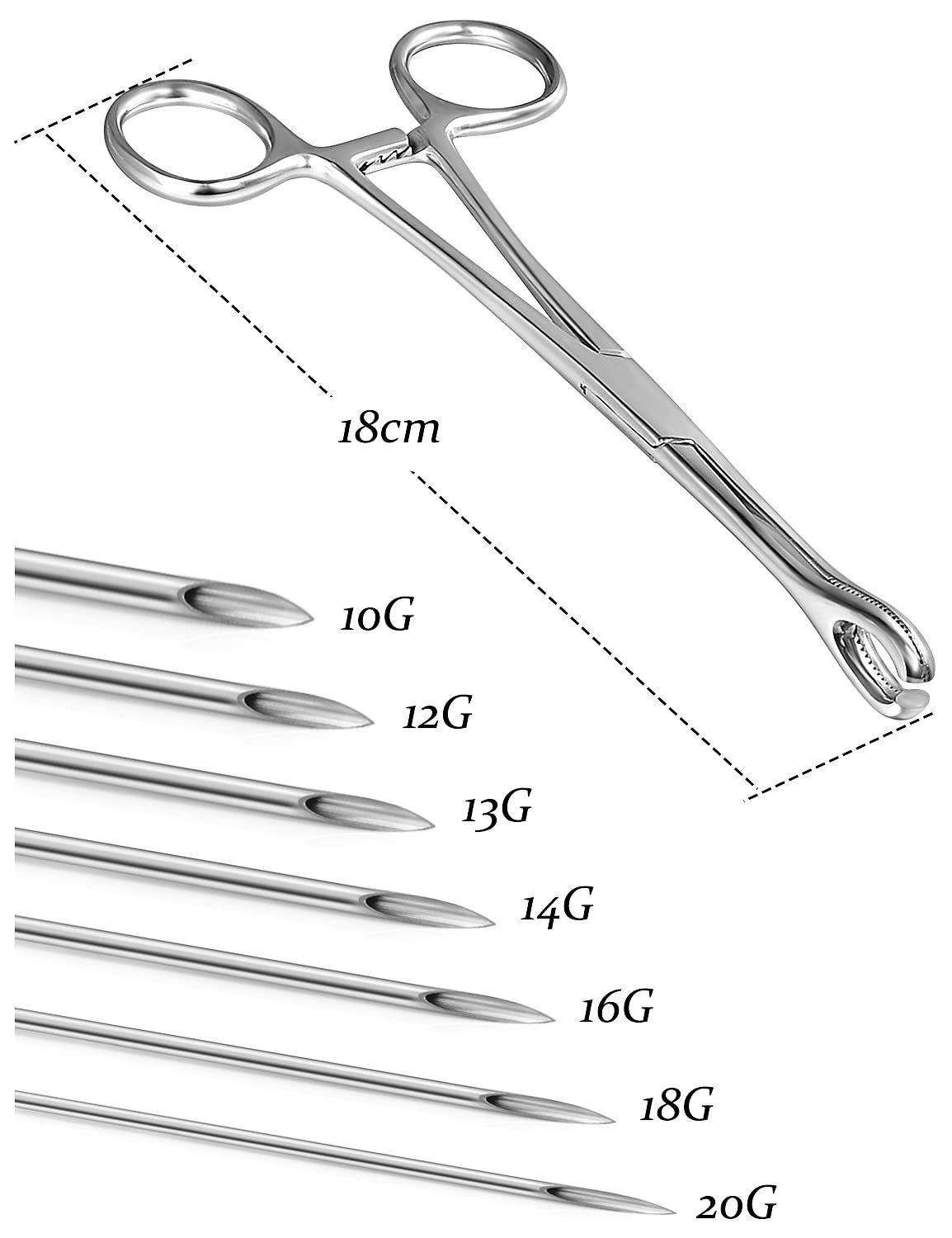 [PRODUCT SIZE]: Forceps Piercing Clamps Piercing Tools: 178mm=7inch, Piercing Needles: 20G 18G 16G 14G 13G 12G 10G Each Size 2pcs, Piercing Jewelry: 20G 16G 14G.