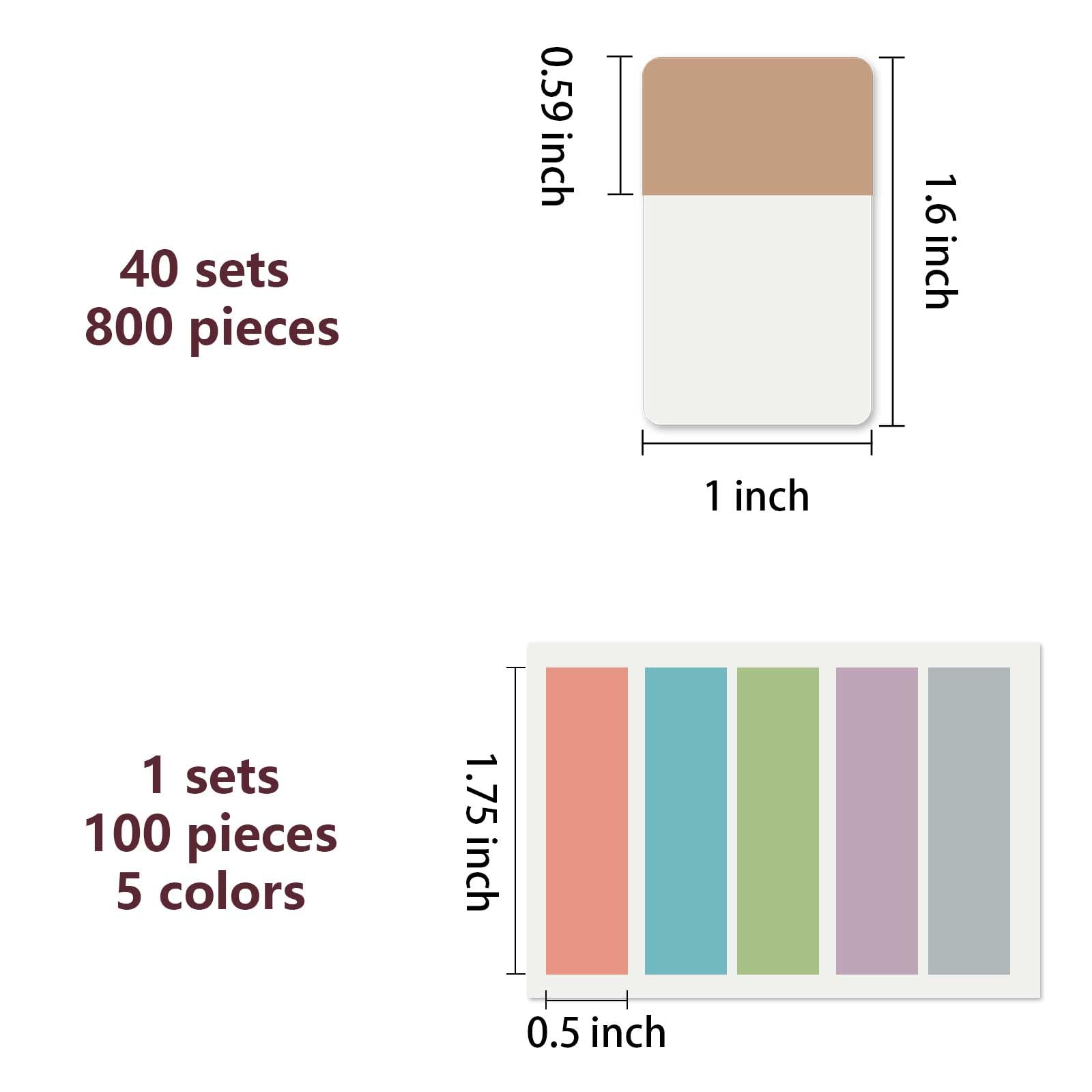 900 Pieces Tabs: totally 900 pieces 41 sets in total,800 pieces 1 inch adhesive index tabs in 40 sets with 10 different pastle colors,100 pieces 0.5 inch tabs in 1 sets, 20 pieces each color and color as picture displayed