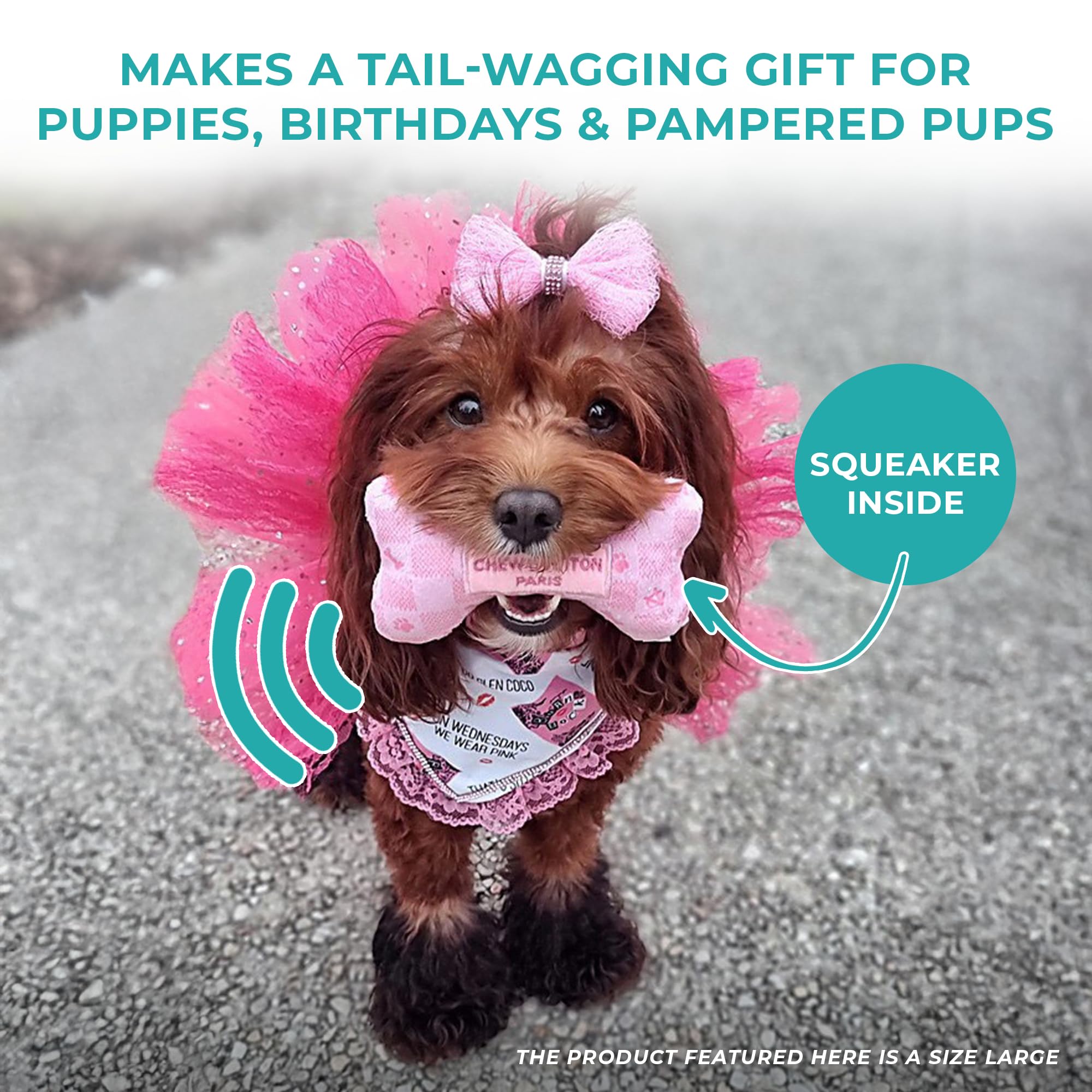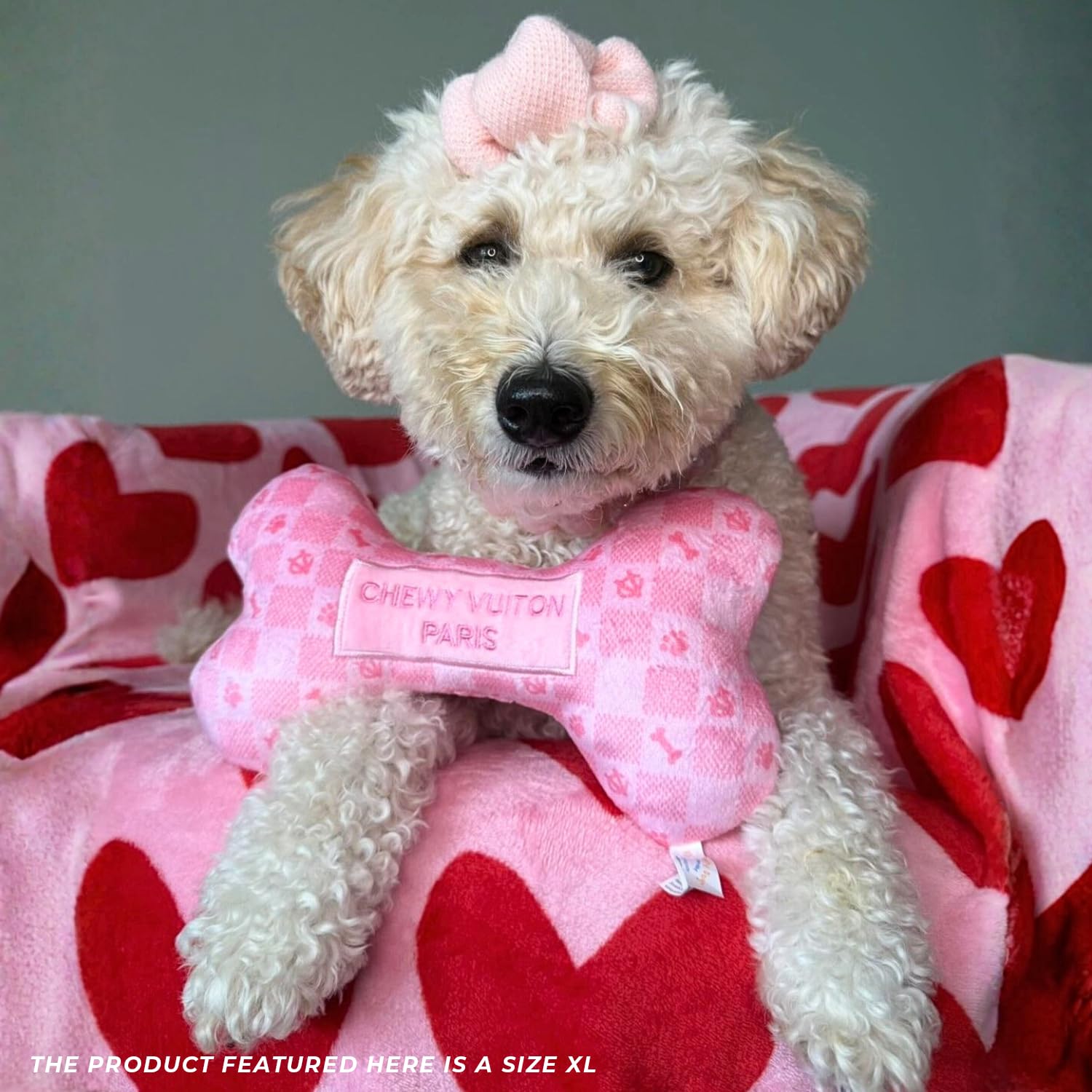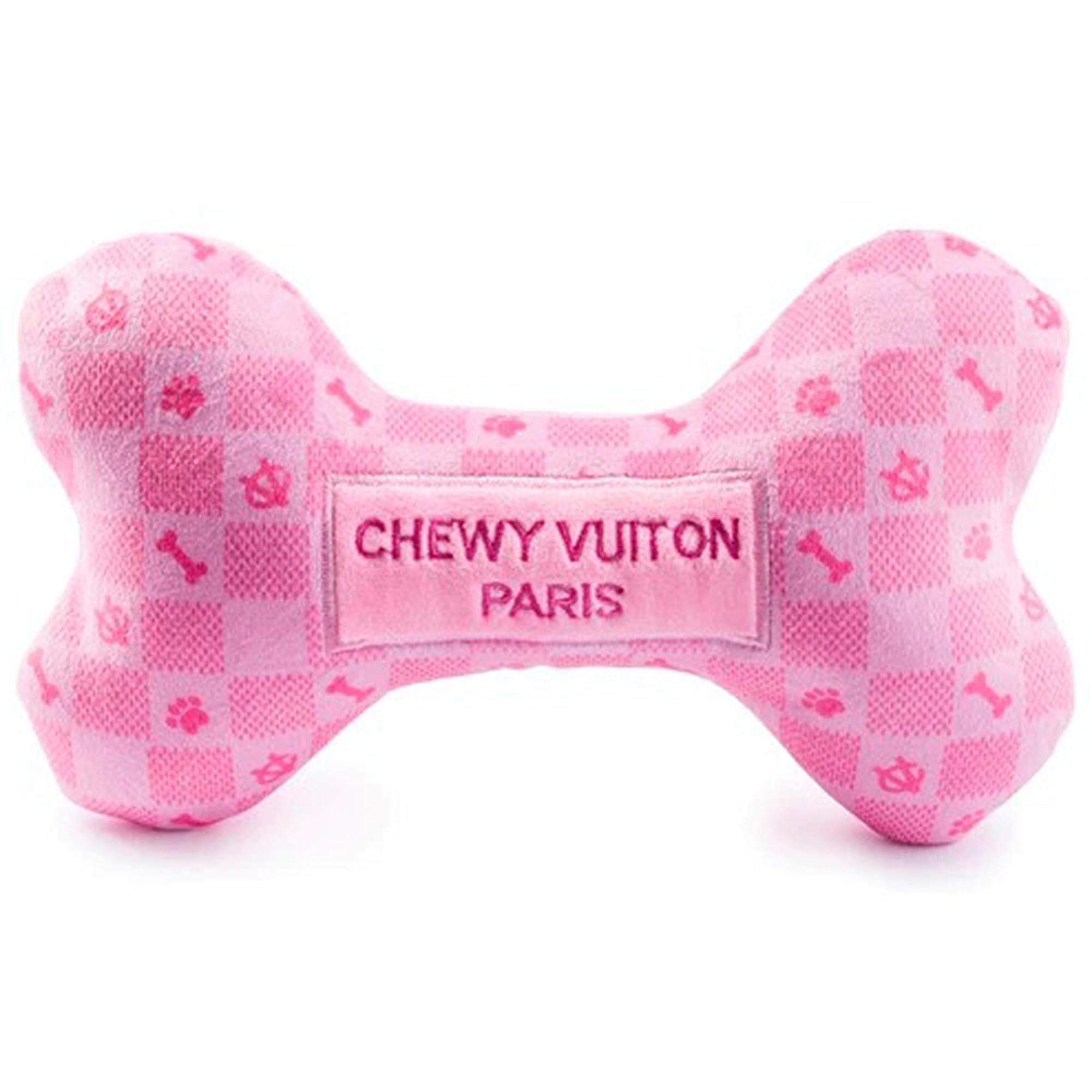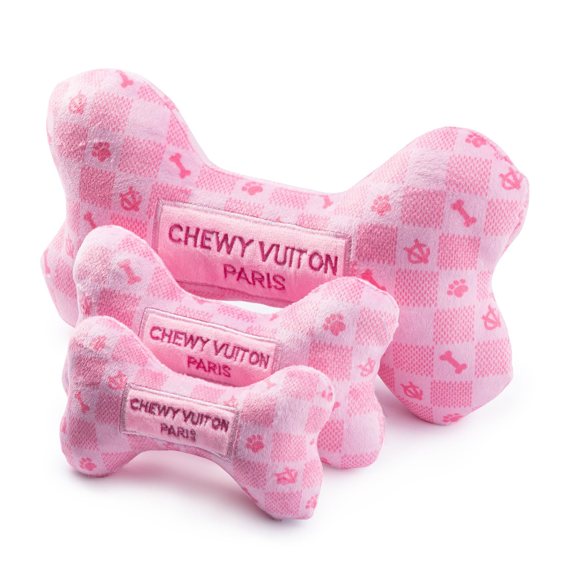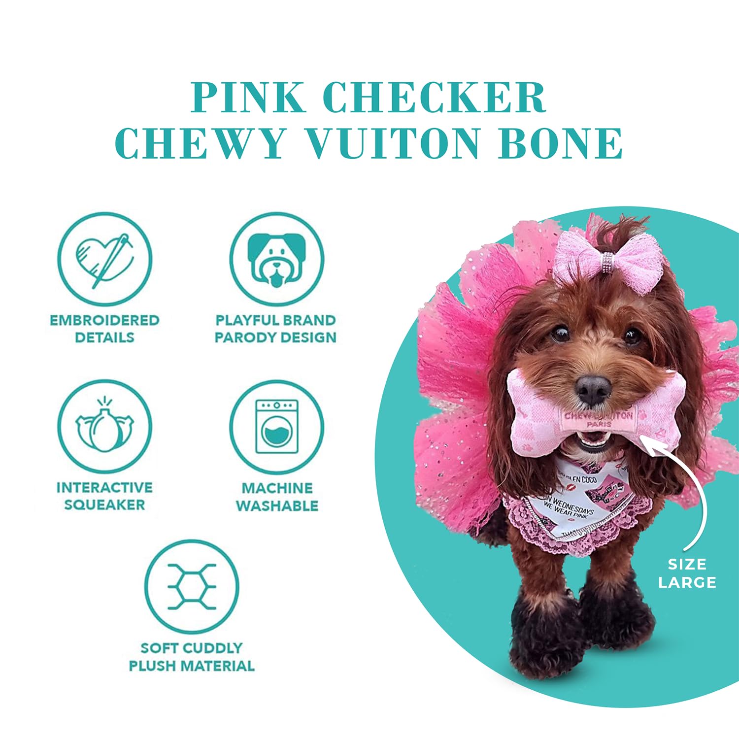 Funny Parody Plush Dog Toy: Let your furry fashionista fetch some fashion-forward fun with this Pink Checker Chewy Vuiton Bone dog plush toy, featuring a stylish pink and white checkered pattern on the soft plush exterior, a built-in squeaker hidden inside, and a durable mesh lining for added strength, making it suitable for aggressive chewers; it’s a playful, cute squeaky dog toy that combines style and fun, measuring 9"x6”x1.5”