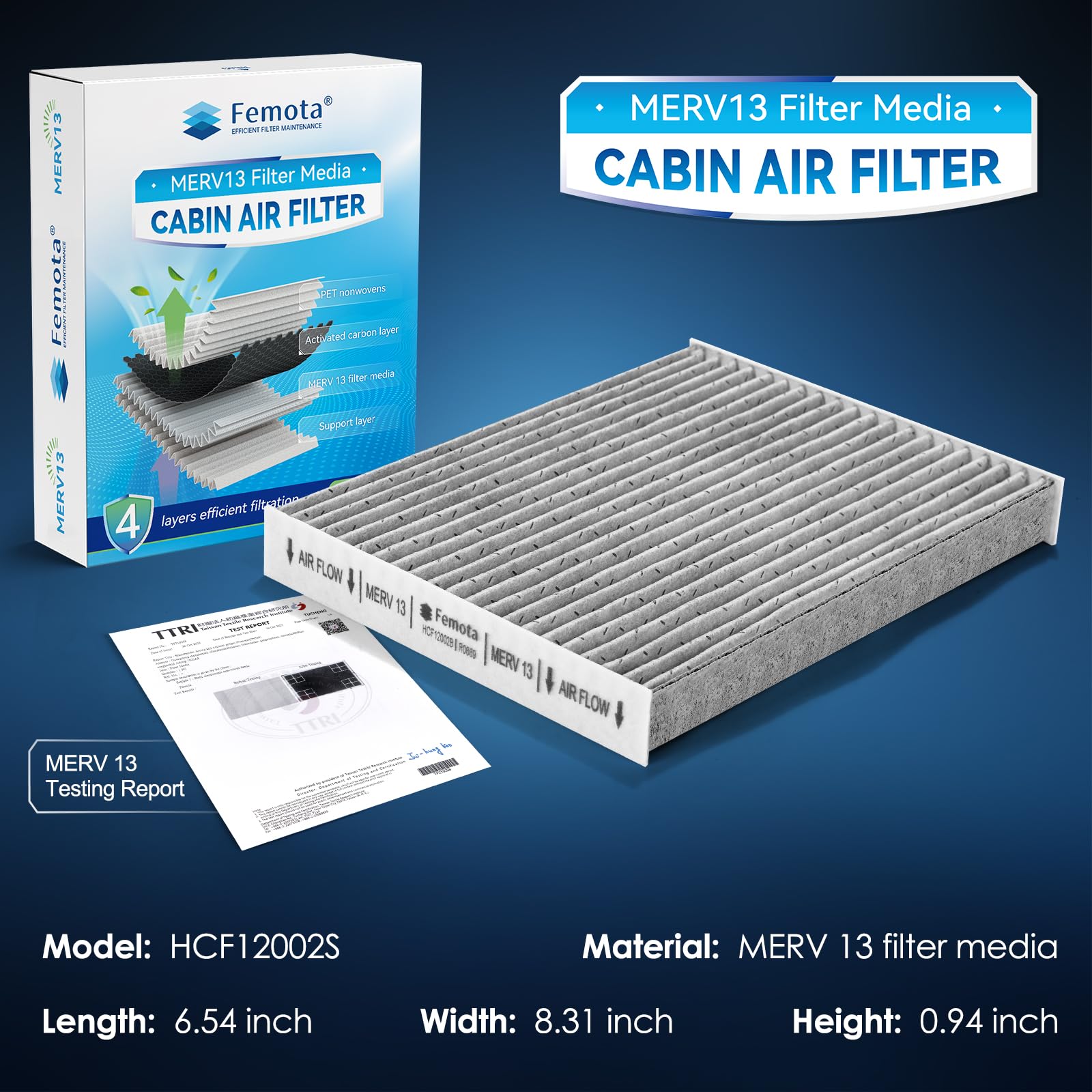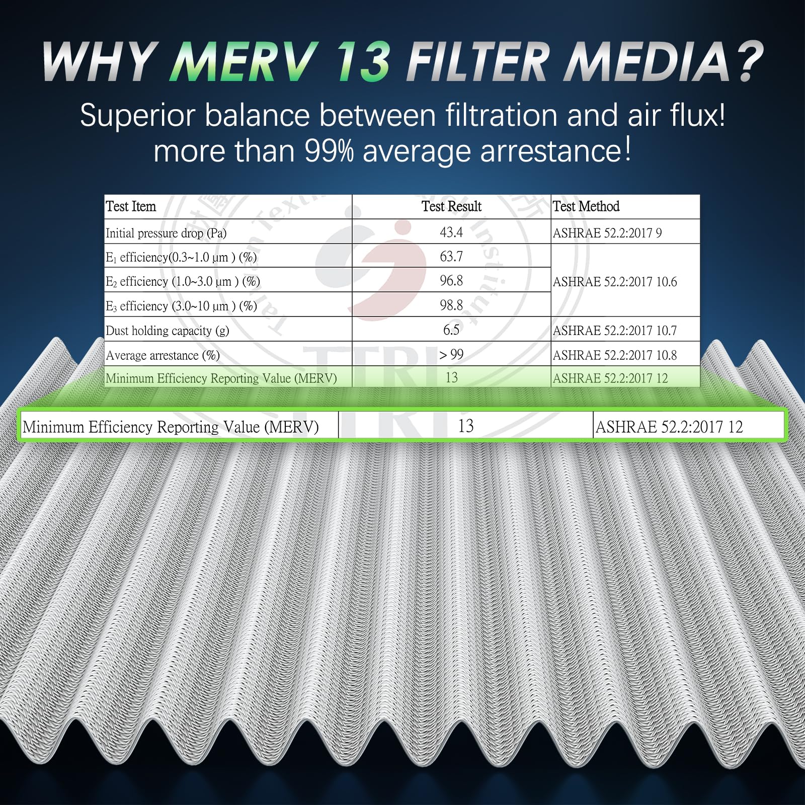 MERV 13 Filter Media: made of tested MERV 13 filter media (ASHRAE52.2:2017 12), offers a superior balance between filtration and air flux, detailed test report included in the package