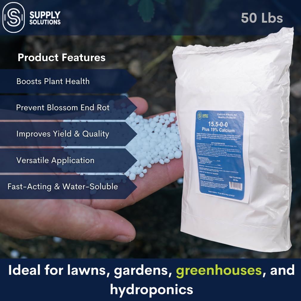 Unlock Your Garden's Full Potential with Supply Solutions Calcium Nitrate! Tired of slow plant growth, weak stems, or the frustration of Blossom End Rot ruining your tomatoes and peppers? Supply Solutions Calcium Nitrate (15.5-0-0 + 19% Calcium) is the fast-acting, professional-grade solution you need for healthier plants and abundant, high-quality harvests! Why Calcium and Nitrate Nitrogen Are Critical: Our expertly formulated fertilizer provides two essential nutrients in a readily available form plants crave: Nitrate Nitrogen (14.5%): Fuels rapid vegetative growth, promoting lush, green leaves and strong stem development for overall plant vigor. Water-Soluble Calcium (19%): The crucial building block for strong cell walls. It enhances plant structure, prevents calcium-related disorders like Blossom End Rot, improves fruit firmness, and contributes to longer shelf life. Unlock These Key Benefits for Your Plants: ✅ Fast-Acting Formula: See noticeable improvements in plant health and growth speed. ✅ Prevents Blossom End Rot: Directly addresses calcium deficiency, the primary cause of BER in susceptible crops. ✅ Bigger, Stronger Produce: Encourages larger, firmer fruits and vegetables with enhanced quality. ✅ 100% Water Soluble: Dissolves quickly and completely for easy application via sprayers, irrigation, or hydroponics – no clogging! ✅ Versatile Use: Highly effective for a wide range of plants including vegetables, fruits, flowers, trees, and hydroponic systems. ✅ Trusted Quality & Value: Professional-grade formulation in a cost-effective bag from Supply Solutions. Simple Application for Every Gardener: Follow the easy directions on the package for appropriate rates. Use as a: Soil Application: Apply around the base of plants or side-dress during the growing season. Foliar Spray: Mix with water and spray directly onto leaves for rapid nutrient uptake. Fertigation/Hydroponics: An essential, clean-dissolving component for nutrient solutions. Don't settle for subpar results! Elevate your gardening game and harvest the vibrant, healthy, and abundant produce you deserve. Add the Supply Solutions Calcium Nitrate Fertilizer