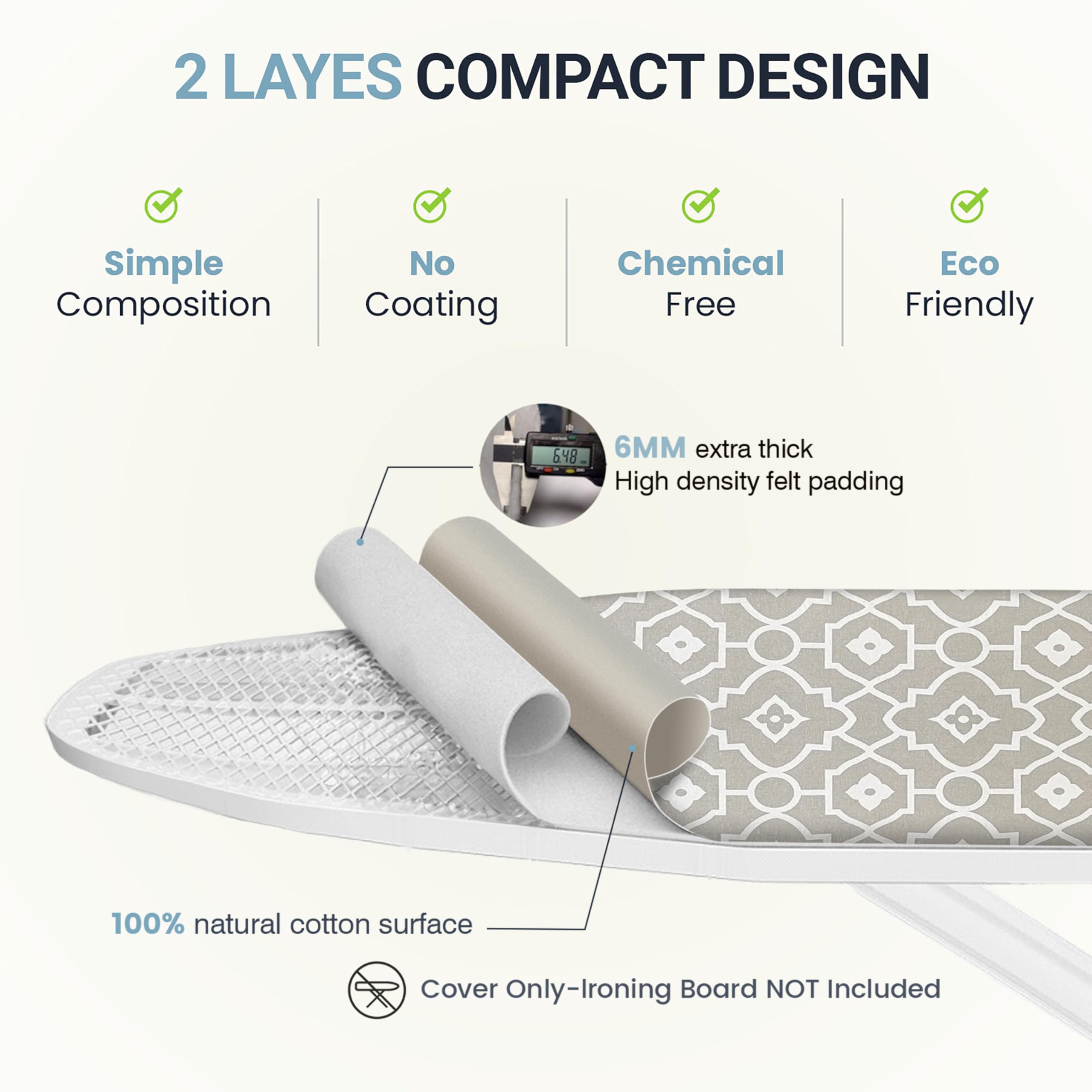 PURE COTTON MATERIAL:UniSimp ironing board covers are made of 100% natural cotton fabric without any coatings, ensuring safe and chemical-free ironing. You can iron your clothes without worrying about unpleasant odors that may affect your health.