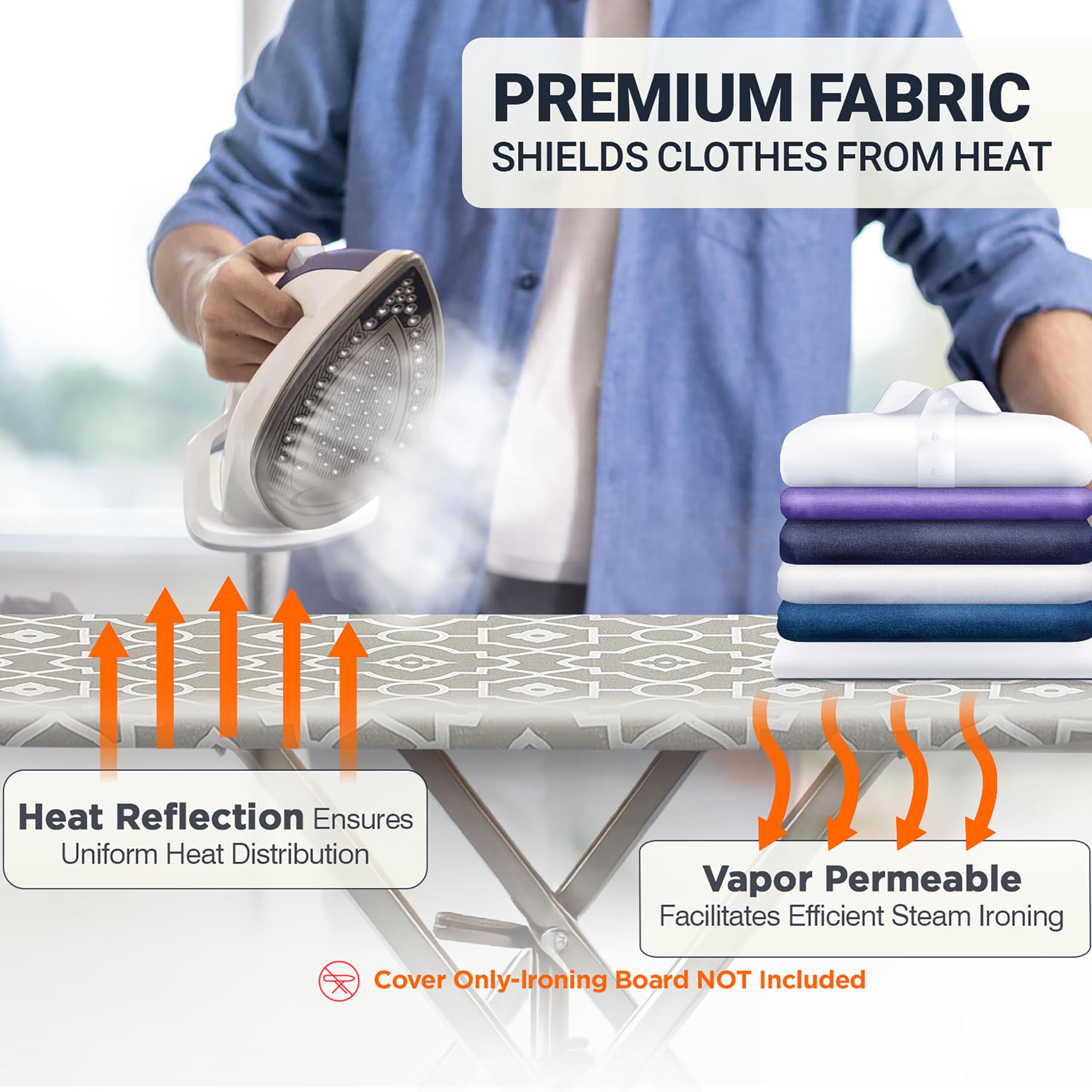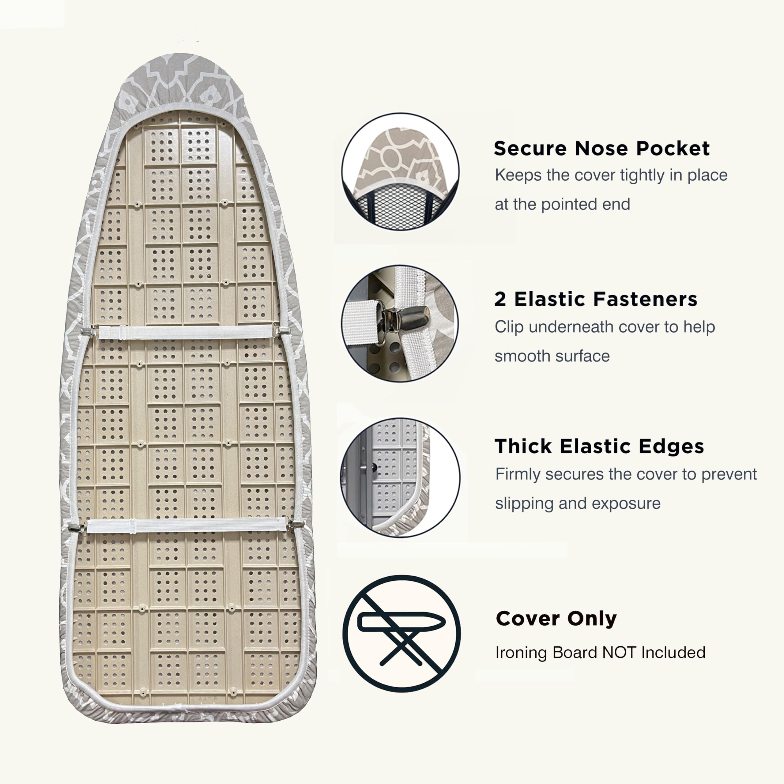 PERFECT FIT, NON-SLIP DESIGN:Elasticized edges and a nose pocket design ensure a snug fit, preventing the ironing board cover from slipping or shifting during use. This design provides a uniform surface without wrinkles or lumps, which helps prevent clothes from catching.