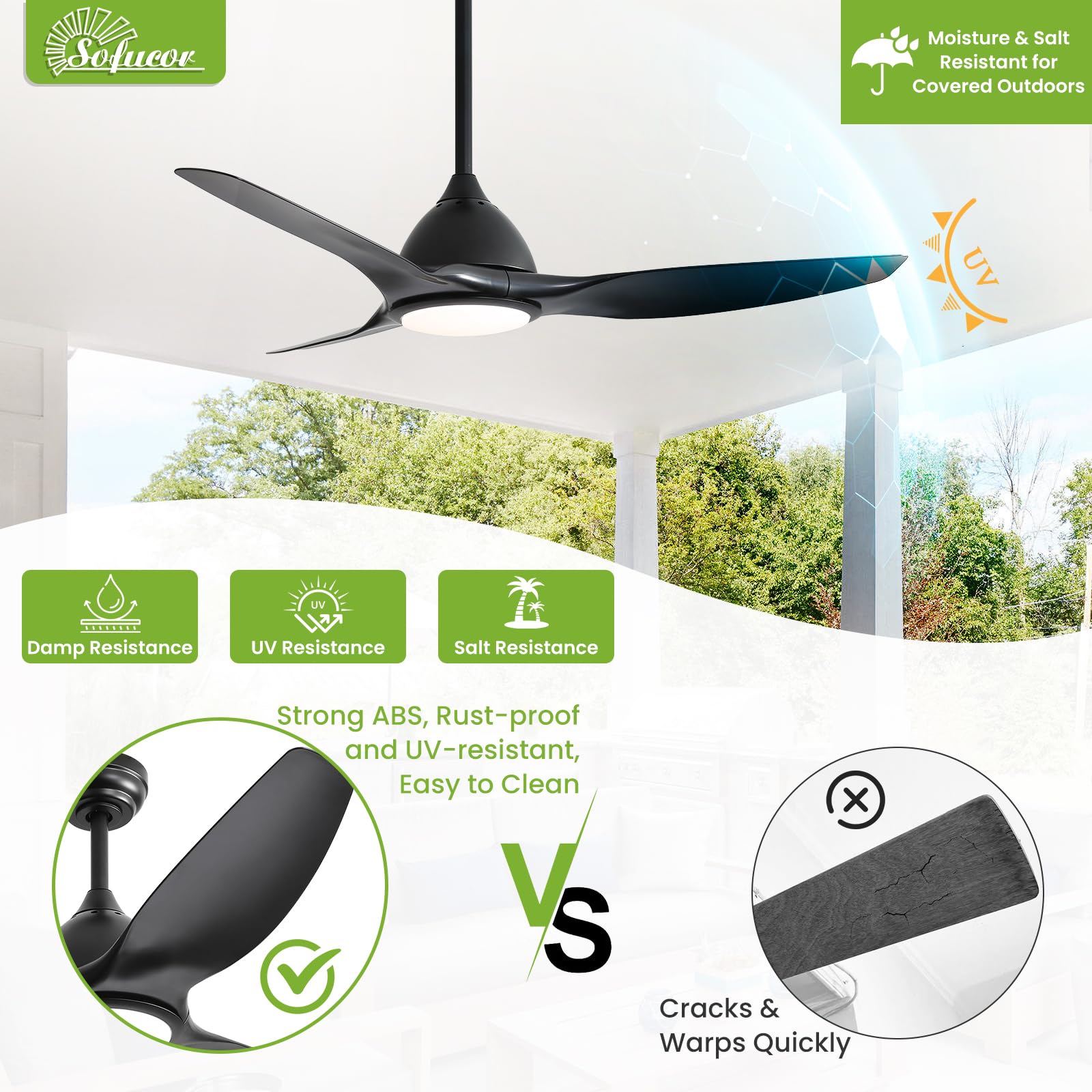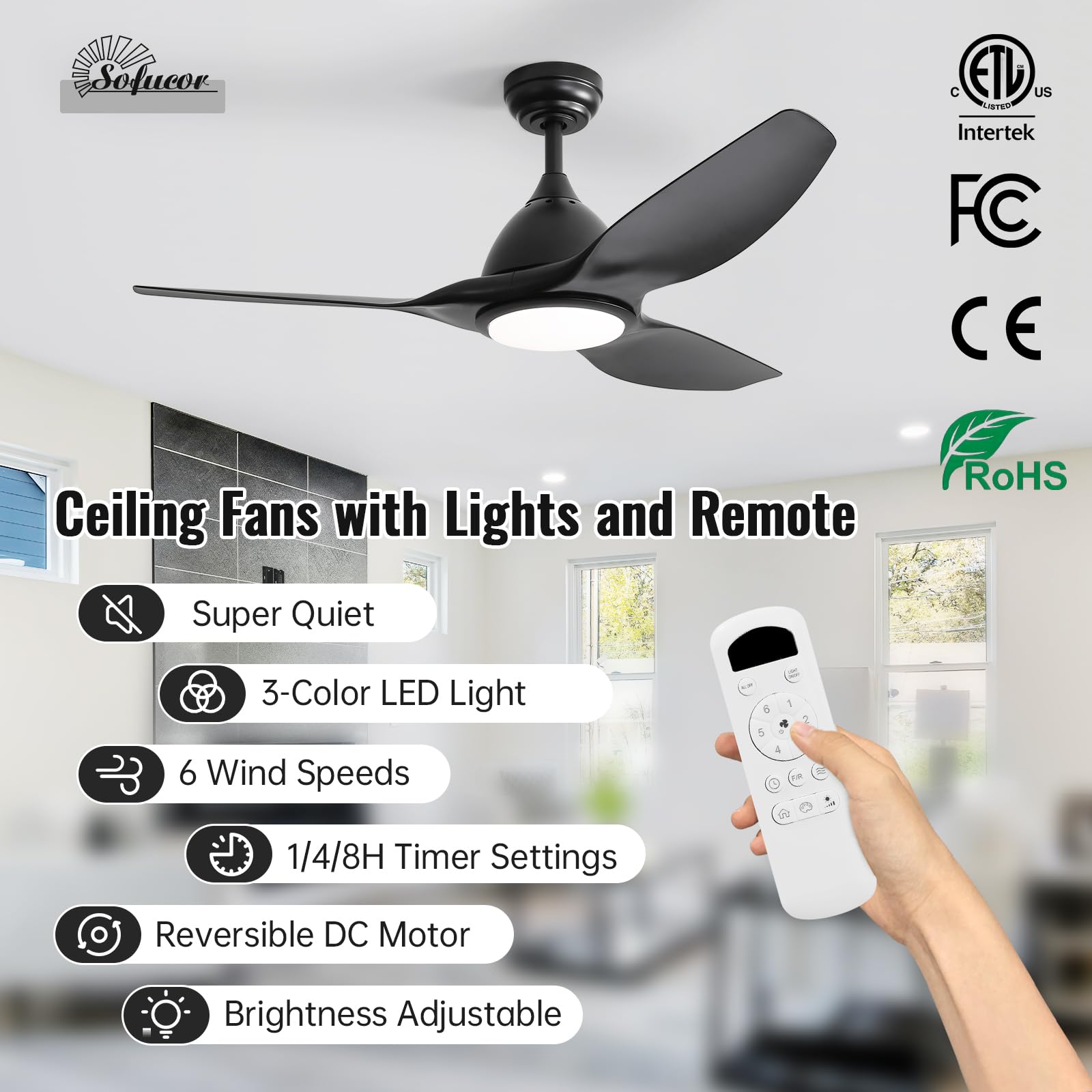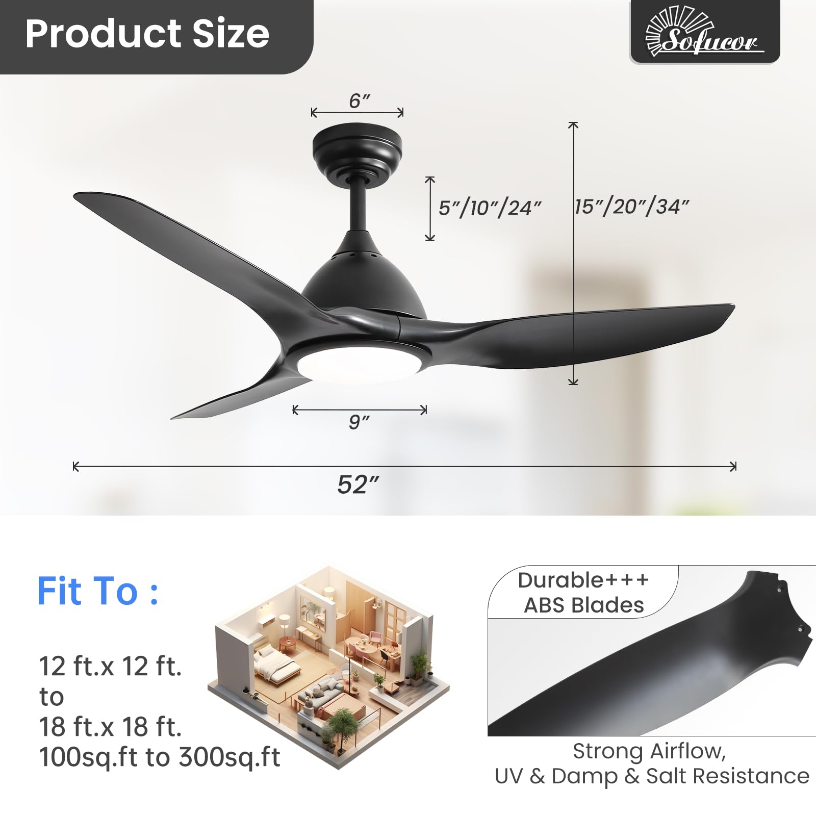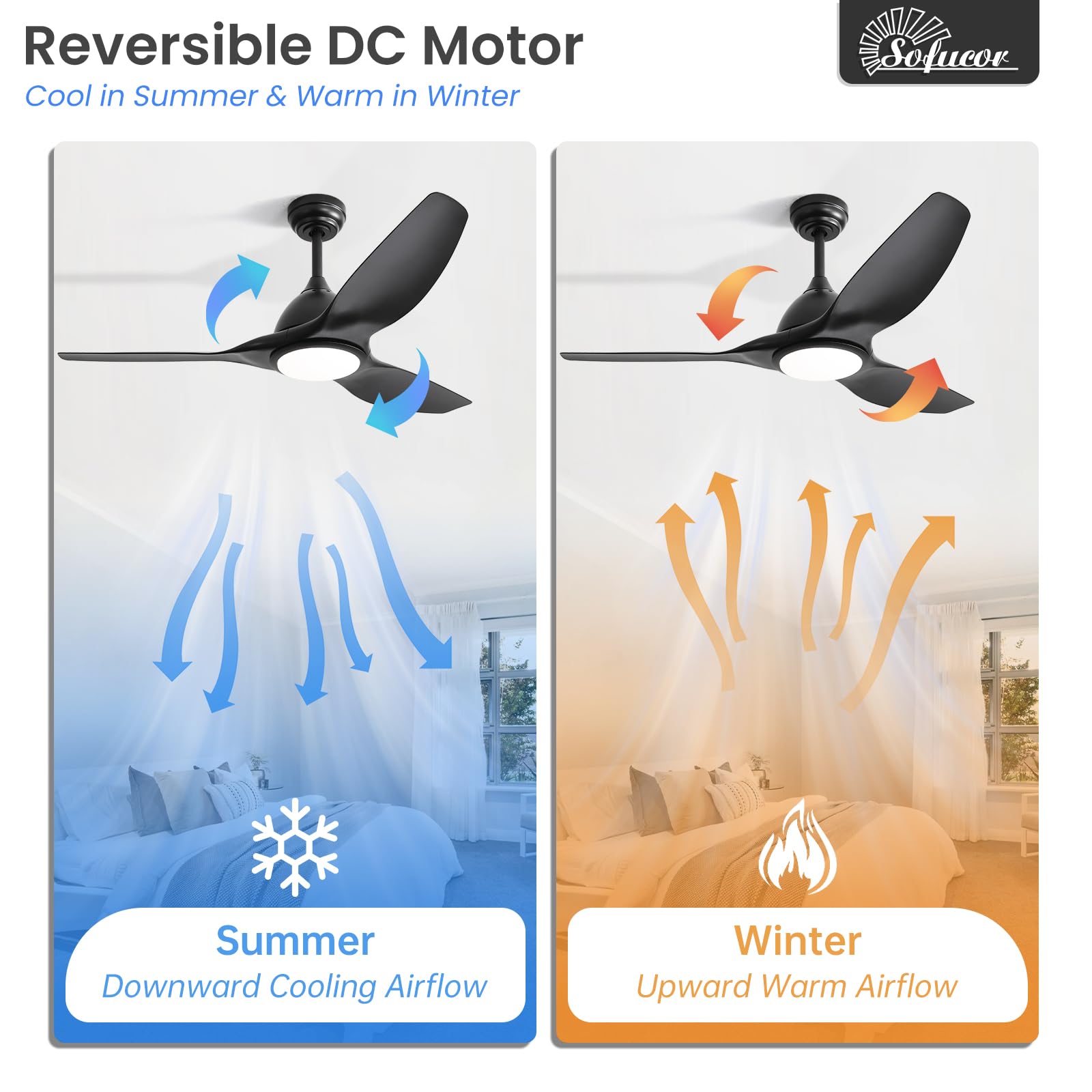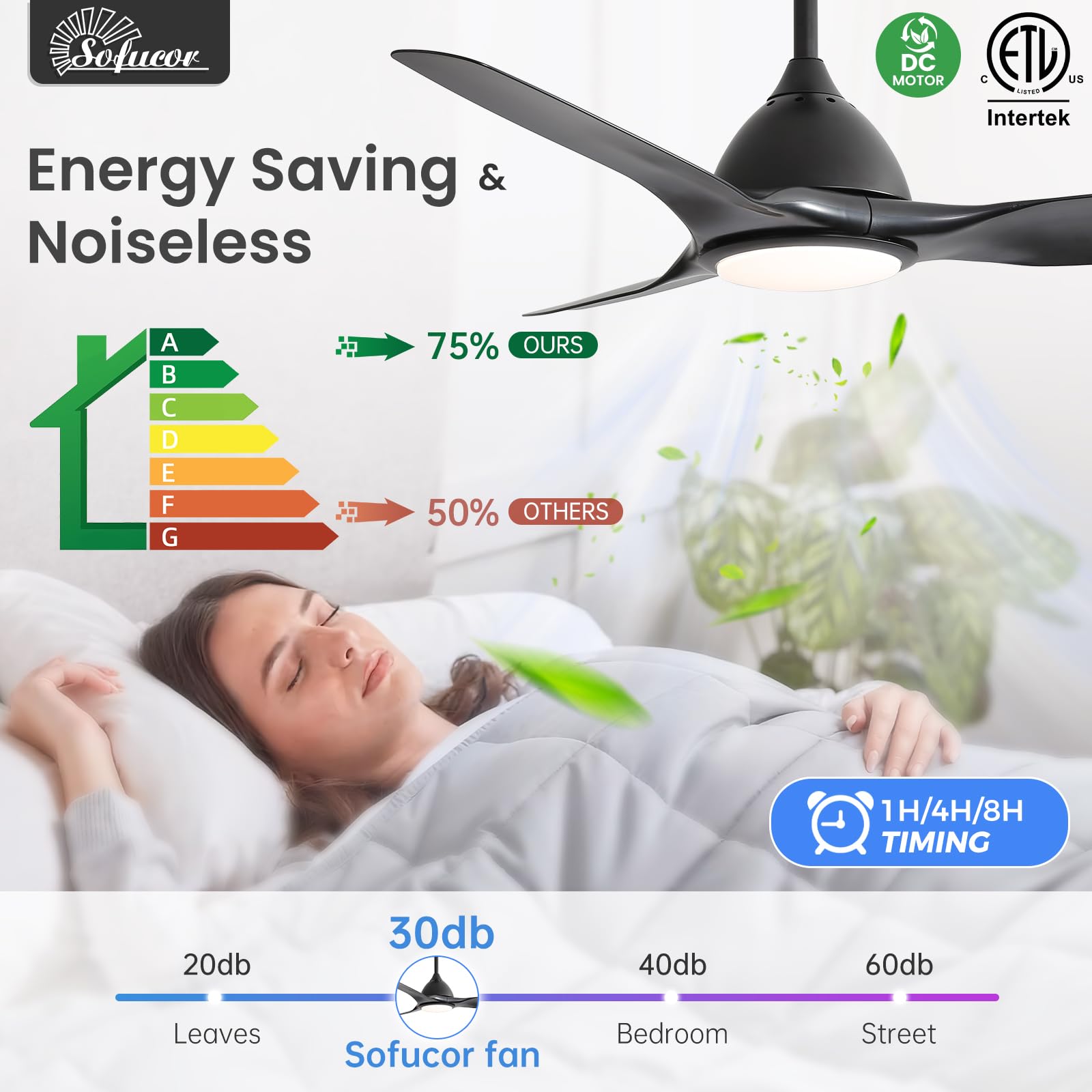 Quiet & Reversible DC Motor: Sofucor black ceiling fan features a cutting-edge DC motor that runs quietly (less 35dB) and saves 70% energy than AC motors. Our 52 inch ceiling fan with light features reverse airflow for both summer and winter use!