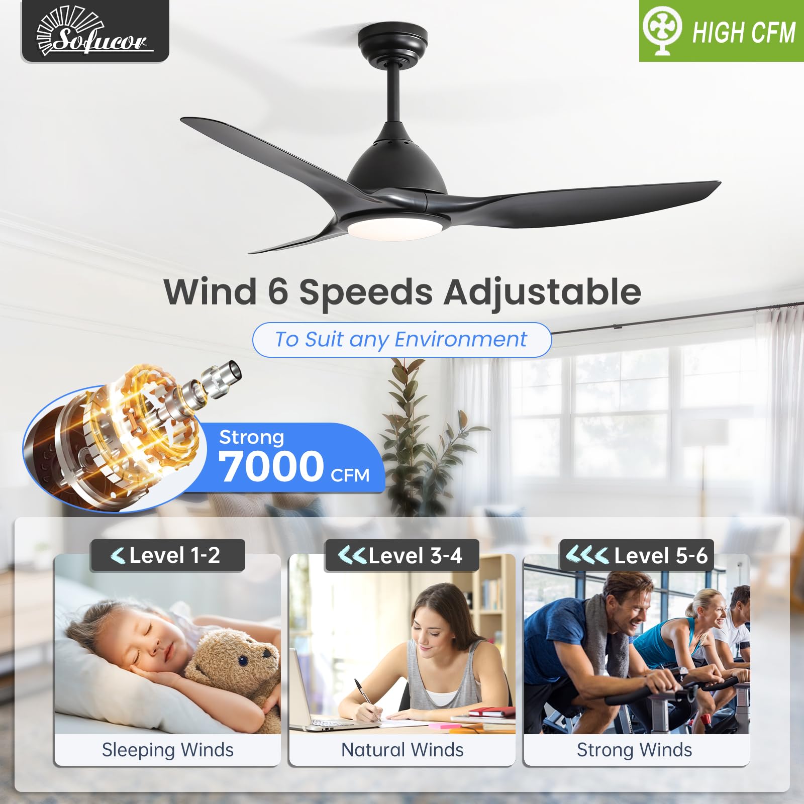 7000CFM Strong Airflow & Adjustable Speed: Sofucor living room ceiling fan has a maximum airflow of 7000 CFM — surpassing 70% of other ceiling fans. With 6 adjustable speeds ranging from soft to strong airflow to meet both indoor and outdoor needs.