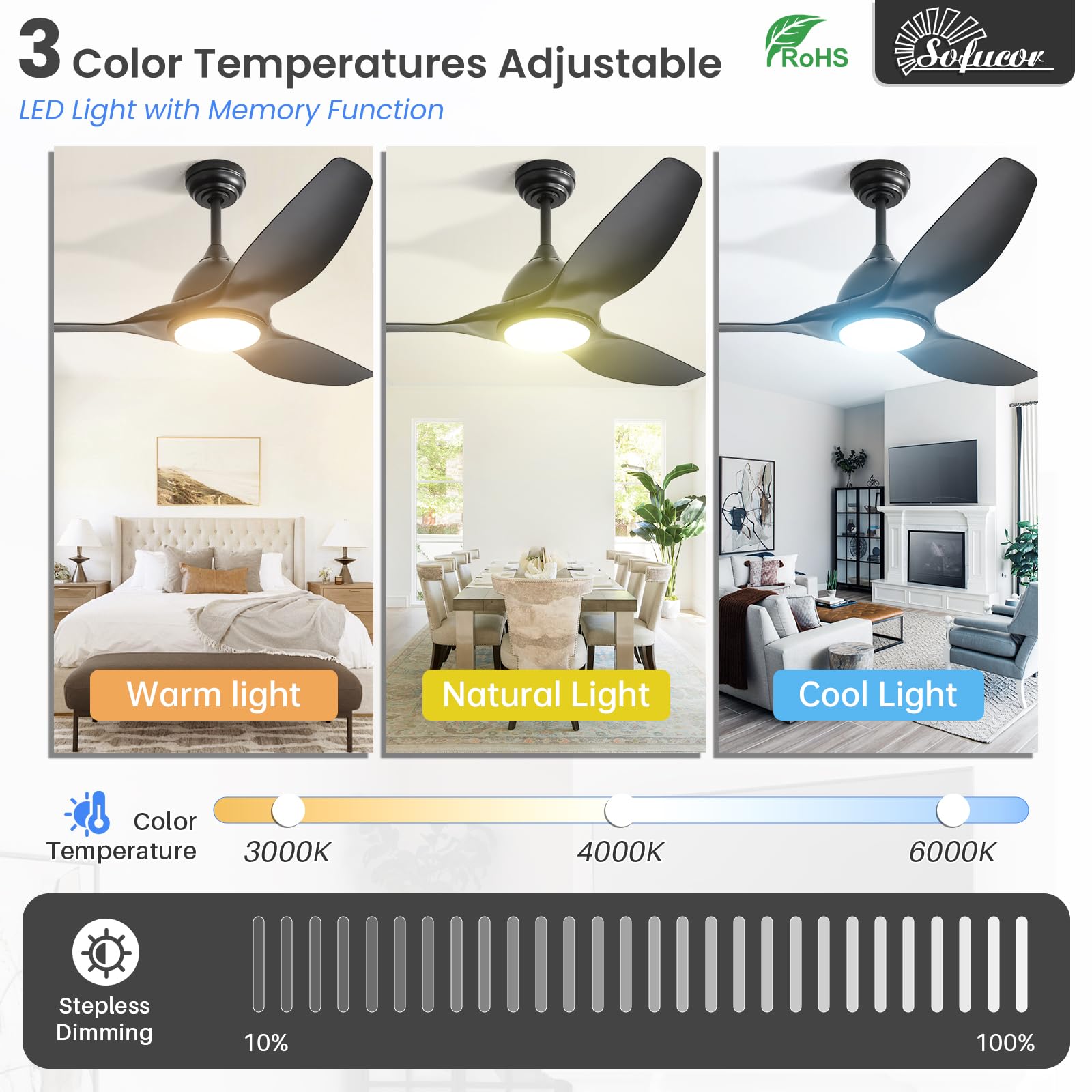 3 Light Colors & Memory Function: Sofucor LED ceiling fan features a 22W LED light with 3 color temperatures: 3000/4000/6000K and 10%-100% brightness adjustment to relieve your eye fatigue. Perfect for studyroom bedrooms and living rooms!