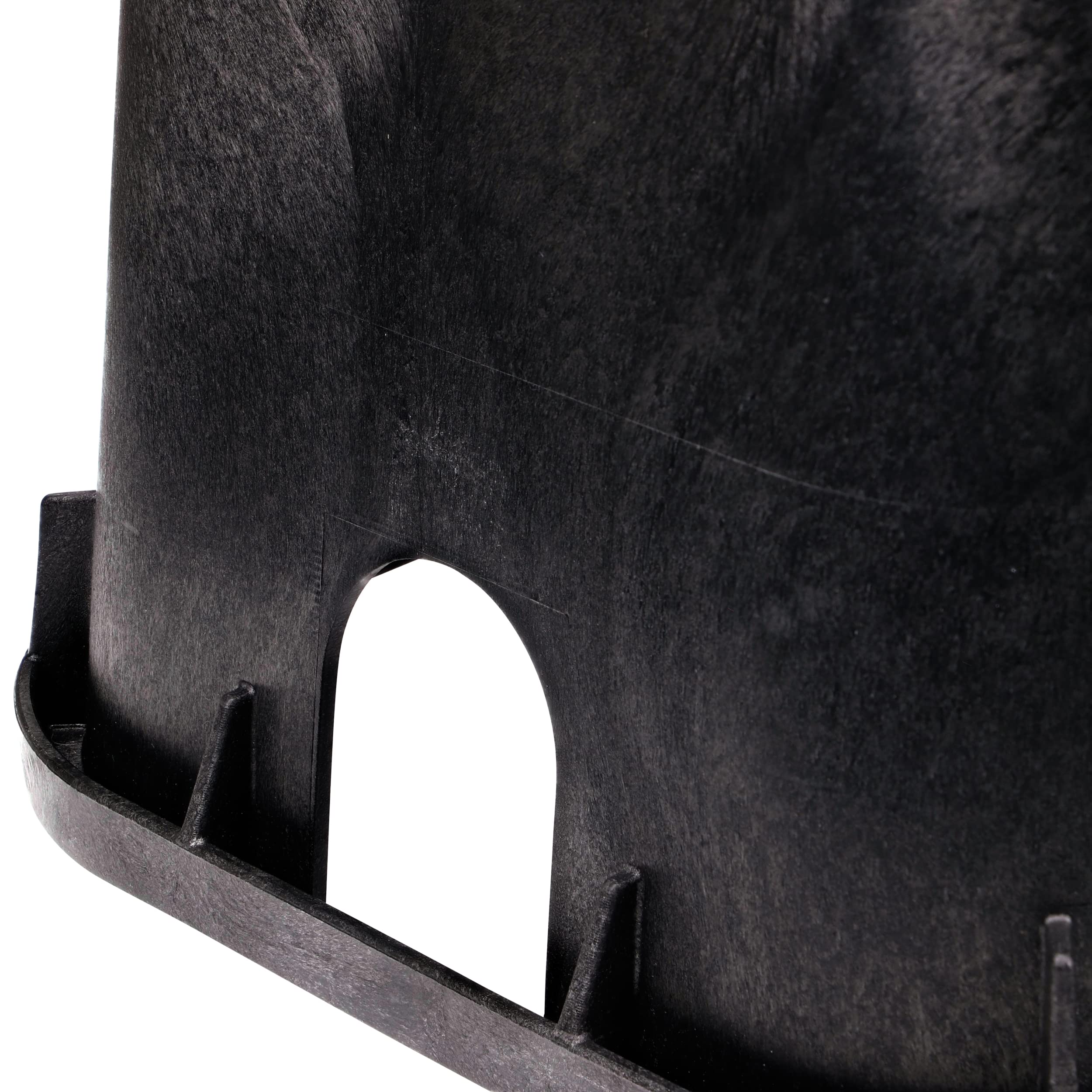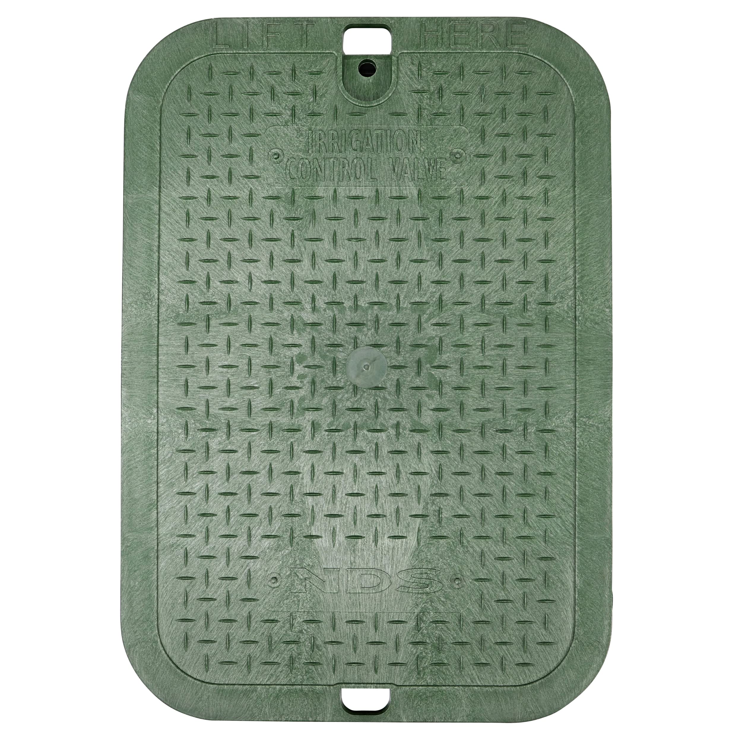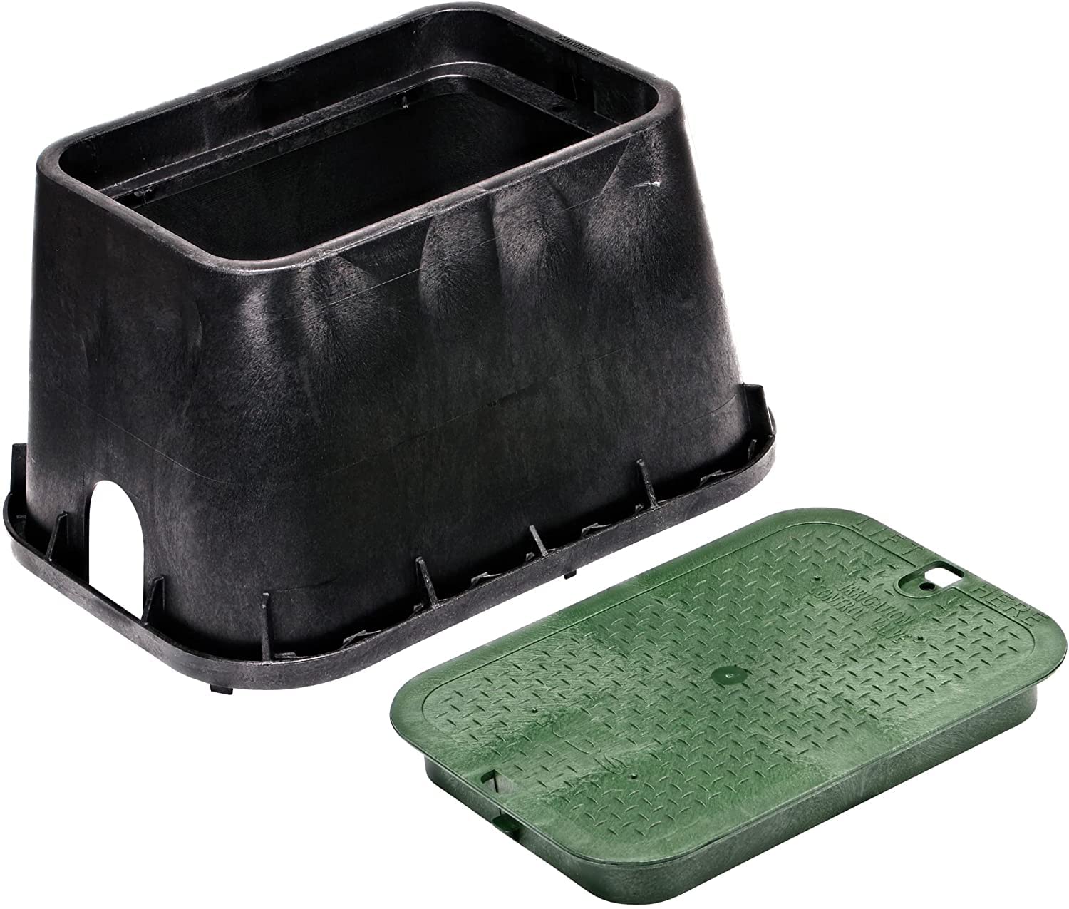 Give your irrigation system components a clean and secure environment with the 14 in. X 19 in. Valve Box and Cover. This durable enclosure fits over valves, control zone kits, and other irrigation fixtures to protect against the elements, pedestrian traffic, lawncare equipment, and potential vandalism, enabling easy access for maintenance as needed. Durably constructed, the black irrigation valve box and green lid are engineered with structural reinforcing ribs for added support. The cut-out pipe hole makes it easier to connect irrigation pipe without having to dig under the box. The overlapping lid blocks dirt and debris from getting into the box and is marked for Irrigation Control Valve (ICV) use. Convenient slot makes lid easy to lift with a flathead screwdriver. Valve box is made of polypropylene (PP) using 100% recycled materials; cover is also made of PP using a combination of virgin and recycled materials. Both box and lid are treated with UV inhibitors to prevent fading and cracking from sun exposure.