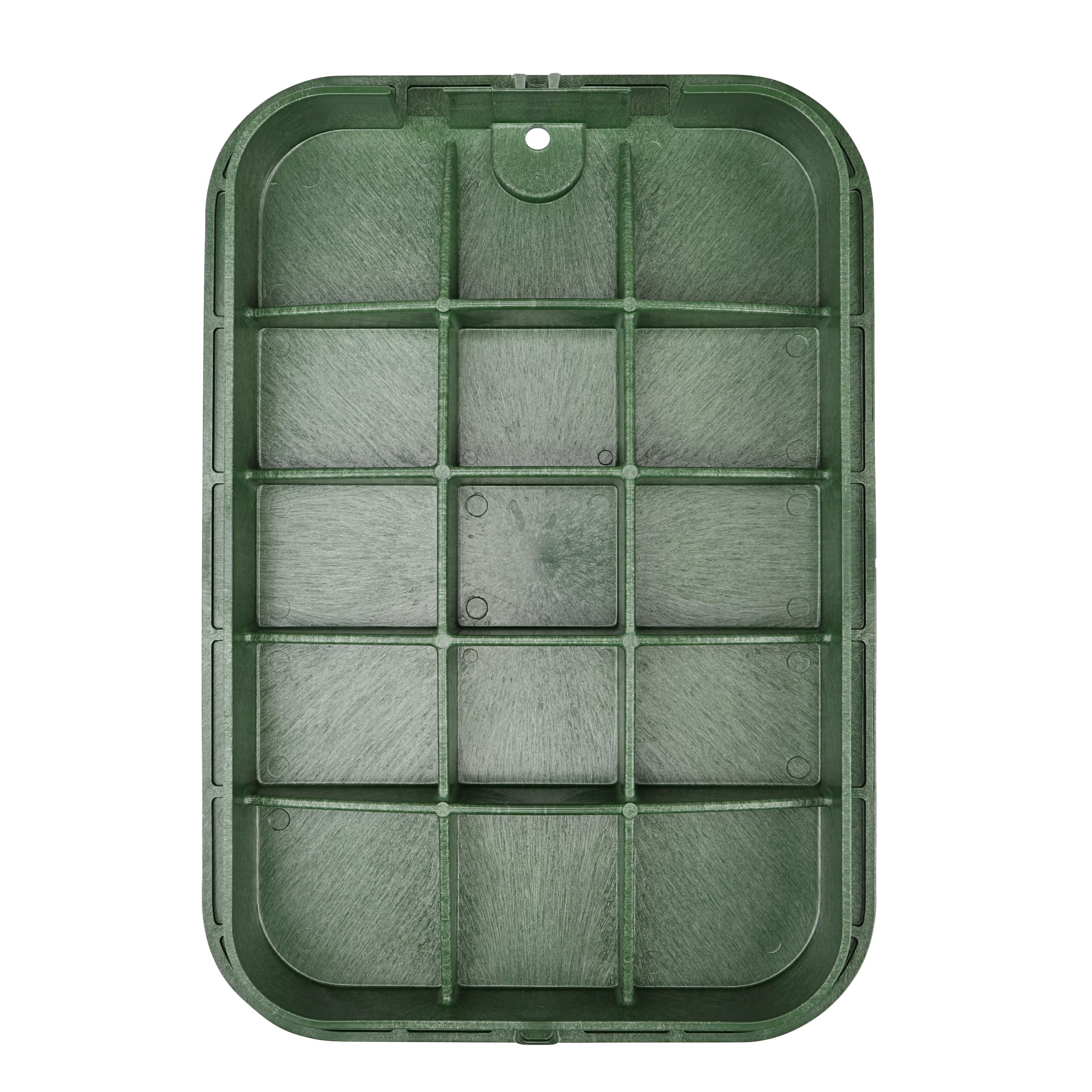STANDARD VALVE BOX WITH GREEN COVER – Protects irrigation control valves; supports pedestrian and lawn equipment loads. Box: 12 in. H, top ID 10 in. x 15 in., bottom ID 15 in. x 20 in. Lid: 11-5/8 in. x 16-13/16 in. Black box, green overlapping cover