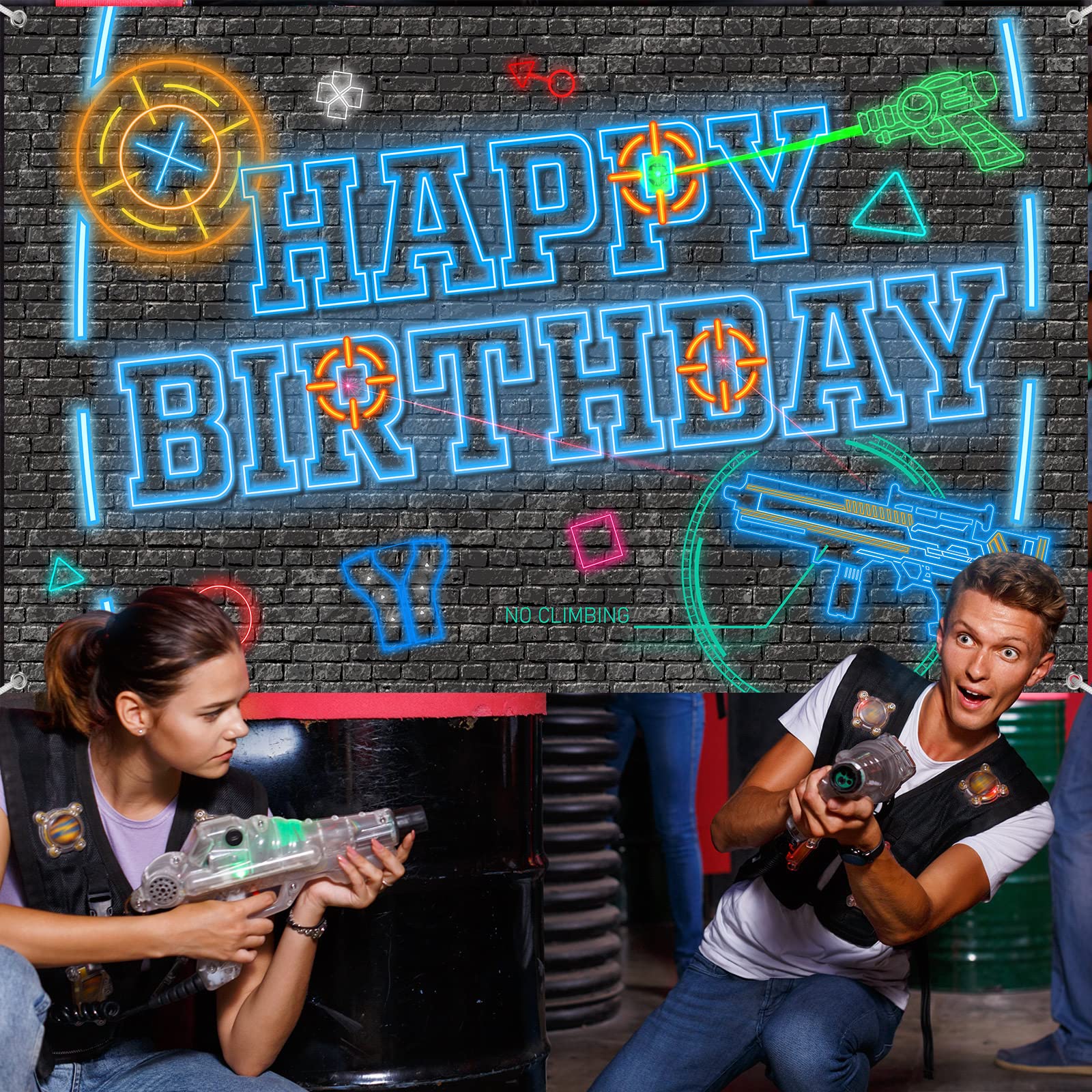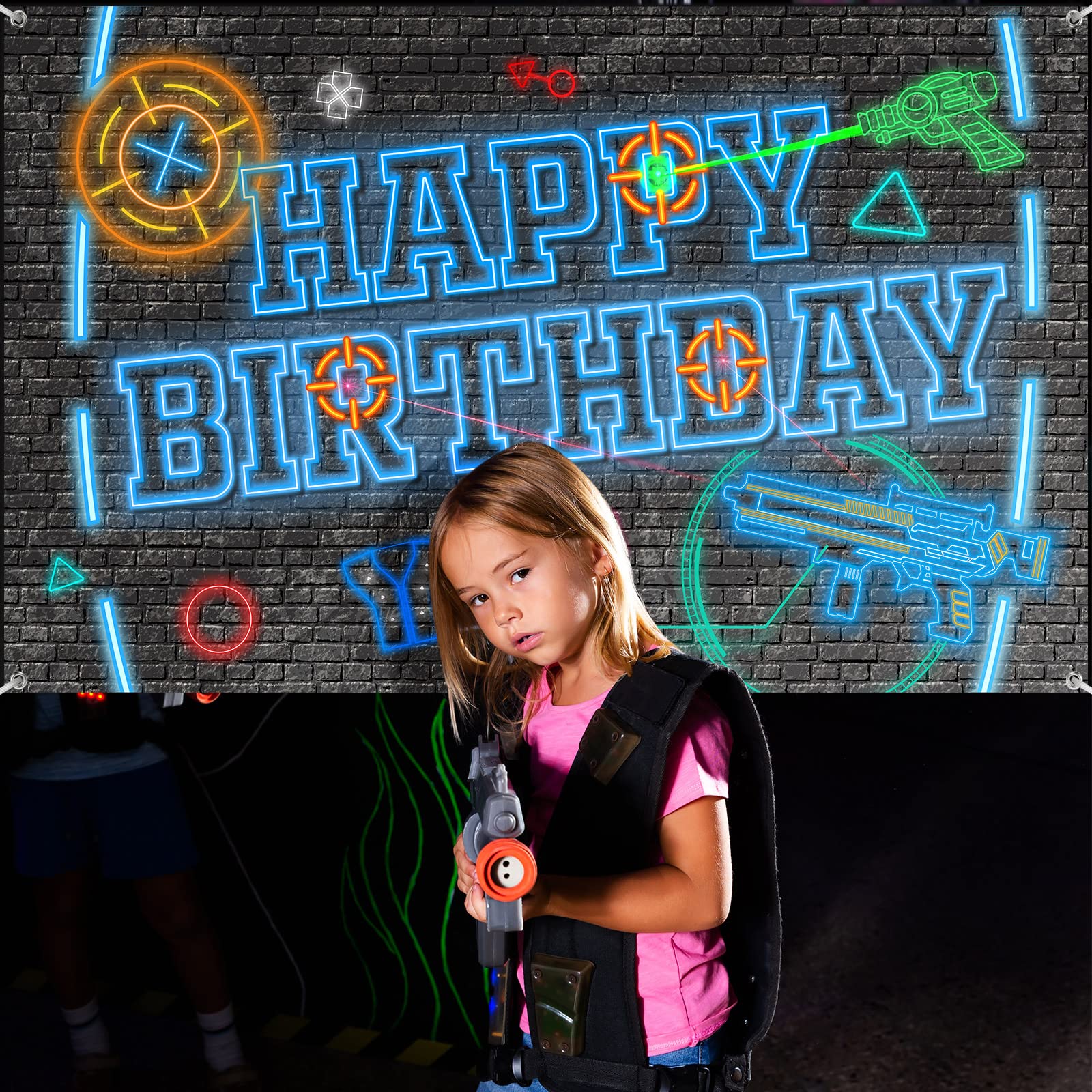 Features: Design: The laser tag game banner backdrop adopts game elements, such as happy birthday words, laser tag, laser gun, no climbing and so on, creating a vivid neon glow party background, and leaving an unforgettable neon glow party experience for your family members. Sweet presents for loved people: You can use the colorful photo backdrop as a present for your family members, or to help your friends and family to decorate laser gun parties, as a way of saving their time on laser gun game party preparations. Specifications: Main material: polyester fabric Color: as pictures shown Size: Backdrop: approx. 182 x 110 cm/ 6 x 3.6 feet Rope: approx. 4 m/ 13 feet Package includes: 1 x Neon laser tag gun Backdrop 1 Roll of rope Warm notes: Manual measurement, please allow slight errors on size. The color may exist a slight difference due to different screen displays.