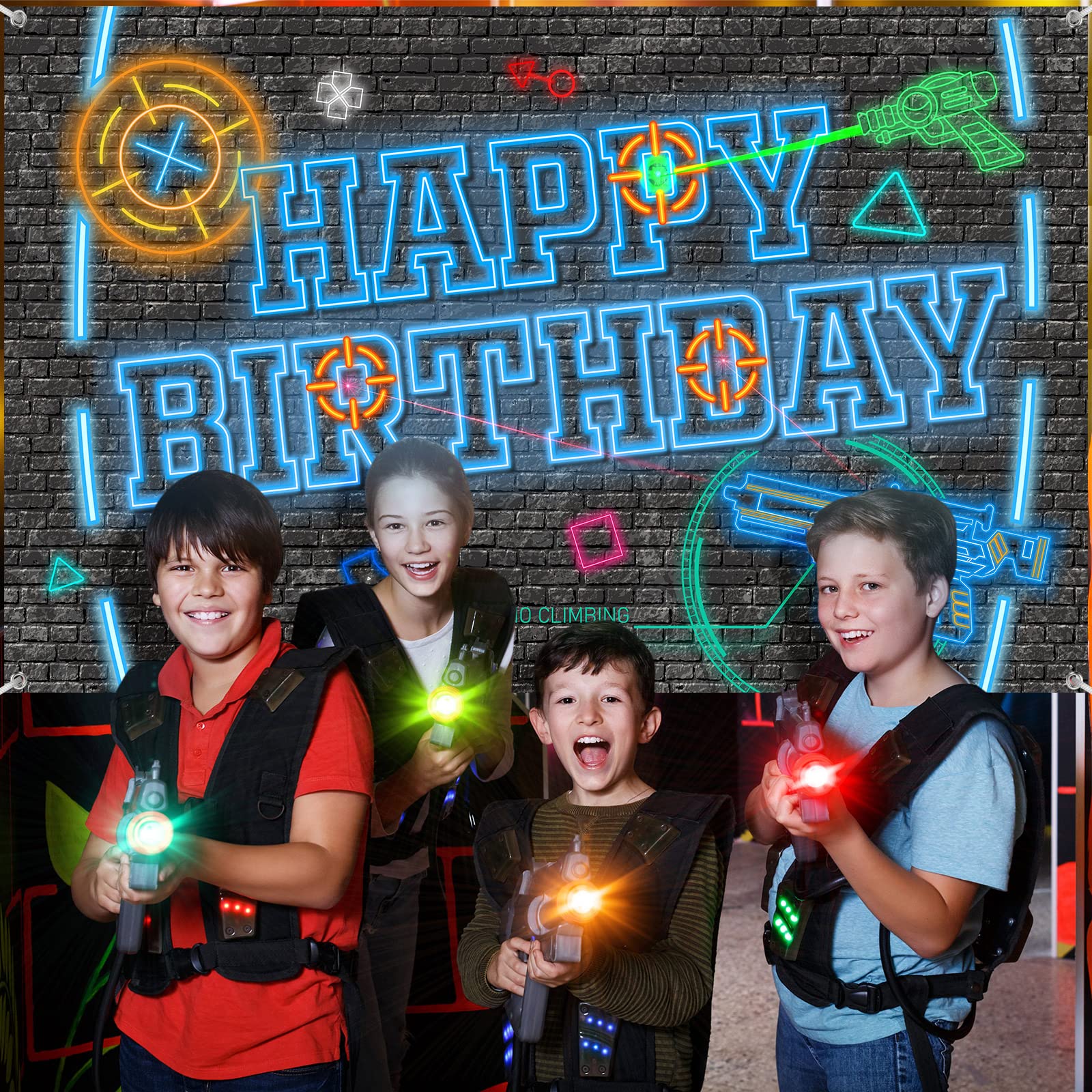 Neon Happy Birthday Banner: you will receive 1 piece of laser tag gun happy birthday backdrop with 1 roll of rope, suitable for your happy birthday party decoration use, bringing you nice use experiences