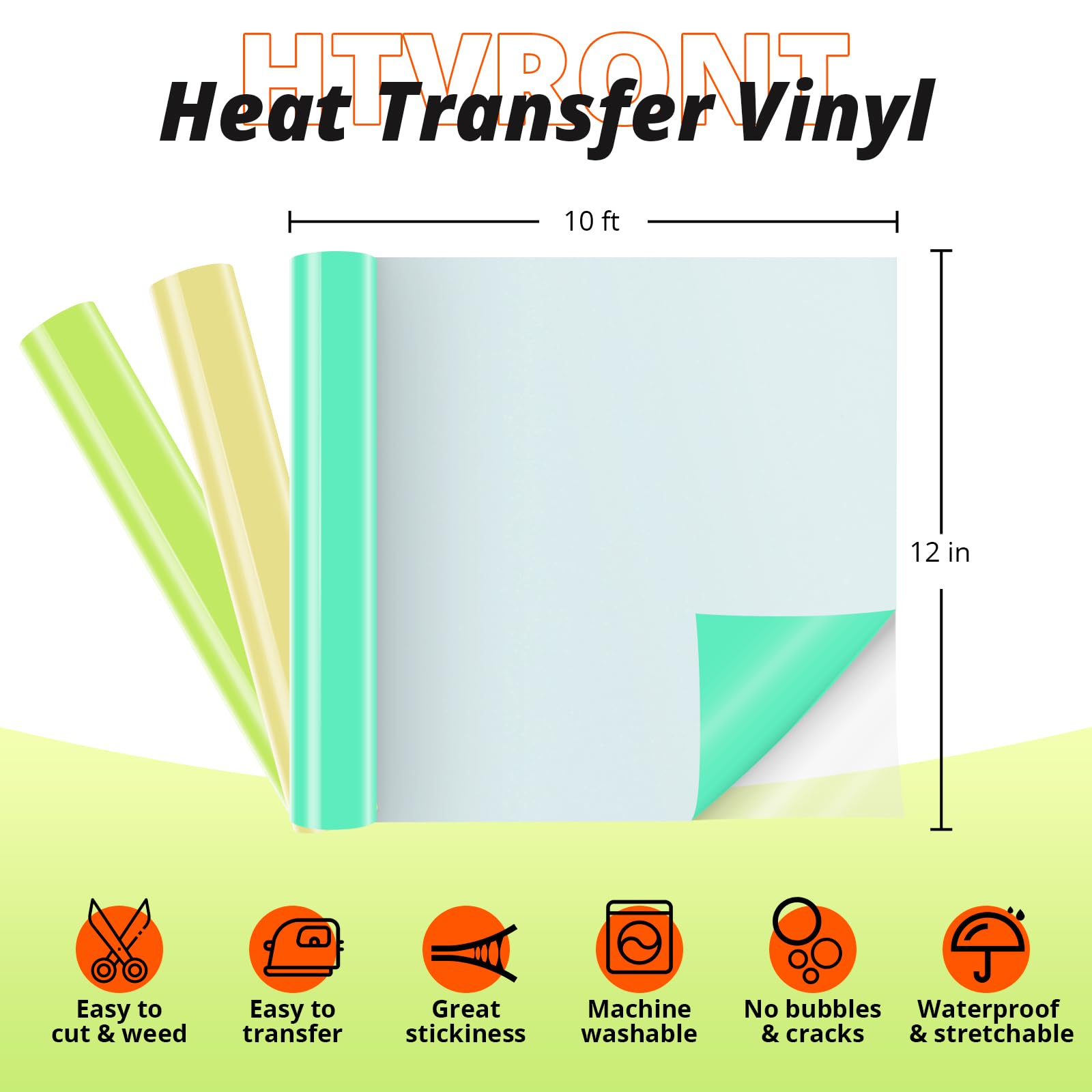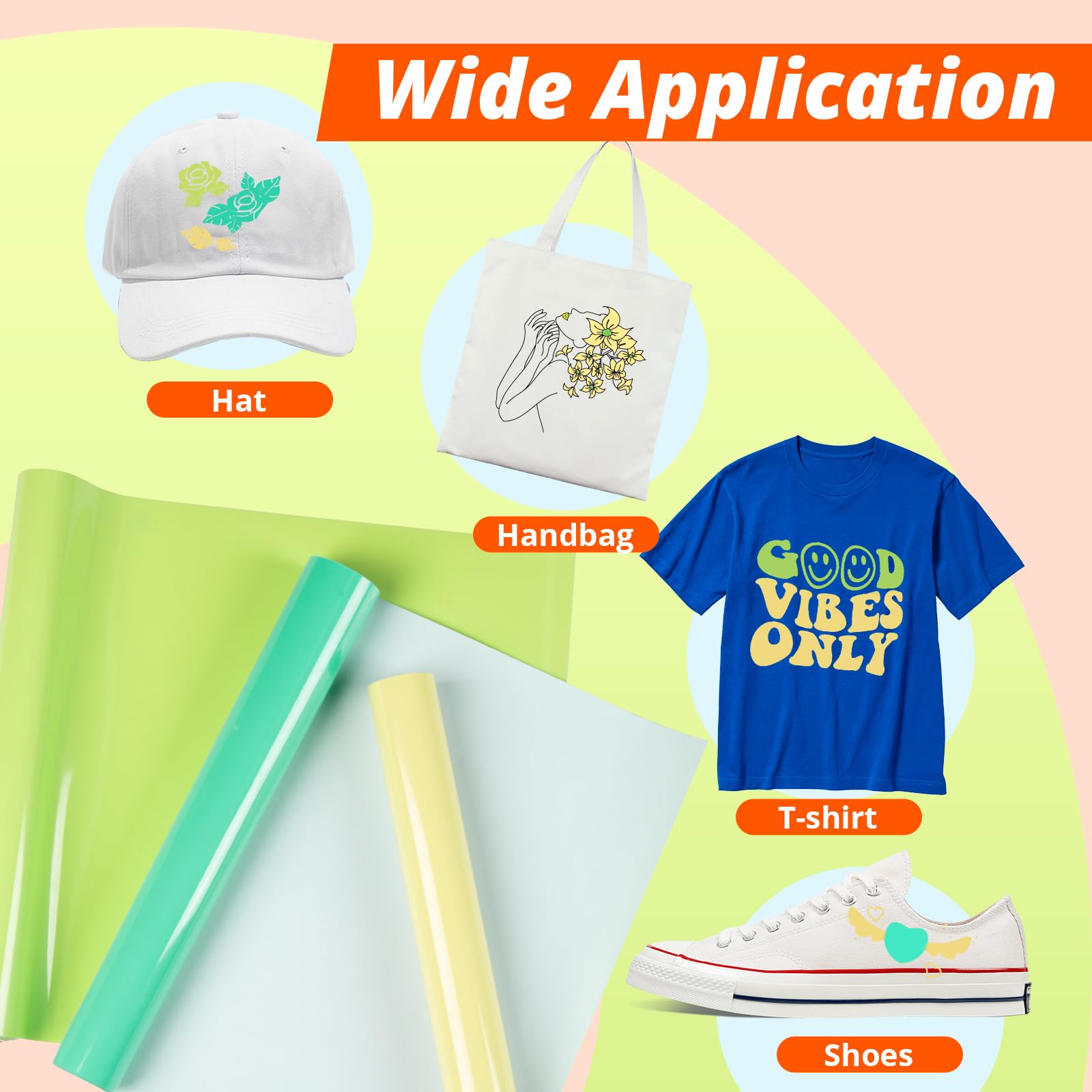 【SAFE HEAT TRANSFER VINYL】:The perfect size of our lime green htv is 12"" x 10ft which is suitable for beginners and creators. Our lime green heat transfer vinyl is made of soft PU material, which is lighter and thinner. The heat transfer vinyl fits clothes more closely, and does not deform when pulling. SGS certified material, friendly and safe to wear. Just make sure childs have adult supervision when it’s time to iron the designs