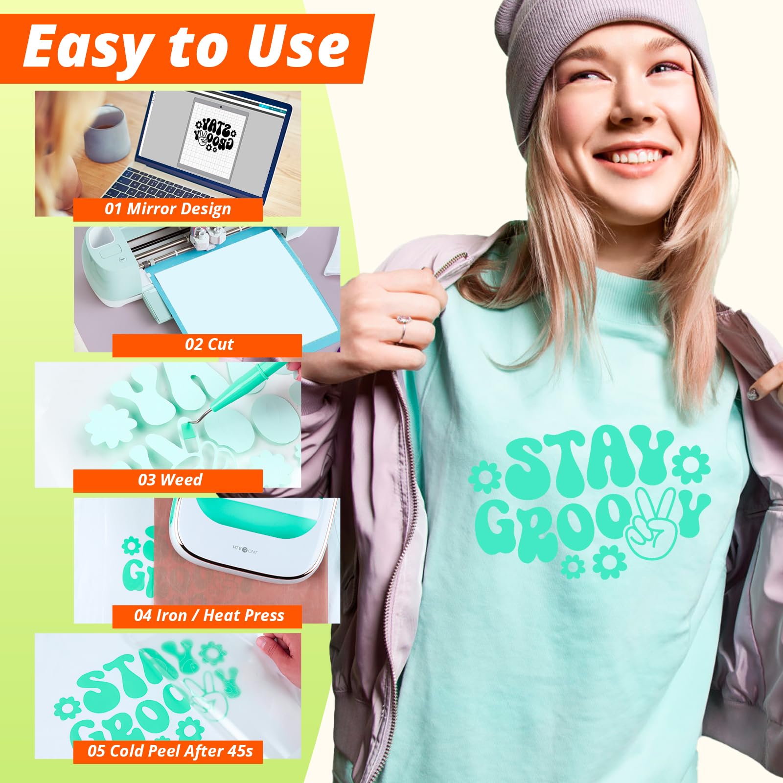 【EASY TO WEED & CUT】:Our high-quality lime green htv is easy to cut, weed and transfer.The lime green heat transfer vinyl will save your time on figuring out the cutting side and the image you cut,which is compatible with most cutting machines. You could follow the steps to set the parameters to achieve precise cutting and ironing. Our lime green iron on vinyl is temperature, pressure sensitive and can be easily torn off once the design is transferred to the fabric