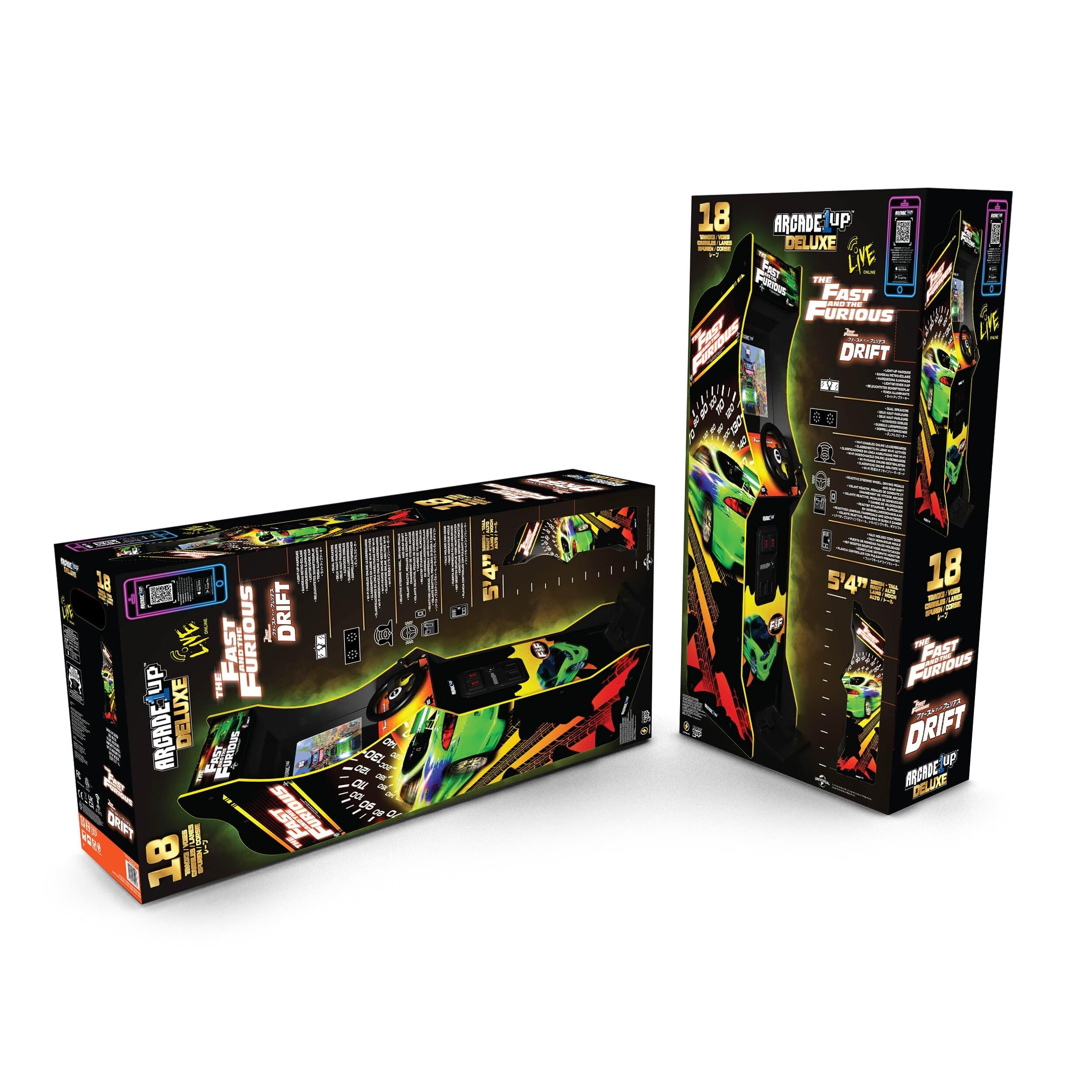 Introducing The Fast & The Furious Deluxe Arcade Game Machine from Arcade1up! This exciting arcade machine is perfect for any The Fast & The Furious fan. With its authentic arcade - style design and gameplay, this machine will transport you straight into the fast - paced world of street racing and high - speed car chases. In a first for Arcade1up, you can link up to 4 The Fast & The Furious Deluxe Arcade Ga me Machine through local network to create the ultimate arcade setup! (*cabinets need to be connected on the same local area network and will not connect over the internet.) The machine includes a 17 - inch LCD screen, Light - Up Marquee, 4 - Position Gear Shift , Rumble Wheel and Wi - Fi Leaderboards. Order The Fast & The Furious Deluxe Arcade Game Machine today and experience the thrill of this blockbuster saga like never before!