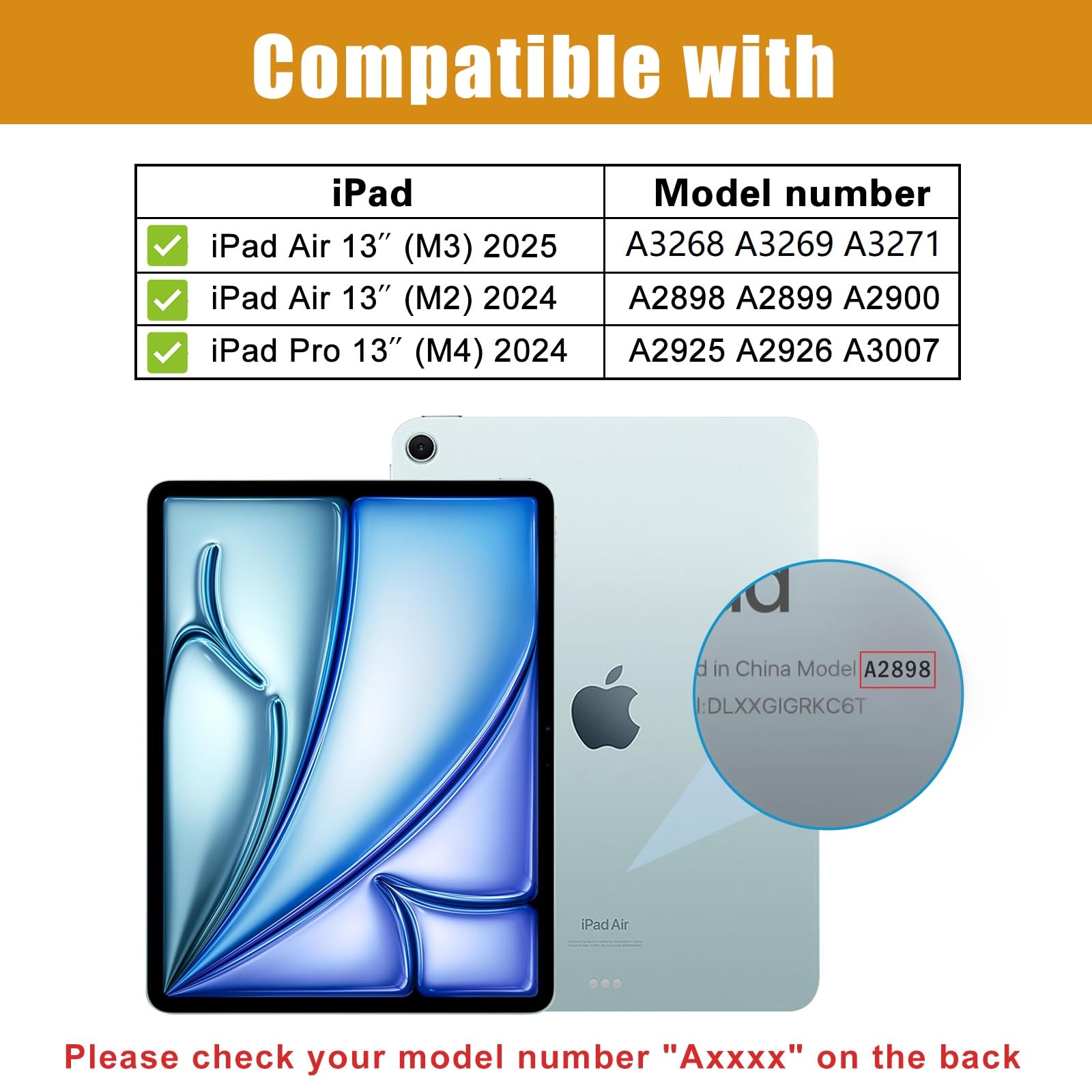 2 pack quality tempered glass screen protector exclusively designed for iPad Pro 13 Inch(M4) 2024 (Model:A2925/A2926/A3007)//iPad Air 13-inch (M3) 2025(Model: A3268/A3269/A3271 )/iPad Air 13 Inch (M2) 2024(Model: A2898/A2899/A2900). Please check back bottom of your iPad to find the model number "Axxxx".