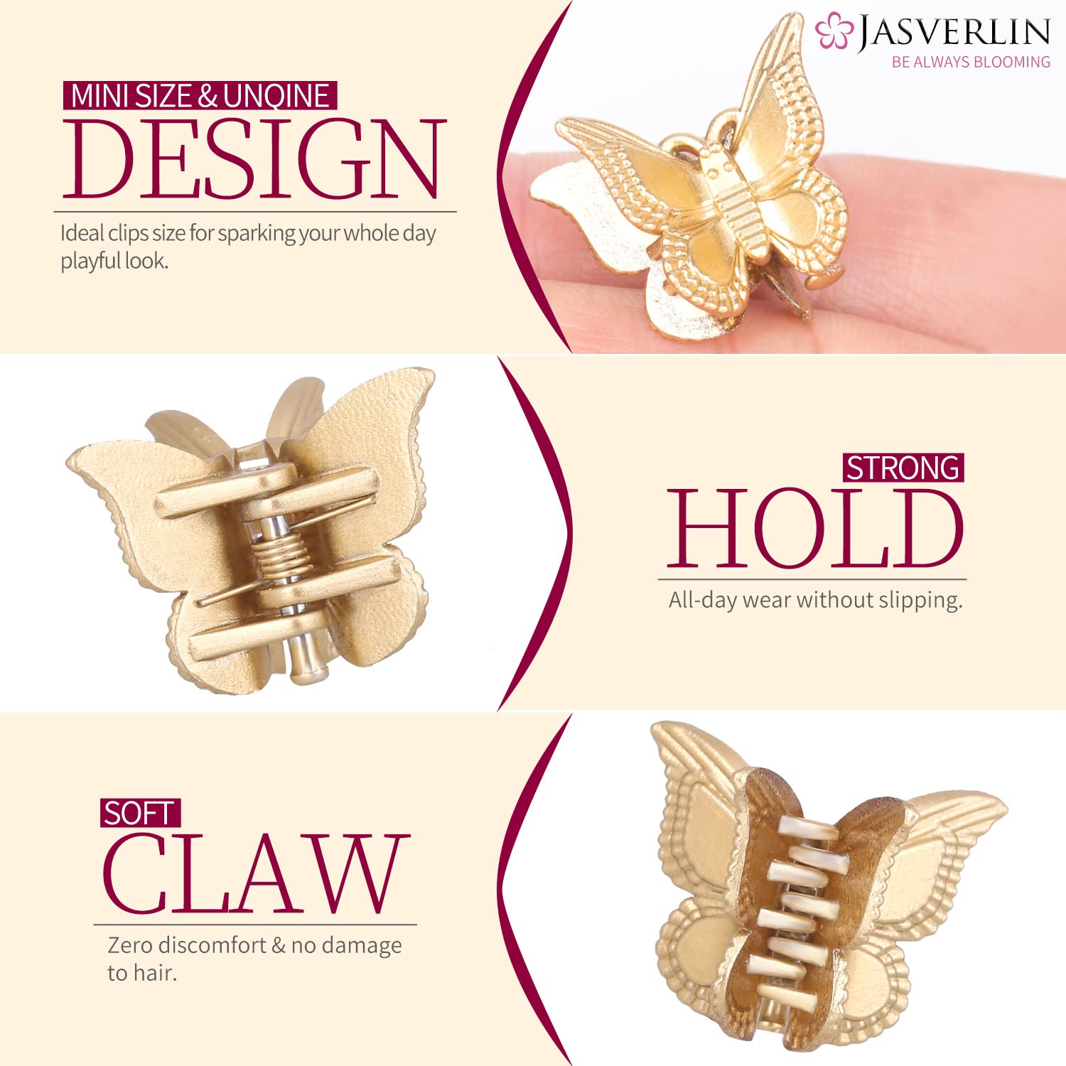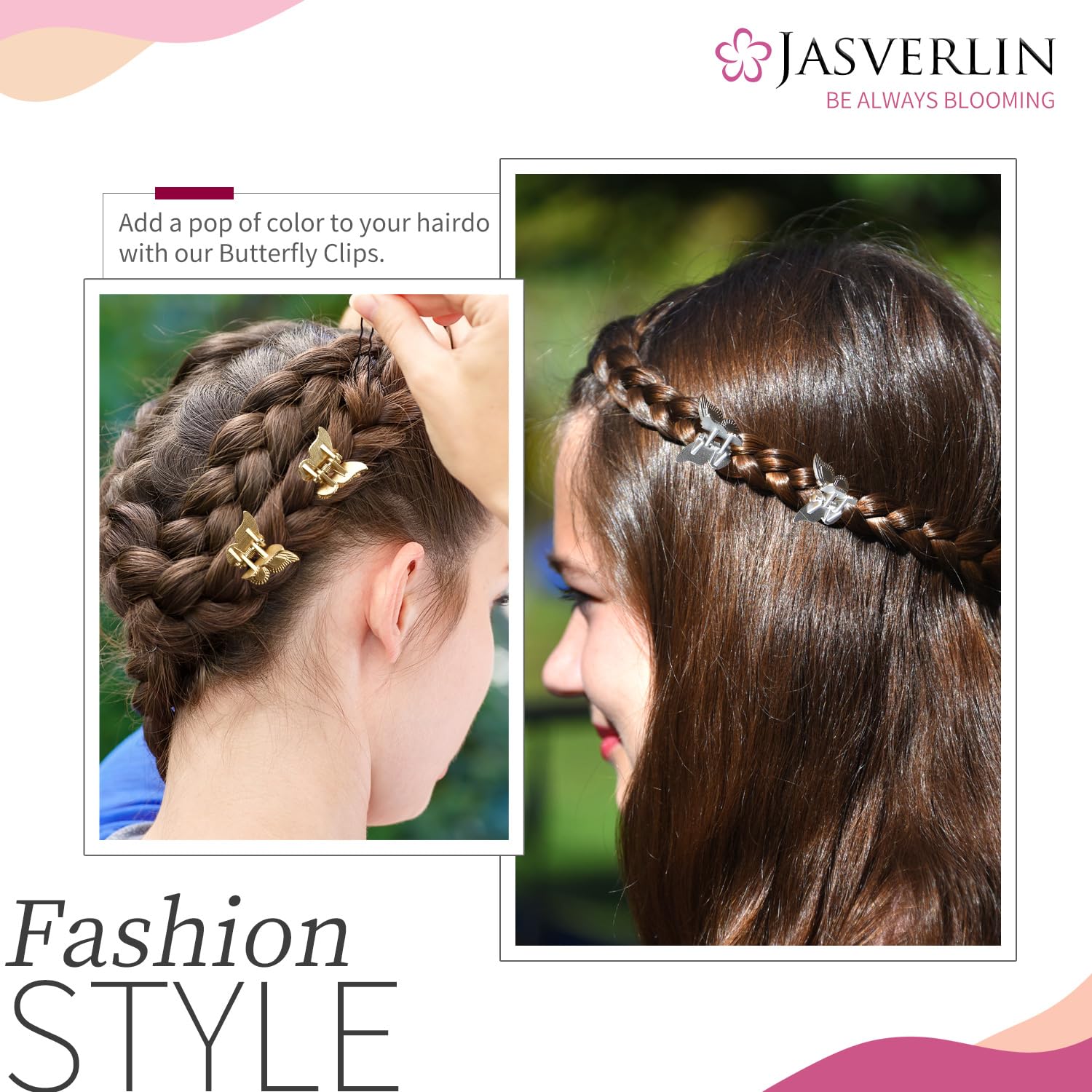 Introducing JASVERLIN Mini Butterfly Hair Clips - a radiant blend of silver and gold hair accessories tailored for every girl and woman out there! WHY CHOOSE OUR HAIR CLIPS? 🦋Adorn yourself and instantly be the spotlight in any crowd. 🦋Made with high-quality, non-slip material 🦋Silver and gold hair clips promise to complement any outfit, sparking your creativity and makeup inspiration. 🦋Mini design of these clips ensures convenience in carrying and storage, making them a perfect on-the-go accessory. Universal Appeal: 🦋Ideal for individuals of all ages - kids, girls, women 🦋Accommodates various hairstyles - braids, ponytails, top knots, low buns, curly strands, half-up pigtails, updos etc. 🦋Perfect for all hair types - fine thin thick curly etc. 🦋Suitable for any occasion that calls for sparkle - festivals, anniversaries, party Package Contents : 50 pcs total 25 in each color 1 organizer container for easy storage A Gentle Reminder : Include small parts, please ensure under adult supervision to use & keep away from children under 3 years old.