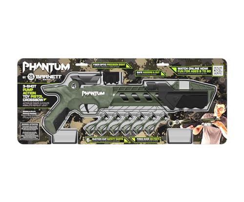 BARNETT PHANTUM SERIES SUCTION DART CROSSBOW: This suction dart crossbow features a 3 + 1 shot capacity and is pump action loading. The set comes with 6 Suction Cup Safety Darts and a free practice target so you can work on your aim