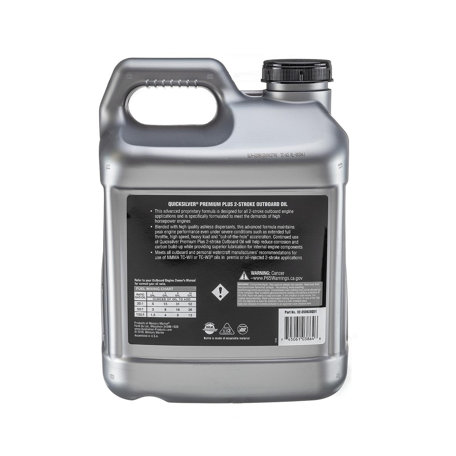 Premium Plus TCW3 2-Stroke Oil 858028Q01 is for use in oil-injected, carbureted or electronic fuel injected (EFI) mid- to high-horsepower engines. It is an advanced proprietary formula is designed for all 2-Stroke outboard engines applications and is specifically formulated to meet the demand of high horsepower engines. Blended with quality ashless dispersements, this advanced formula maintains peak engine performance even under severe conditions such as extended full throttle, high speed, heavy load and "out-of-the-whole" acceleration. Continued use of Quicksilver Premium Plus 2-Stroke Outboard oil will help reduce corrosion and carbon build-up while providing superior lubrication for internal engine components. Meets all outboard and personal watercraft manufactures' recommendations for use of NMMA TC-WII or TC-W3 oils in premix or oil-injected 2-Stroke applications. It is a NMMA TC-W3 Certified Oil.