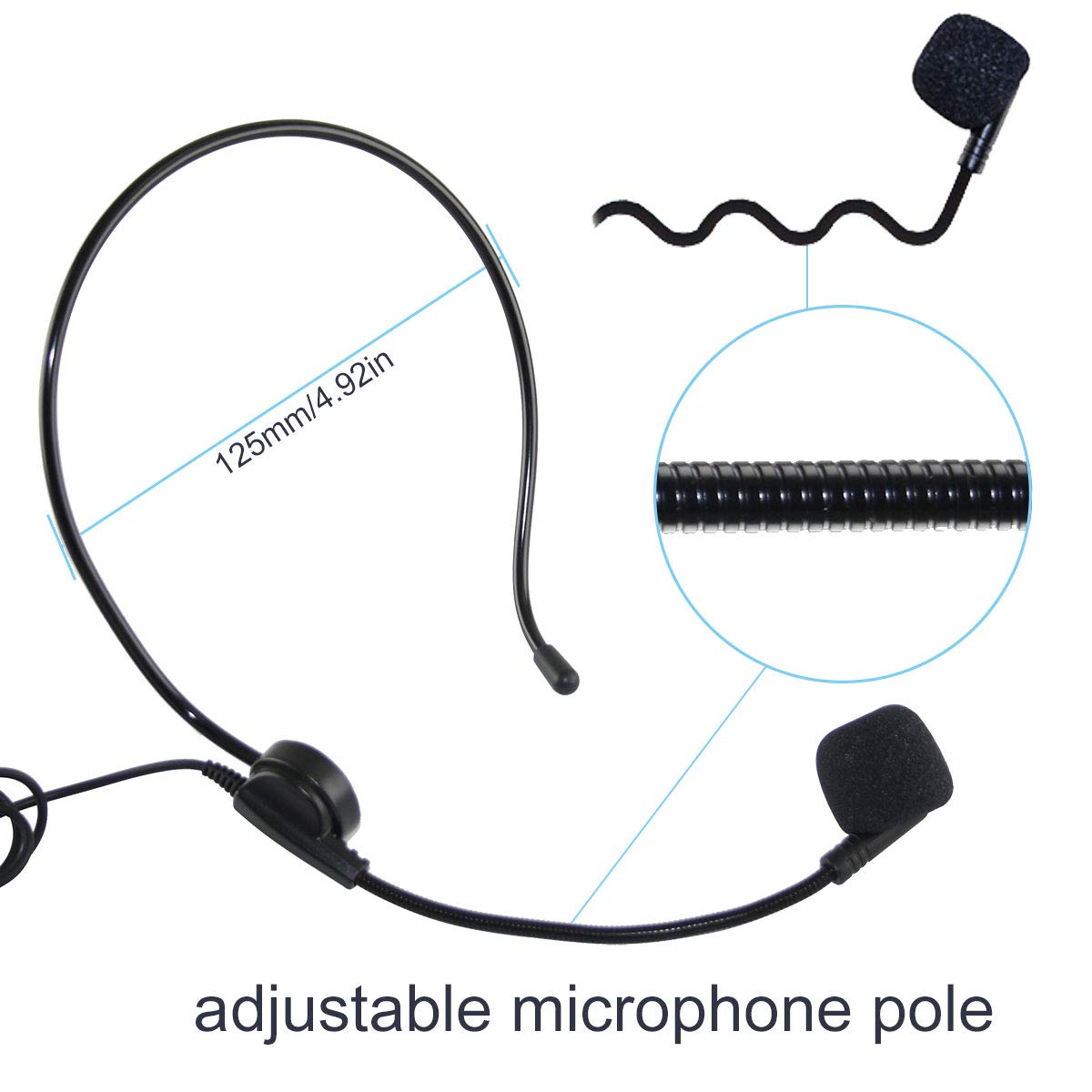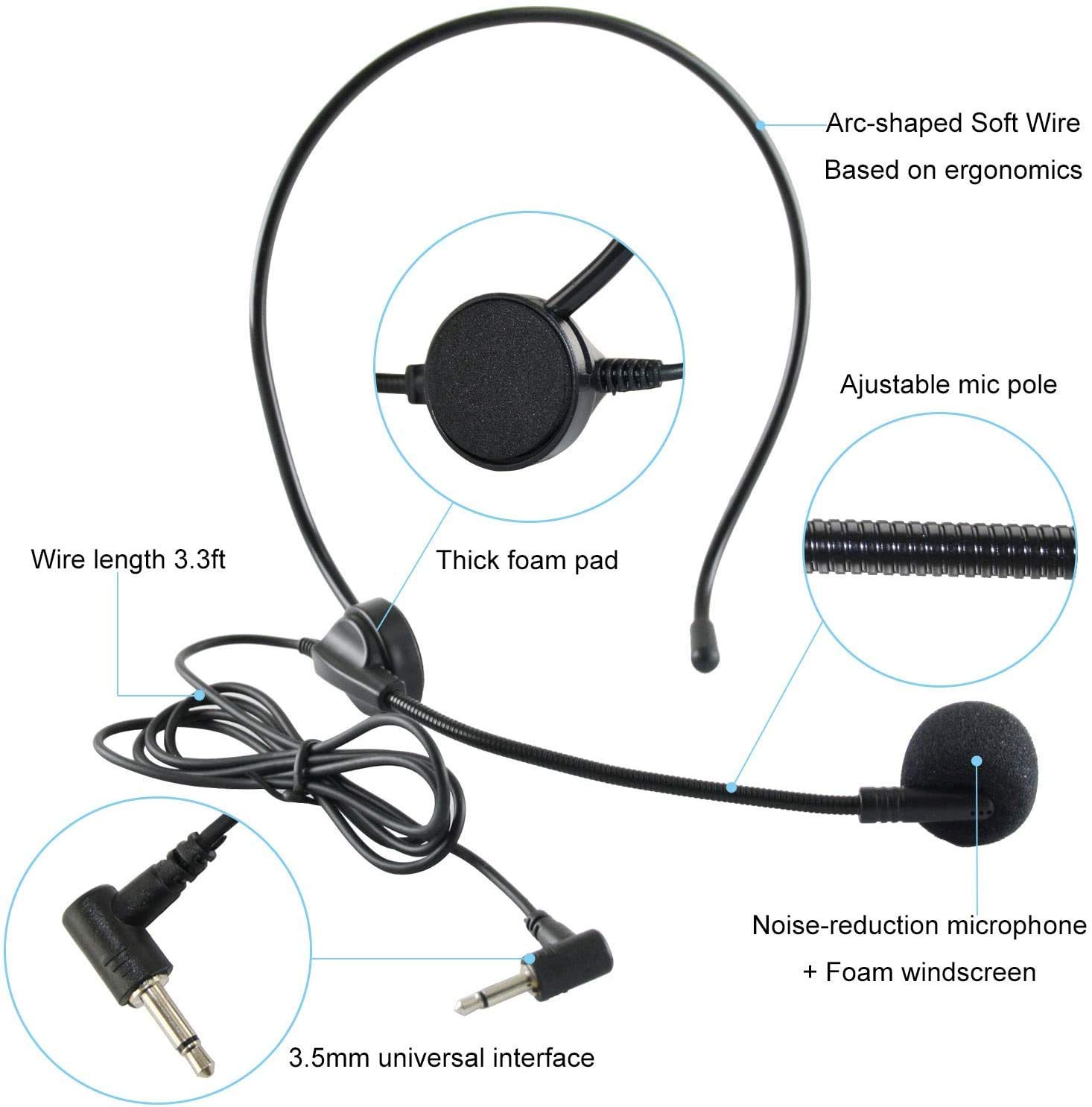 【WIRED HEADSET MIC】1m/3.3ft long cord wire and Flexible gooseneck with light weighted style design.Flexible and comfortable steel ear hanging, can be firmly worn on the ear, even wearing glasses, you will feel very comfortable.The microphone plugged directly into the megaphone, laptop microphone interface Recording clear. Suitable for stage performance,tour guide,market promotion,conference speeches,singing with dancing,teaching.