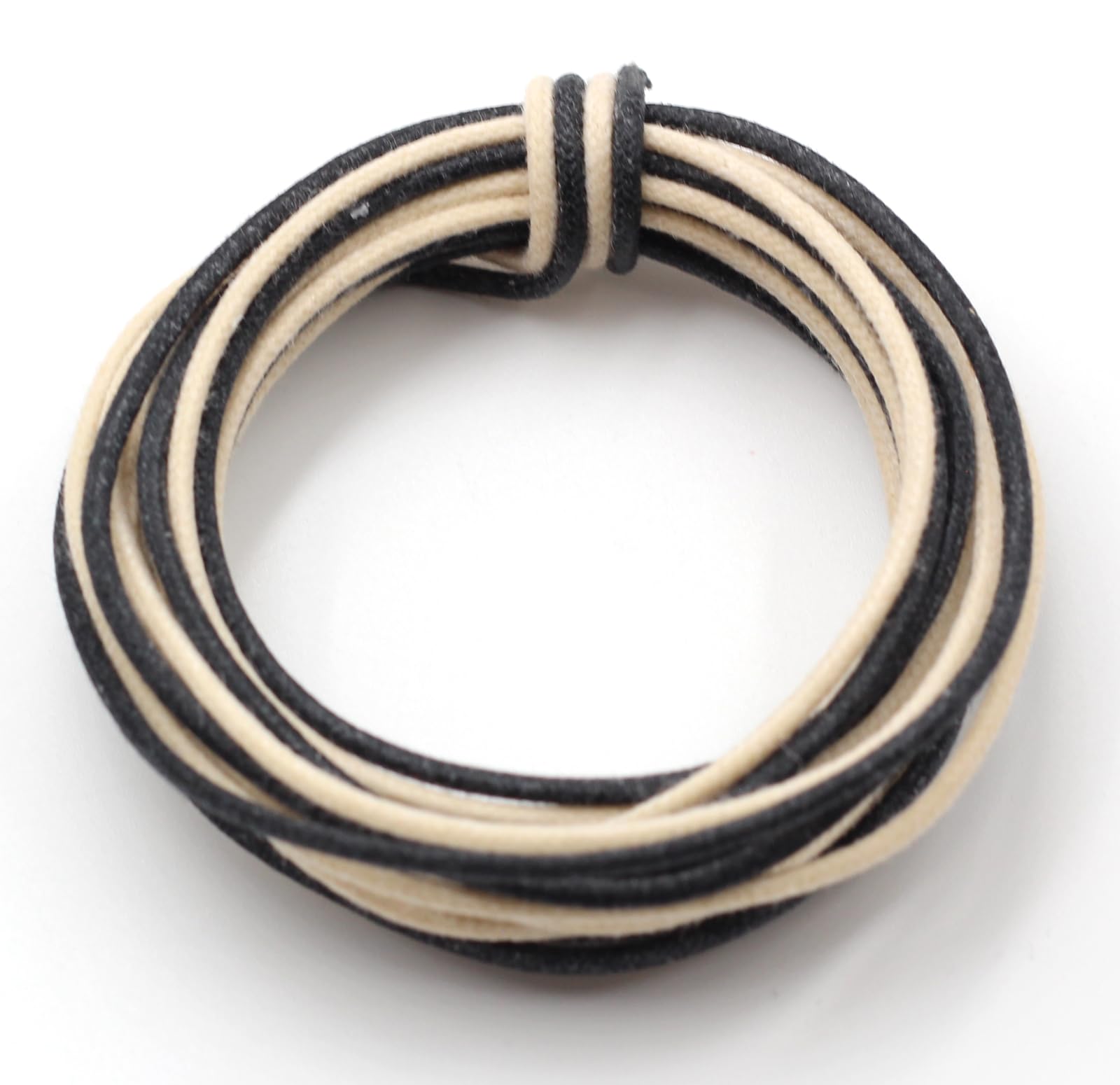 12 feet genuine GAVITT vintage-style wire for guitar. Includes 6 feet of black wire and 6 feet of vintage white.This vintage cloth push-back wire is 22AWG stranded wire, with textile braid made by Gavitt. This is the same wire used by Fender. It has a tinned overcoat after the individual strands of the conductor are twisted together locking the strands into a single unit just like Fender has their wire made. The benefit to this process is that the wire holds its shape very well without having fraying strands at the cuts needing to be twisted and tinned, making it very easy to work with. The cloth push-back insulation reduces work time by eliminating the need for wire strippers. Just cut to length, push back the cover and solder into place.