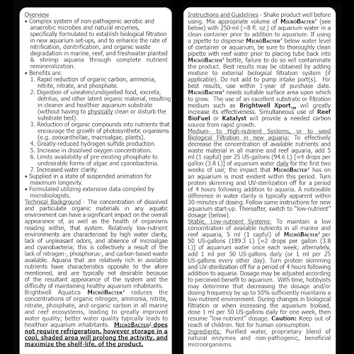 Brightwell Aquatics MicroBacter7 Complete Bioculture for Fish Tank or Aquarium Experience a new level of aquatic care with Brightwell Aquatics MicroBacter7 Complete Bioculture for Fish Tank or Aquarium – the ultimate solution for achieving a balanced and thriving aquatic environment. This advanced microbial formula is rigorously tested and recommended by veterinarian pathologists, establishes biological filtration in new aquarium setups and accelerates the rates of nitrification, denitrification, and organic waste degradation in marine and freshwater aquaria. The bacteria supplement offers unparalleled reliability. While rapidly reducing hydrogen sulfide production to increase dissolved oxygen levels, it also decreases levels of organic carbon, ammonia, nitrite, nitrate, and phosphate, establishing a cleaner substrate. As a result, it inhibits the growth of undesirables and improves the overall water clarity of your aquarium. If you're setting up a new aquarium or fish tank, the MicroBacter7 Bacteria Water Conditioner is your go to solution. Its versatility extends to both freshwater and saltwater aquariums, providing powerful support for a diverse range of aquatic environments. FEATURES AT A GLANCE Advanced Microbial Formula Comprehensive Nutrient Remineralization Targeted Nutrient Reduction Enhanced Water Quality Prevents Growth of undesirable substances Reduced Hydrogen Sulfide Production Veterinarian Pathologist Tested and Recommended AMERICAN-MADE EXCELLENCE Trust in the quality and excellence of Brightwell Aquatics, an industry-leading brand committed to providing innovative and scientifically backed aquatic care products. Made in the USA, we consistently strive to deliver advanced superior quality solutions to elevate the vibrancy and health of your aquarium.