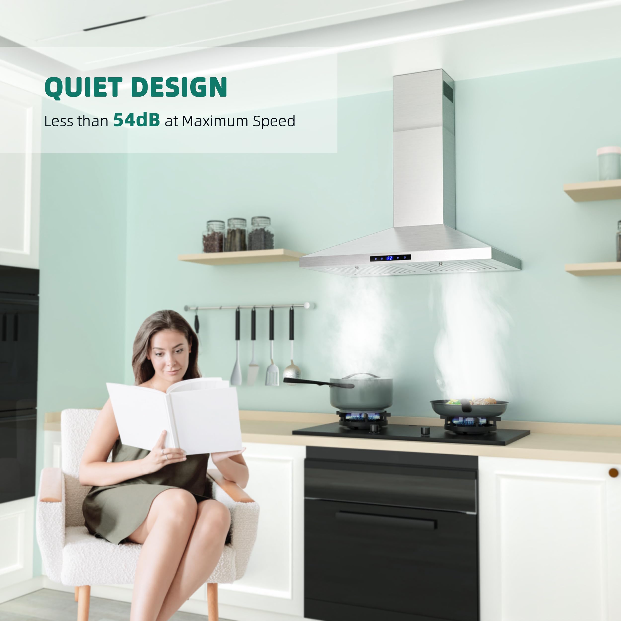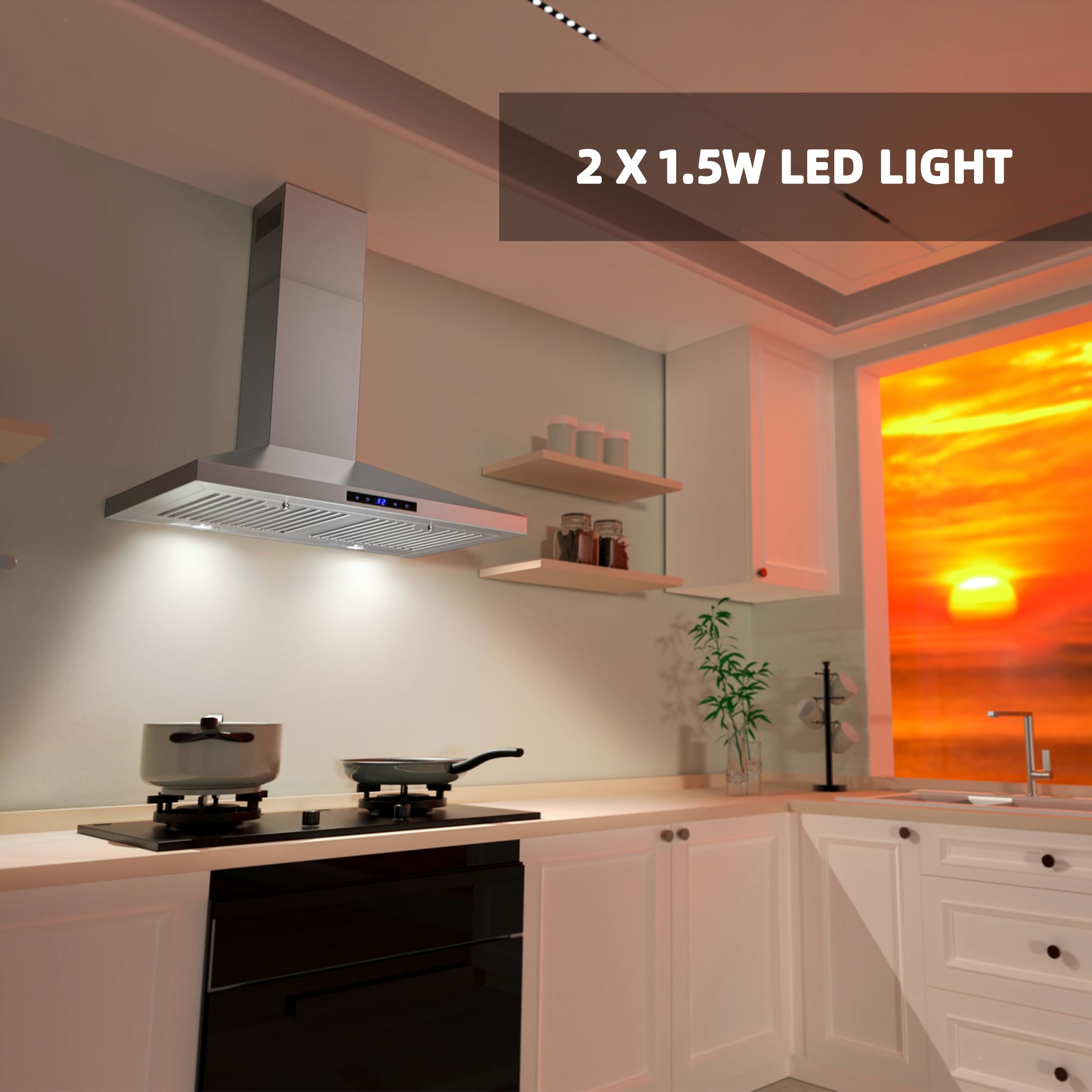 POWERFUL AND REALLY QUIET RANGE HOOD: Kitchen vent hood 30 inches less than 56dB at high speed, for ultra-quiet operation. When cooking,there is no longer the roar of the kitchen hood. The range hoods with 2 x 1.5W LED offer enough brightness to meet your cooking need. Timing setting let you don't have to stay in the kitchen all the cooking time