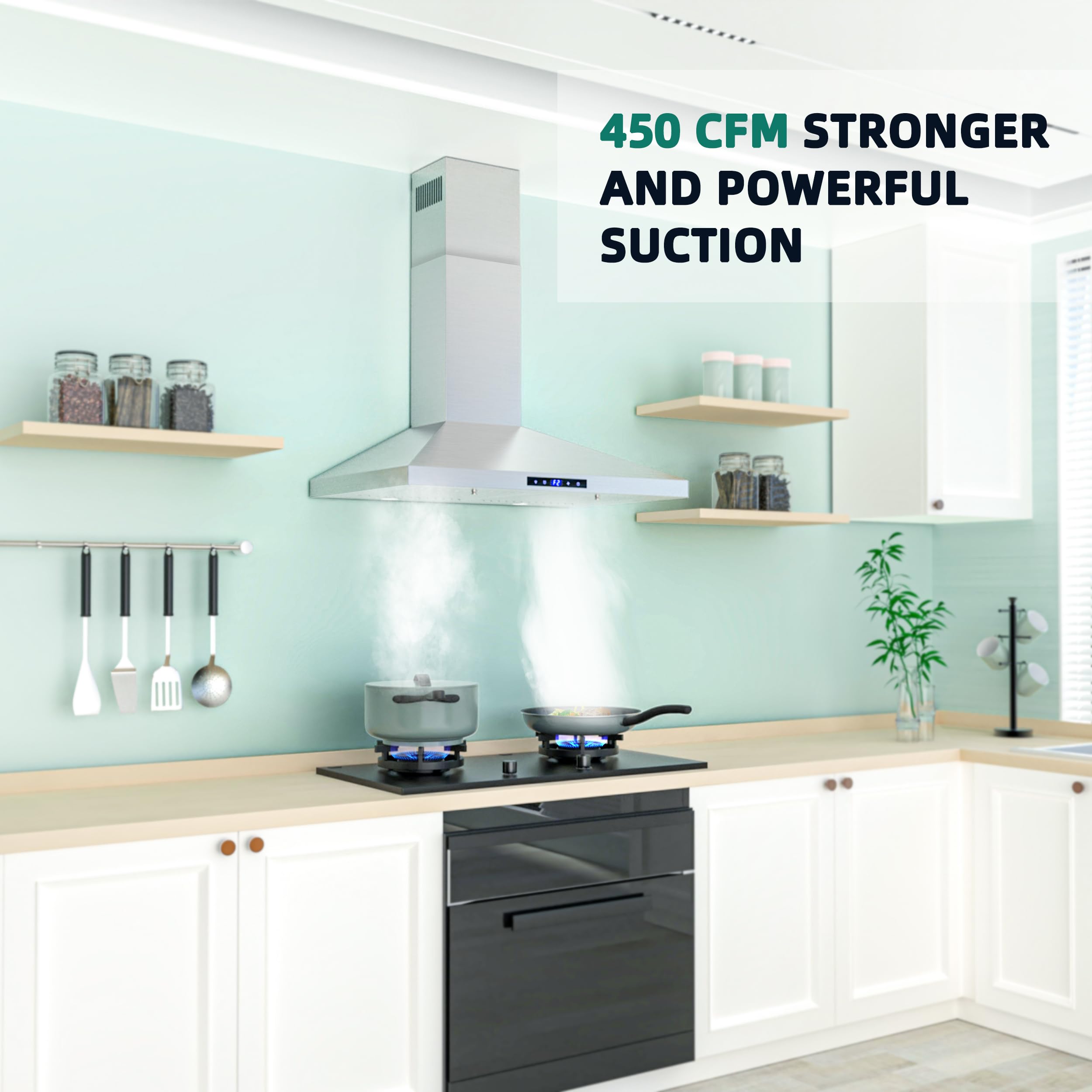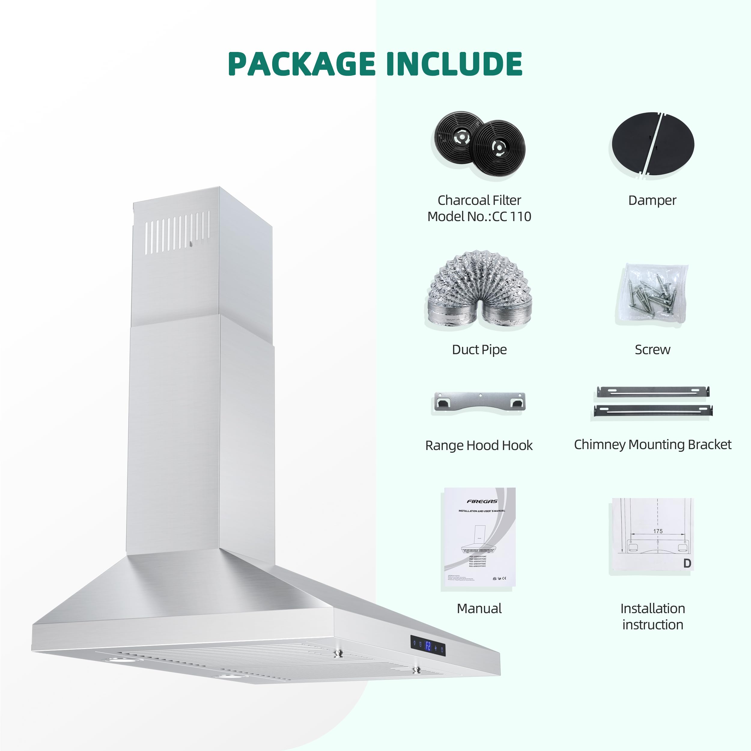 WORK EFFICIENTLY DUCTLESS RANGE HOOD: FIREGAS Wall Mount Range Hood with 450 CFM, 3 speed exhaust fan, effectively removes smoke and odors. Reduce the damage to your skin and health. Ductless range hood can be convertible to ductless with included Carbon Filter (Model: CC110). Suitable for different cooking method