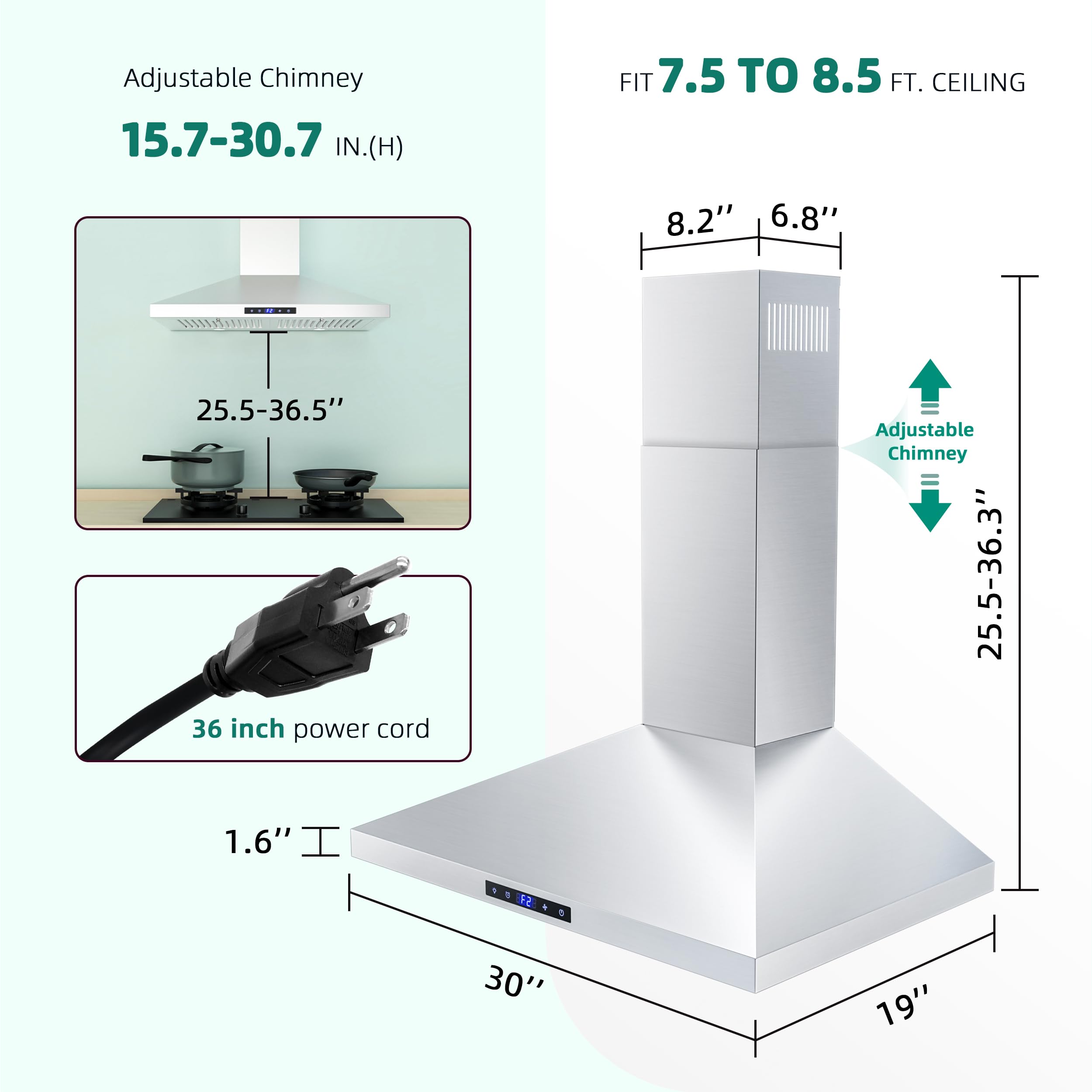 UPSCALE LUXURY FEELS DESIGN HOOD VENT: Modern styling to fit a variety of kitchen decors. Remodel your entire kitchen with FIREGAS’s 24Y75CC modern canopy wall mount range hood 30 inch. Vent hood Dimensions: 30 in.(W) x 19 in.(D) x Adjustable 25.5 in. - 36.3 in.(H), it is fit 7.5 to 8.5 Ft. ceiling. Electrical: 120V/60Hz, 3-prong plug.Duct Size: 6 in. If you have a high ceiling, add extra extension chimney (Model: FGS-TD24S-ZST) which can extend 9-10 ft. ceiling