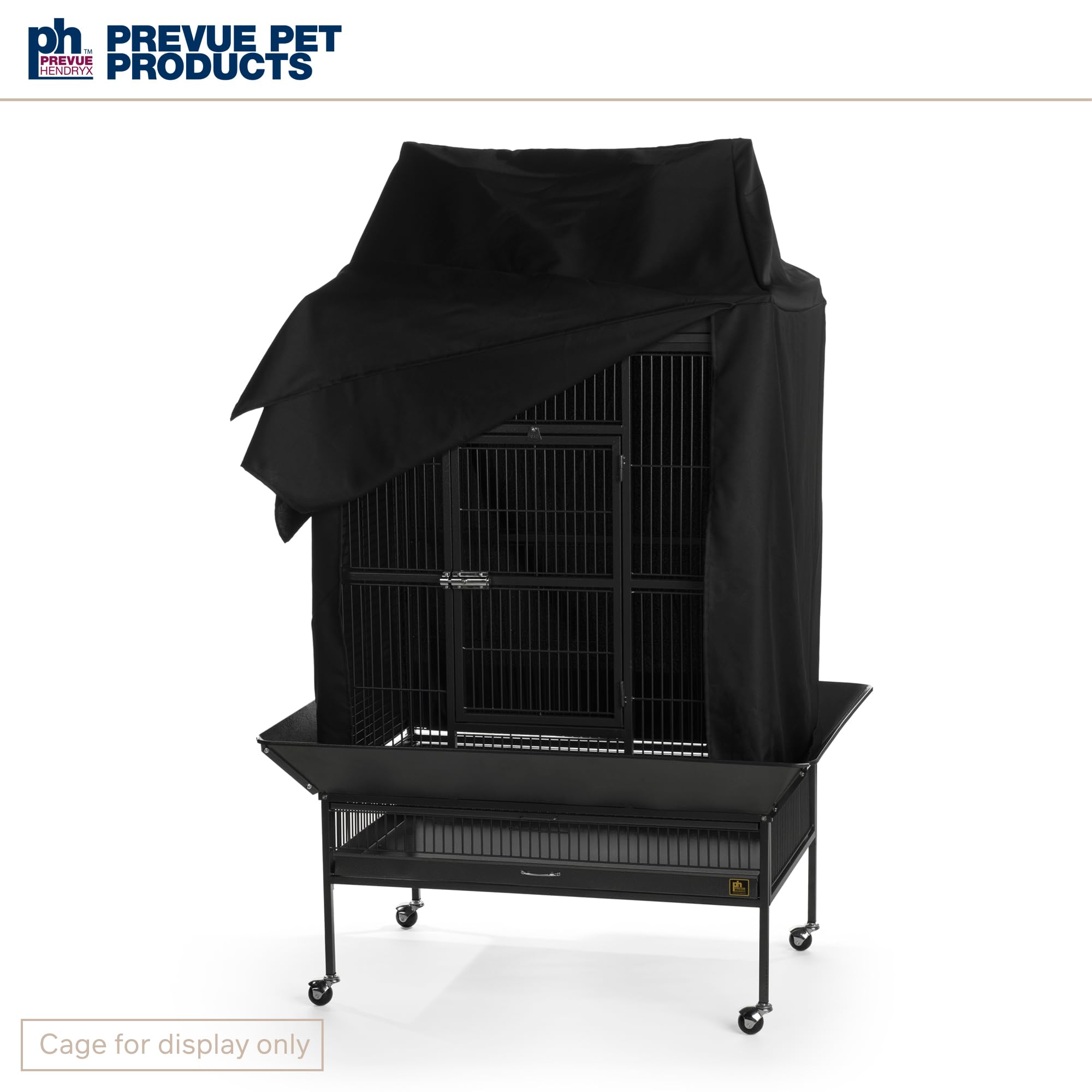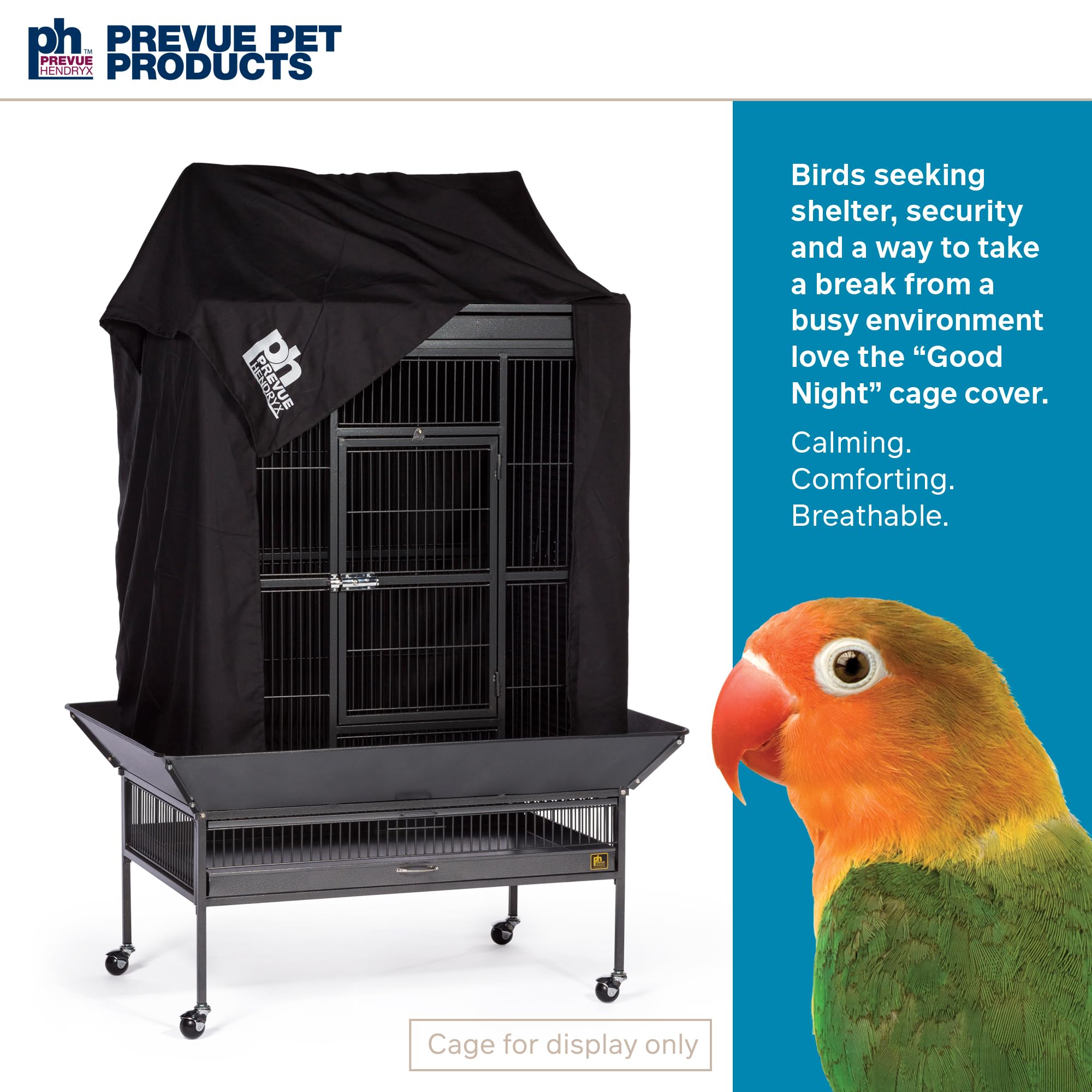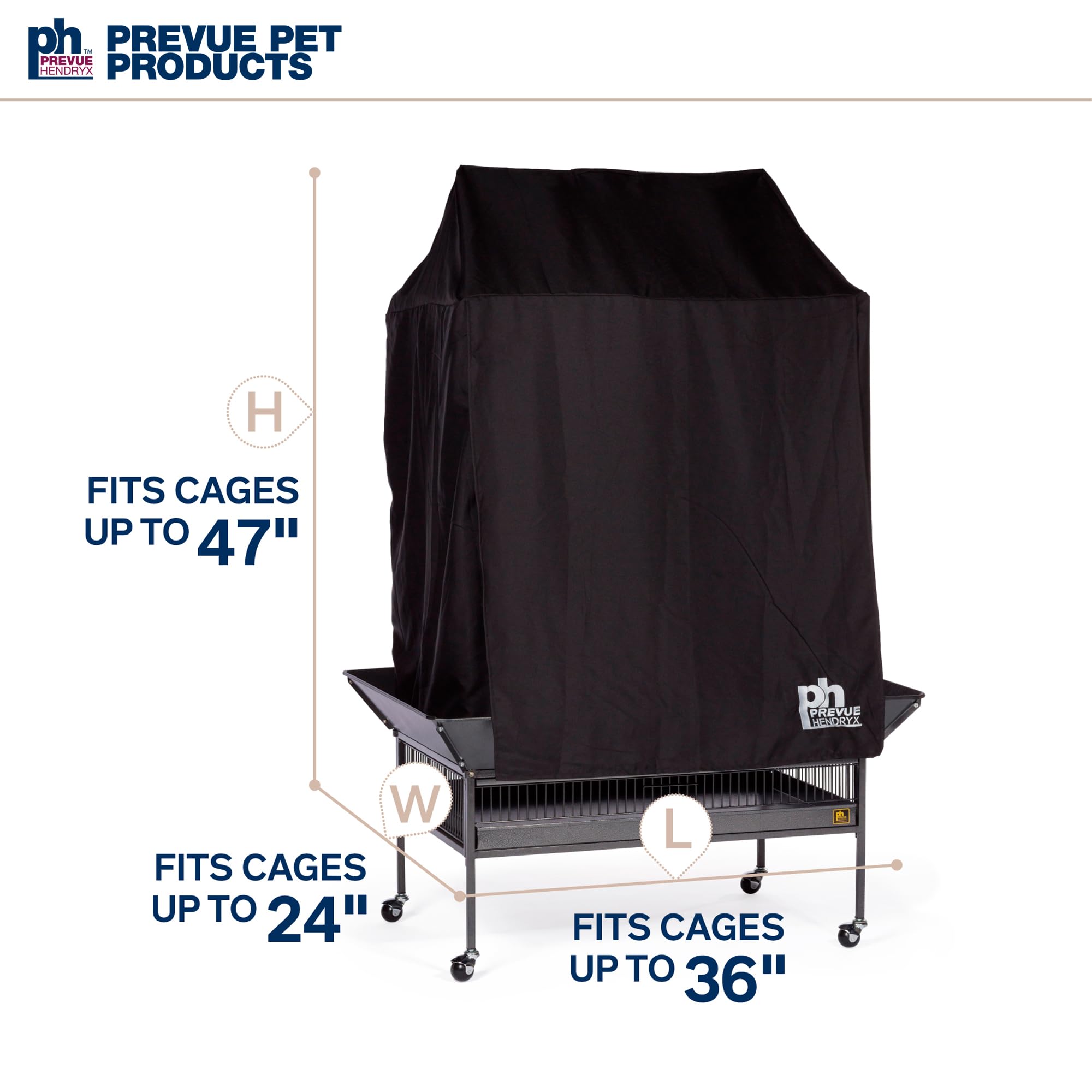 Prevue Pet Products Universal Bird Cage Cover 12505 aids in reducing distractions and allows for uninterrupted sleep. Manufactured from 100% non-toxic, breathable materials, our cage cover is color fast, lightweight and machine washable. The black fabric features the Prevue Hendryx logo and fits all cages up to 36" long, 24" wide and 49" high. Each bird cage drape cover CAN fit a range of cage sizes, and as a result, may either overhang on smaller size cages or be too small for larger cages. **Check to confirm that each side of your cage fits within the dimensions listed**