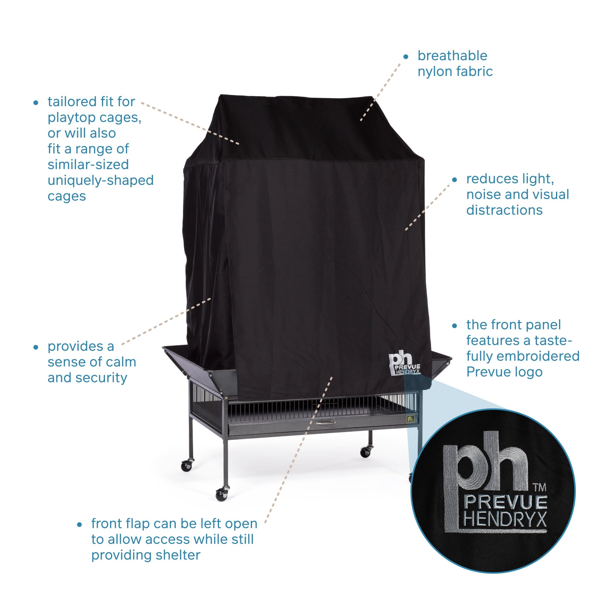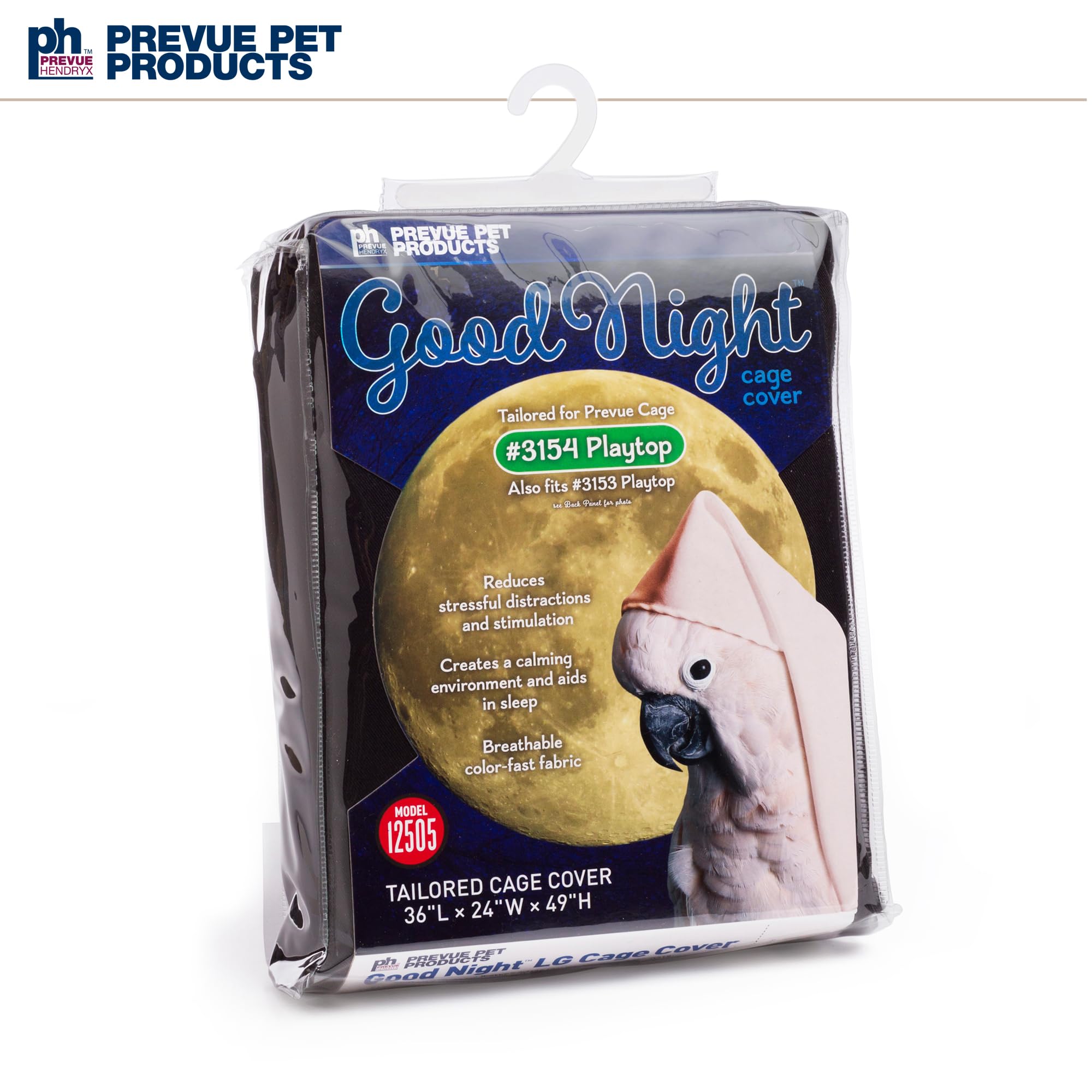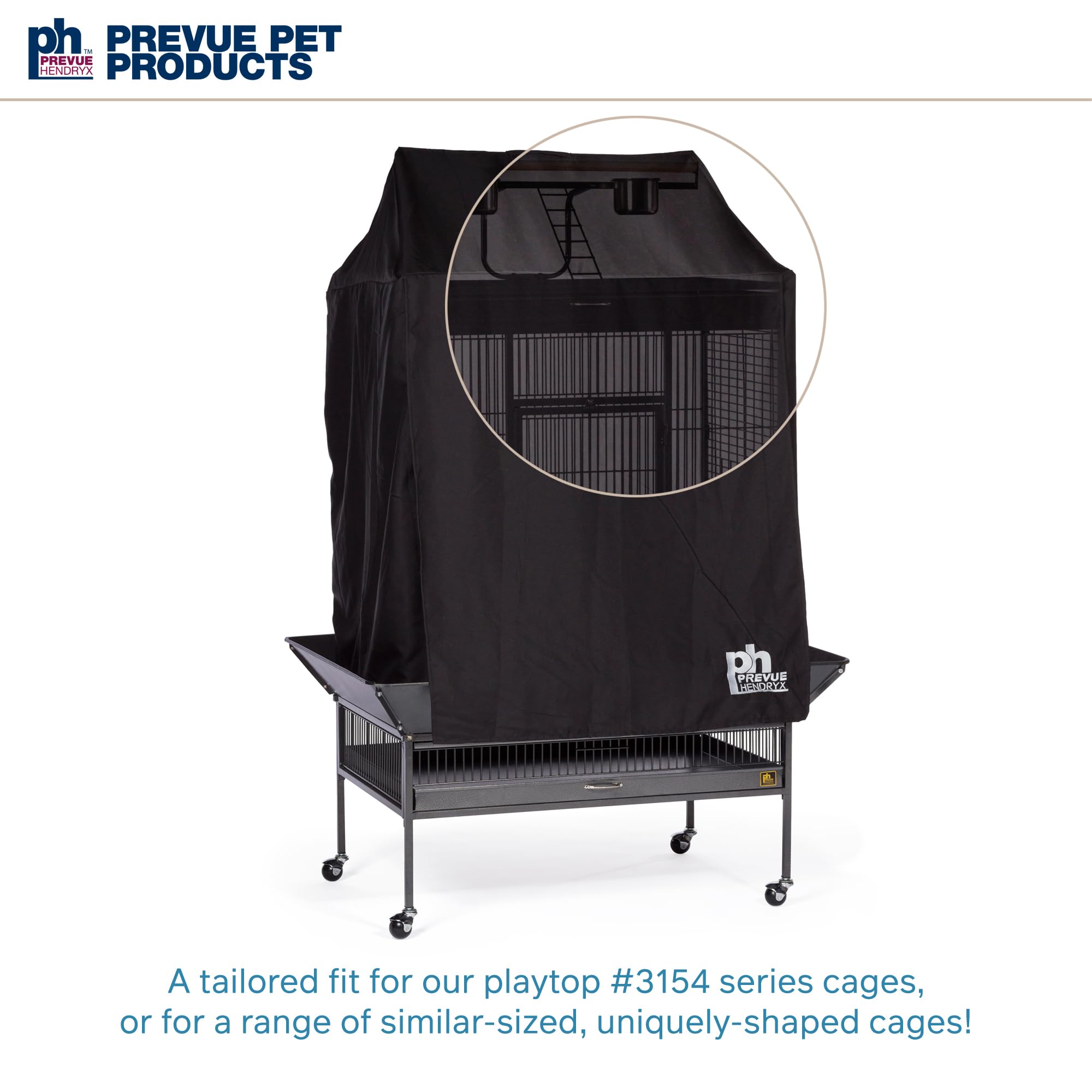 Prevue Pet Products Universal Bird Cage Cover 12505 aids in reducing distractions and allows for uninterrupted sleep. Manufactured from 100% non-toxic, breathable materials, our cage cover is color fast, lightweight and machine washable. The black fabric features the Prevue Hendryx logo and fits all cages up to 36" long, 24" wide and 49" high. Each bird cage drape cover CAN fit a range of cage sizes, and as a result, may either overhang on smaller size cages or be too small for larger cages. **Check to confirm that each side of your cage fits within the dimensions listed**