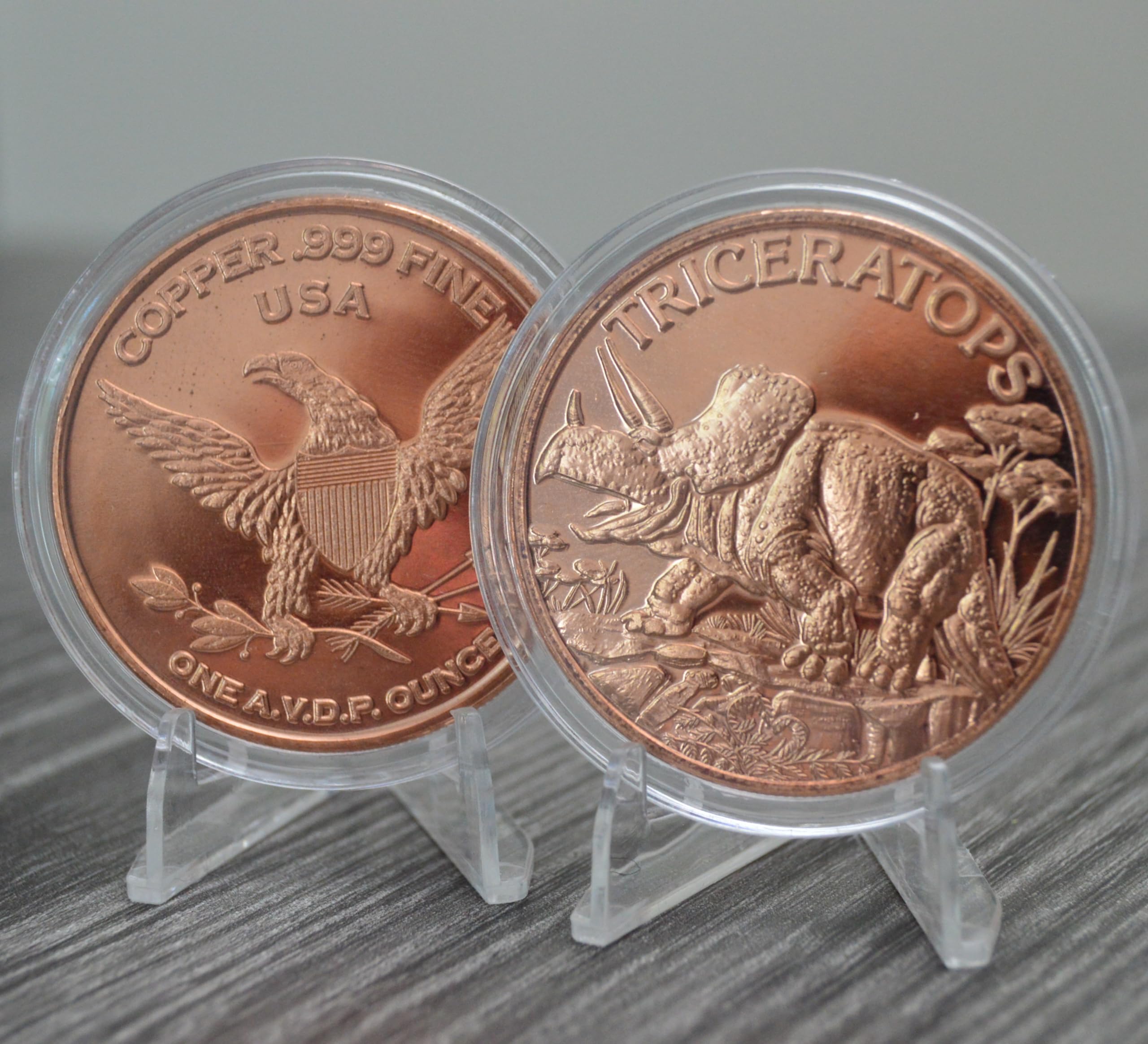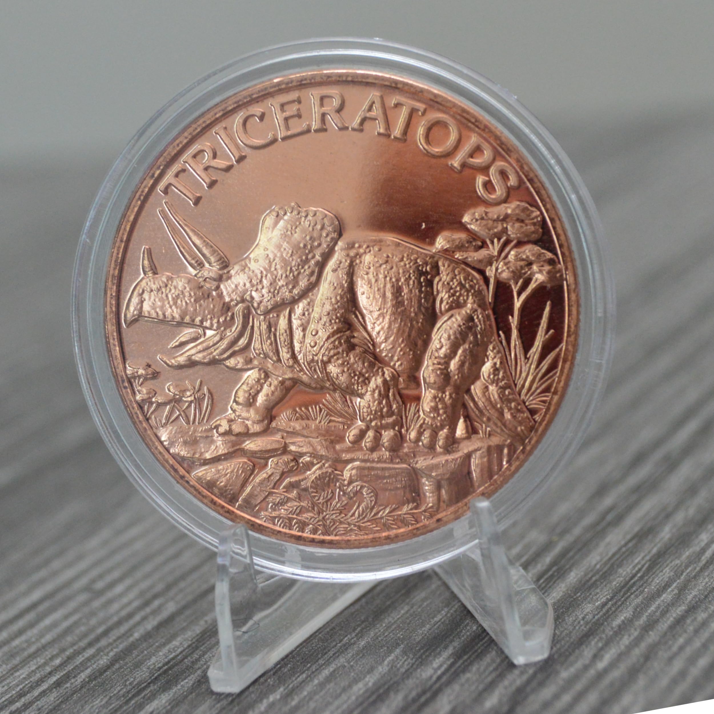 Explore the prehistoric era with the Triceratops Dinosaur Lost World Collection 1 oz Pure .999 Copper Round Bullion Coin. This captivating copper round features a meticulously designed Triceratops, a dinosaur that once walked the earth, making it a fascinating addition to any collection or investment portfolio. The design of the round provides a captivating glance at the lost world of dinosaurs, featuring a detailed representation of the Triceratops. The reverse carries the Lost World Collection insignia, enhancing its appeal among dinosaur enthusiasts and collectors alike. Expertly minted in the USA from one AVDP ounce of .999 pure copper, this round serves as both a piece of art and a valuable investment. The impressive weight and 39mm diameter of this copper round make it a significant piece in any collection or portfolio. Each round is encased in a protective cover, safeguarding the unique design and shiny finish from potential damage, ensuring its long-term value. Your purchase includes a Certificate of Authenticity (COA) by Heavenly Metals. This COA affirms the round's copper composition, weight, and origin, instilling confidence in your investment. Experience the charm of the lost world with the Triceratops 1 oz Pure .999 Copper Round. Add this unique piece to your collection today.