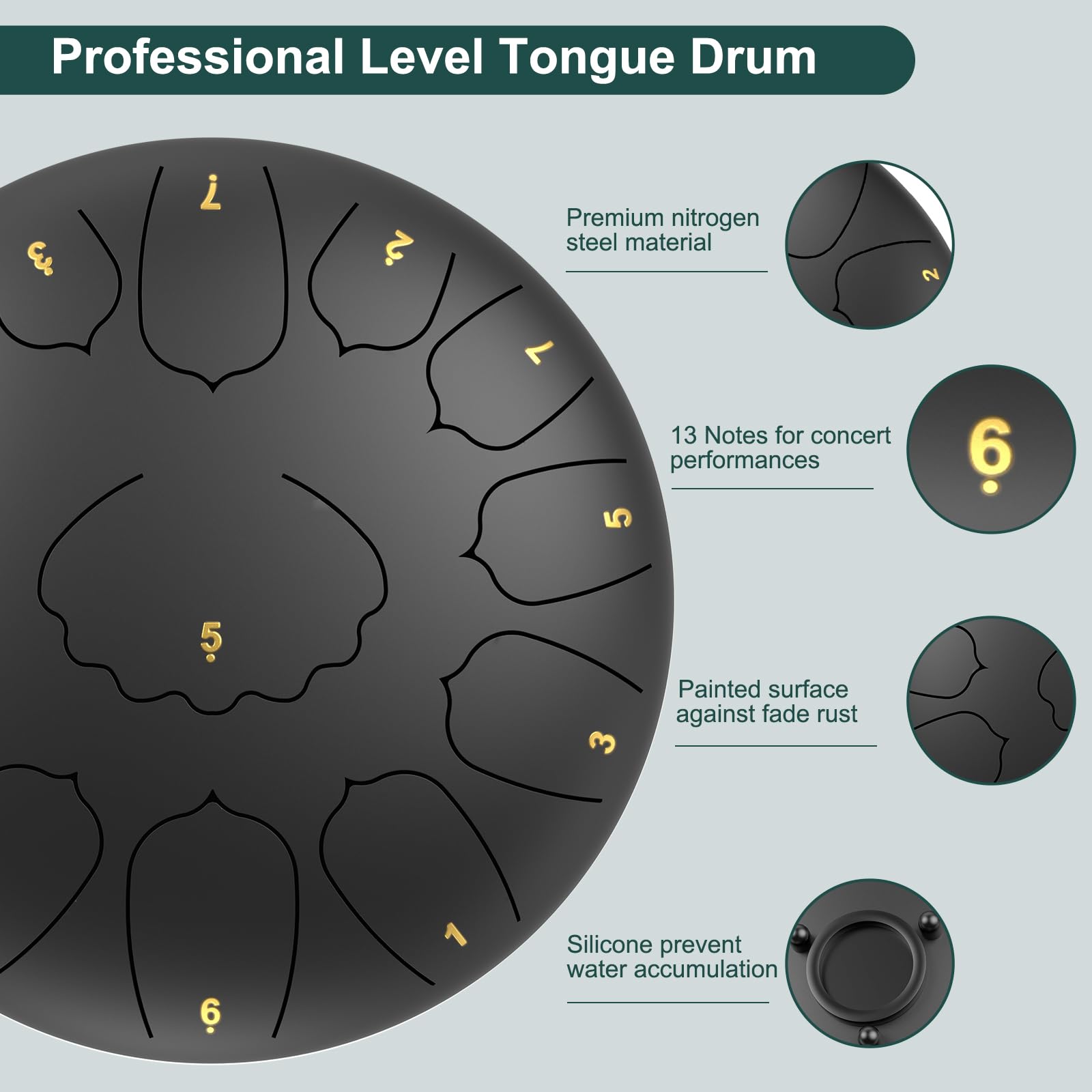 Larger Steel Tongue Drum: The steel drum features 13 tuned notes in D Major, offering a broad sound spectrum that allows for a variety of musical expression. When the drumstick beats the tongue and vibrates, the cavity resonates and makes a pleasant sound. The tone is beautiful, clear, and melodic. Bring a break from electronics.