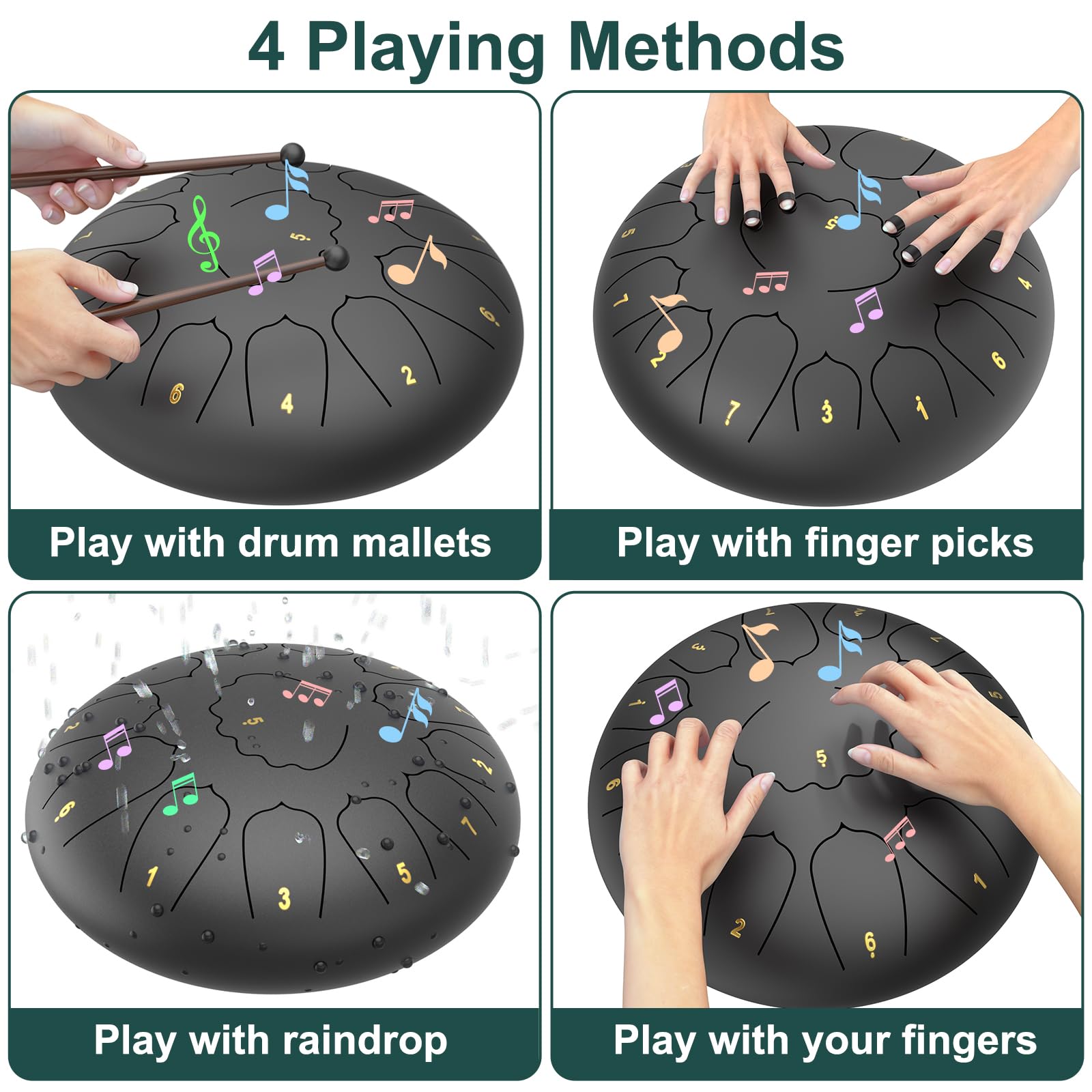 Easy To Pick Up: Whether you're a beginner or a seasoned musician, this rain tongue drum is designed for ease of use. Simply tap the hand pan drum rhythmically with the included mallets to create enchanting melodies. With the additional music book provided, you can start playing beautiful tunes even without any prior musical knowledge. It's a fantastic choice for music lovers of all ages!