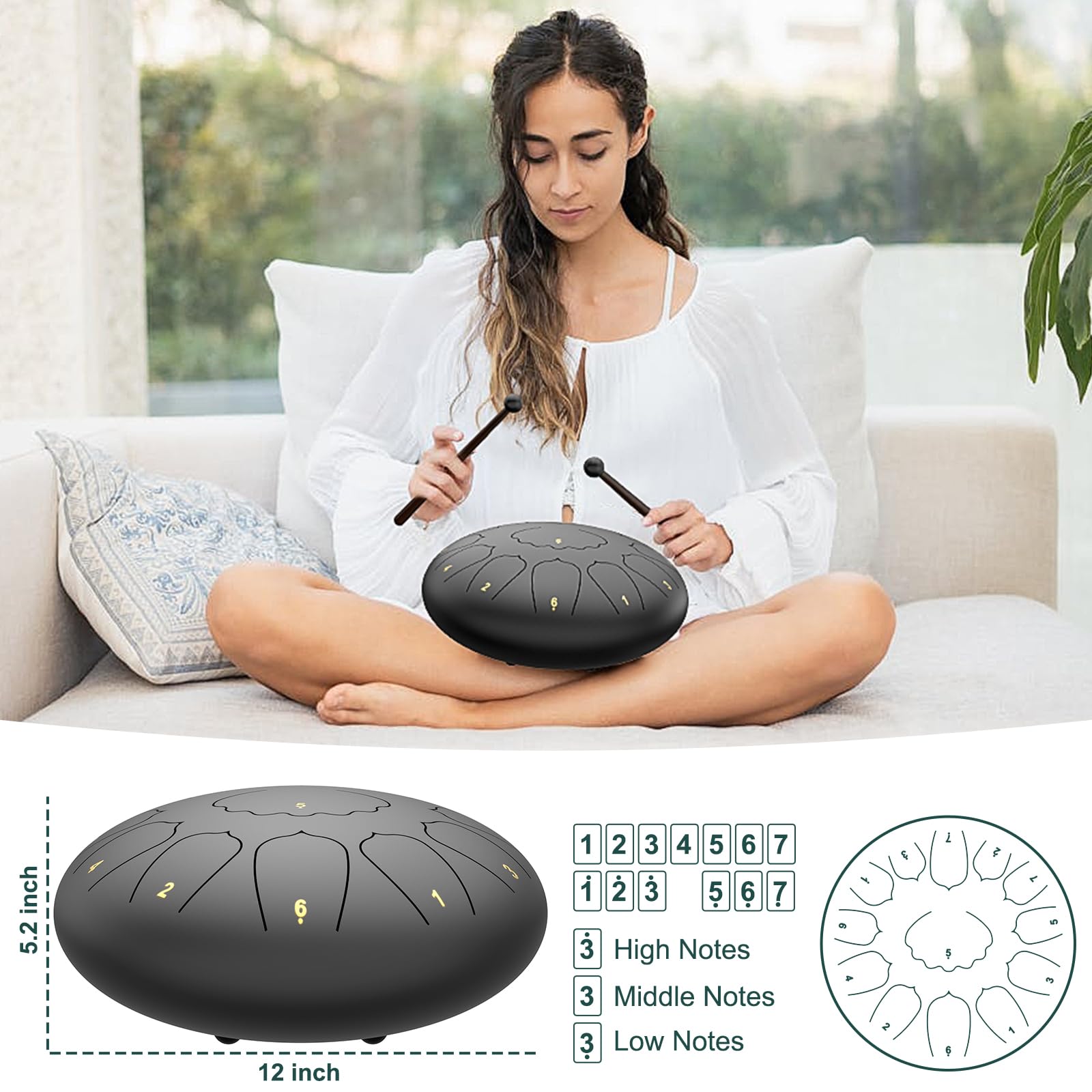 High-Quality Craftsmanship: This 12-inch handpan is made from premium carbon steel and coated with protective paint for exceptional corrosion and heat resistance. Each steel tongue drum is meticulously hand-modulated and accurately cut to ensure precise tones and harmonies, delivering a truly high-quality musical instrument.