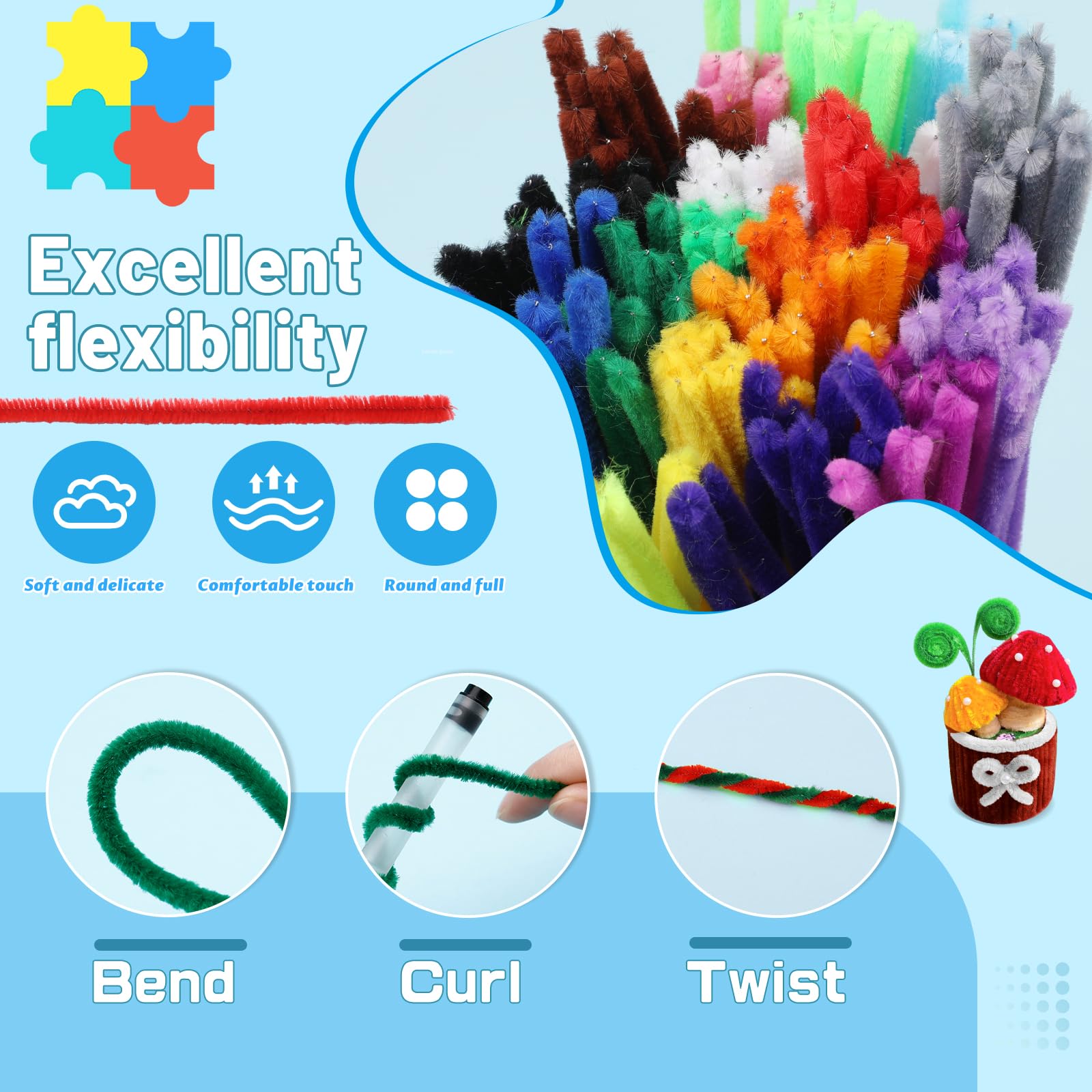 Soft and Flexible: This fuzzy pipe cleaners craft is soft and flexible, made of chenille stems material, and is very easy to shape and bent, twisted or rolled into various shapes, and can also be used to make unique animal or flowers crafts. Whether it is creative handicrafts or other craft projects, it can easily meet your diy needs