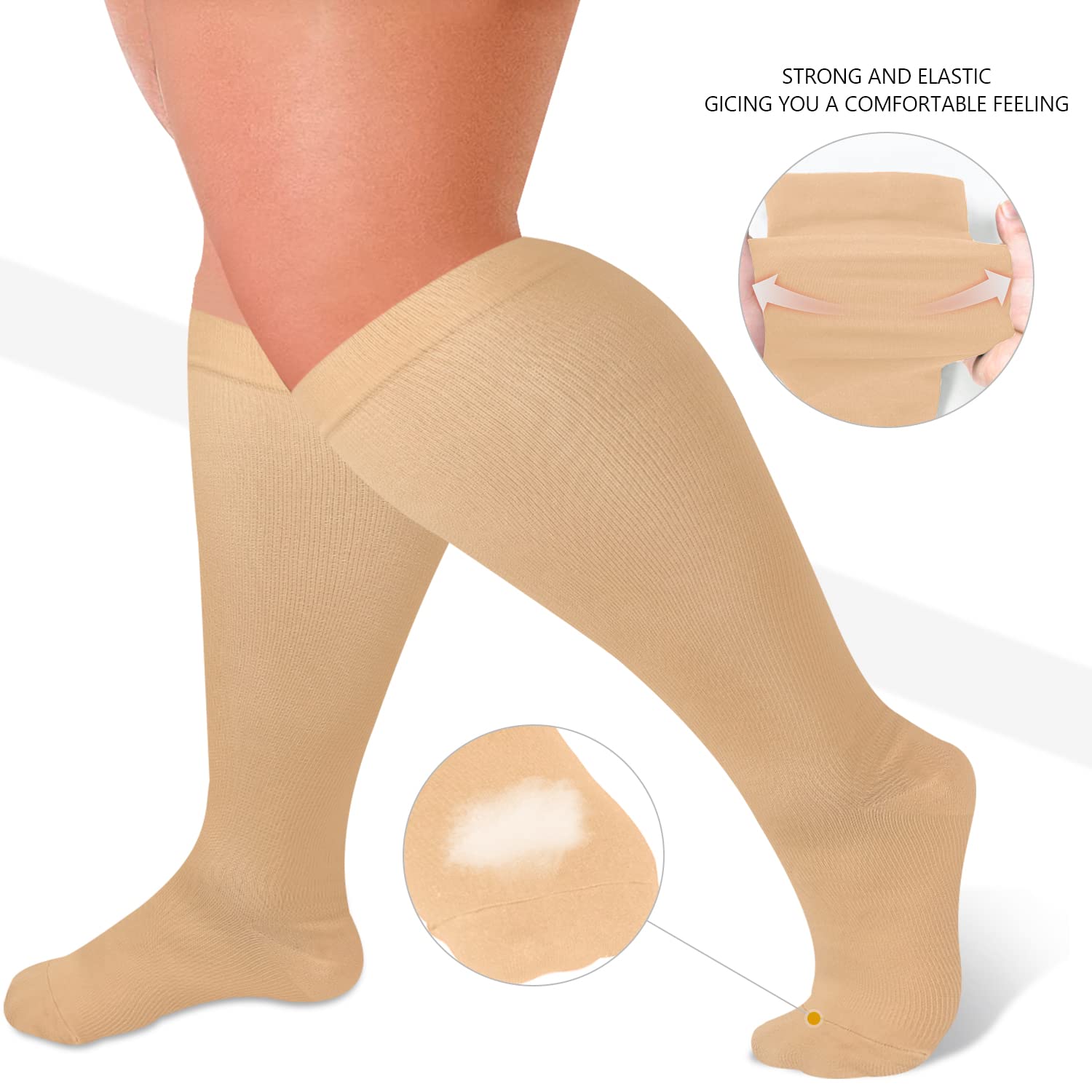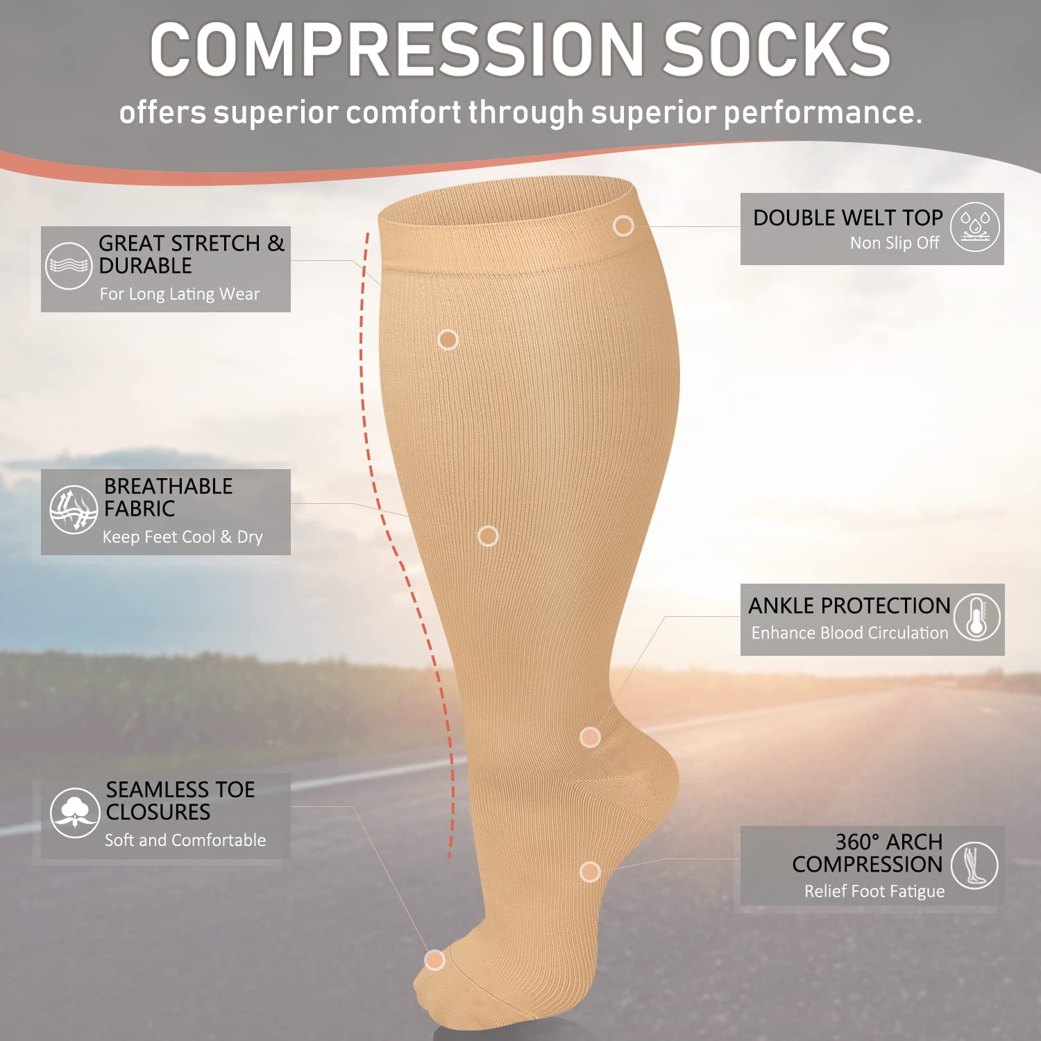【More Size Choice】- Plus size (2XL-5XL) for ankle up to 16 inches, calf up to 28 inches’ circumference, you can refer to the size chart to choose the suitable size (and in general we suggest you choose the larger size if you are hesitating between two sizes). Our knee-high compression socks have nice and snuggly support without being too tight and enhance blood circulation effectively.