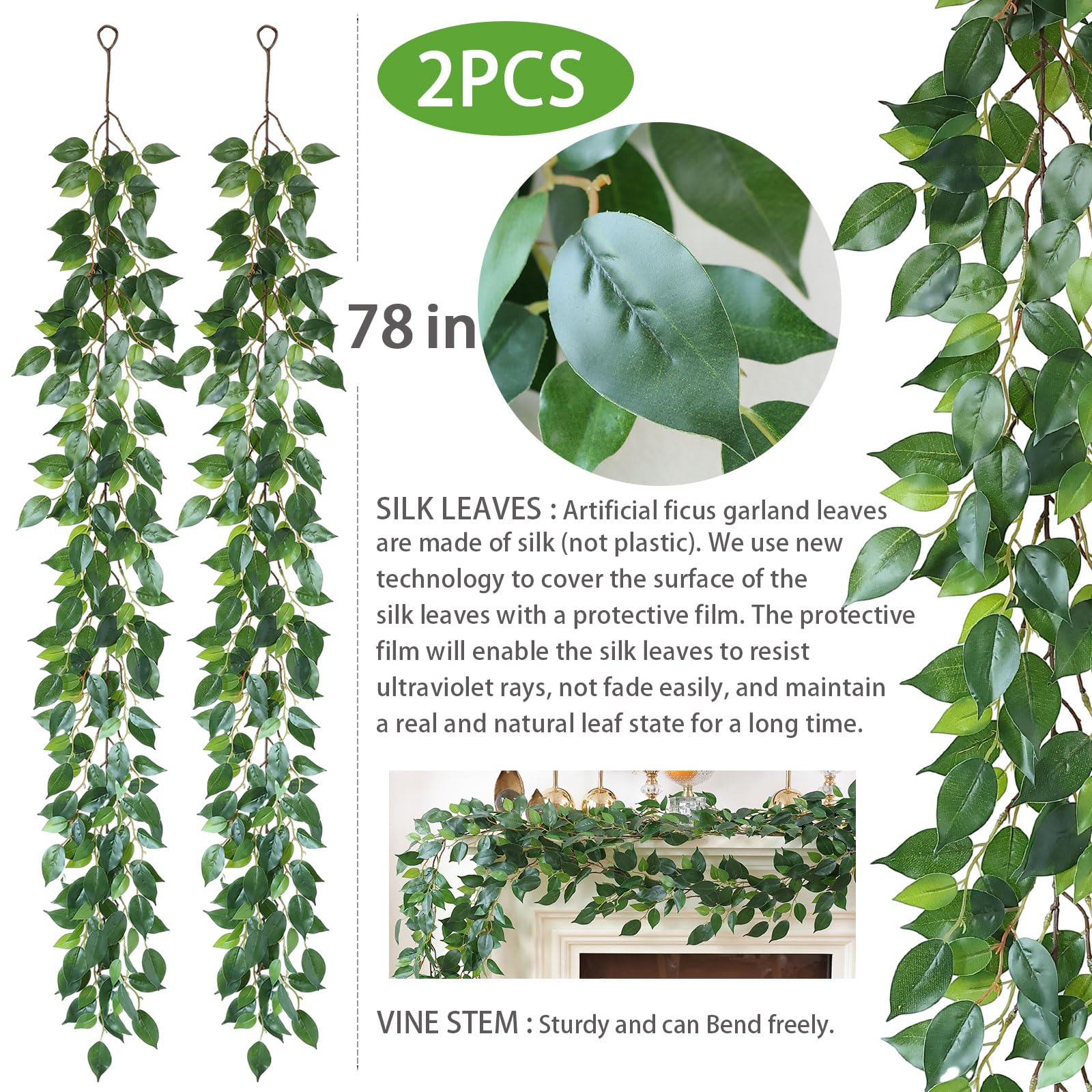 Vine Size - The packaging includes 2 packs of artificial ficus vines, Each with a length of 78 inches, Each bundle of vines has 288 silk ficus leaves, They have the same branching as real vines, which makes them look more realistic and full.