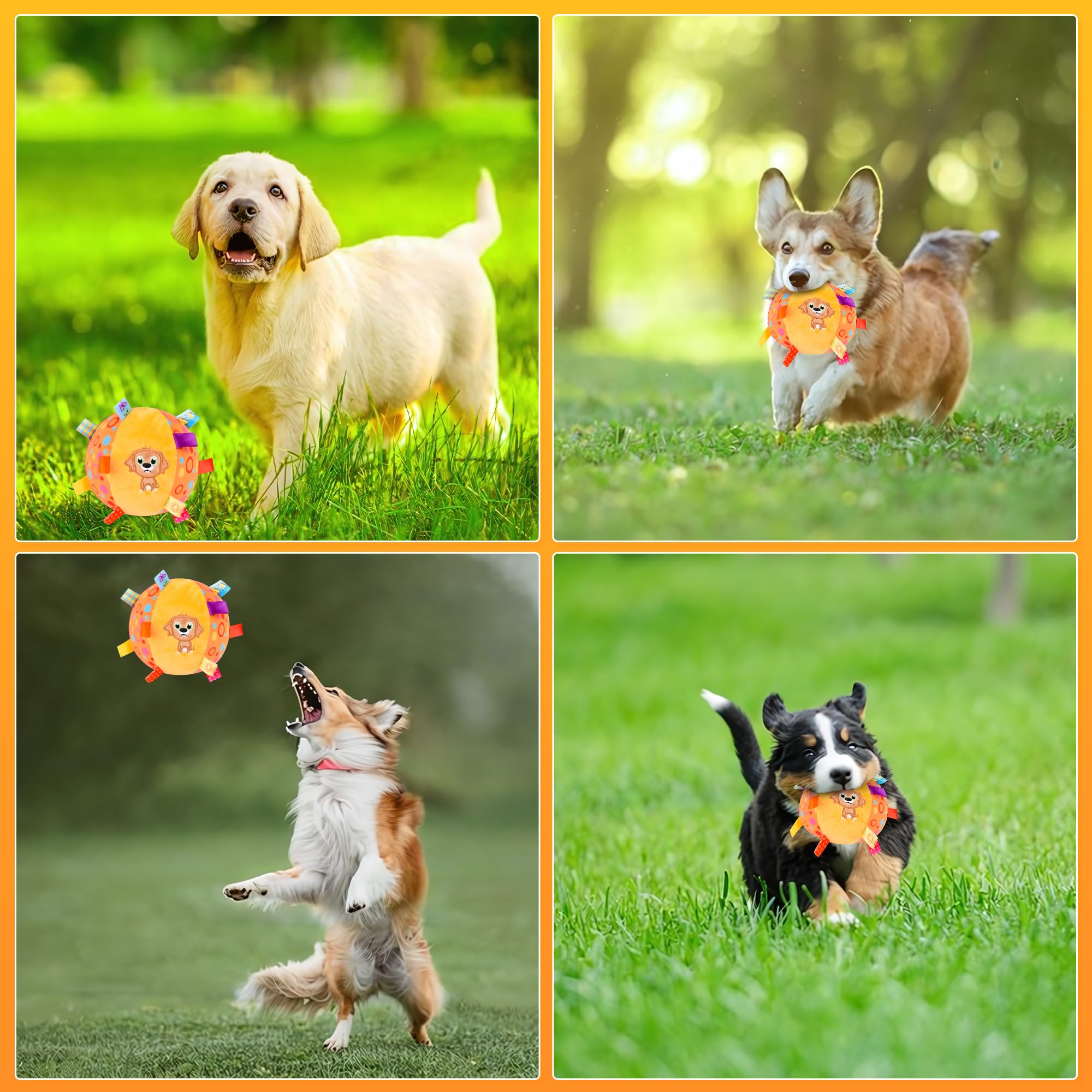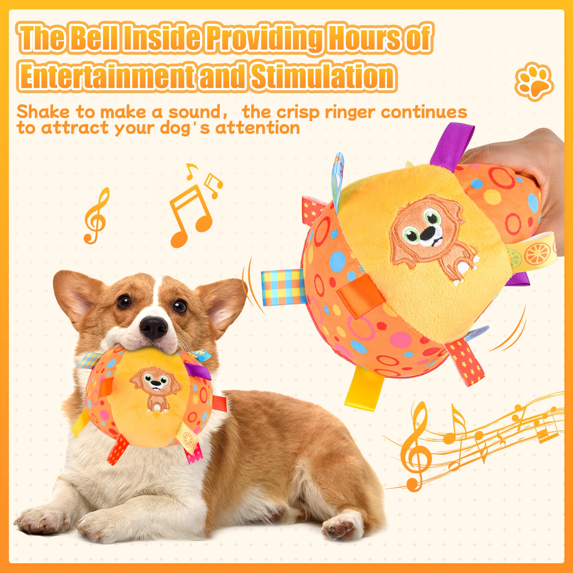 Interactive Dog Squeaky Plush Ball Toy: Soft Dog Stuffed Ball Toys with colorful nylon tabs sew makes it easier for the dogs to fetch, toss, tug and retrieve. It has a bell inside produces a pleasant sound when shaked as opposed to a squeaker which makes it unique. and stitched cartoon pattern on the surface attracts the dog's attention. Perfect for small dogs, puppies, and even medium large Breed dogs.