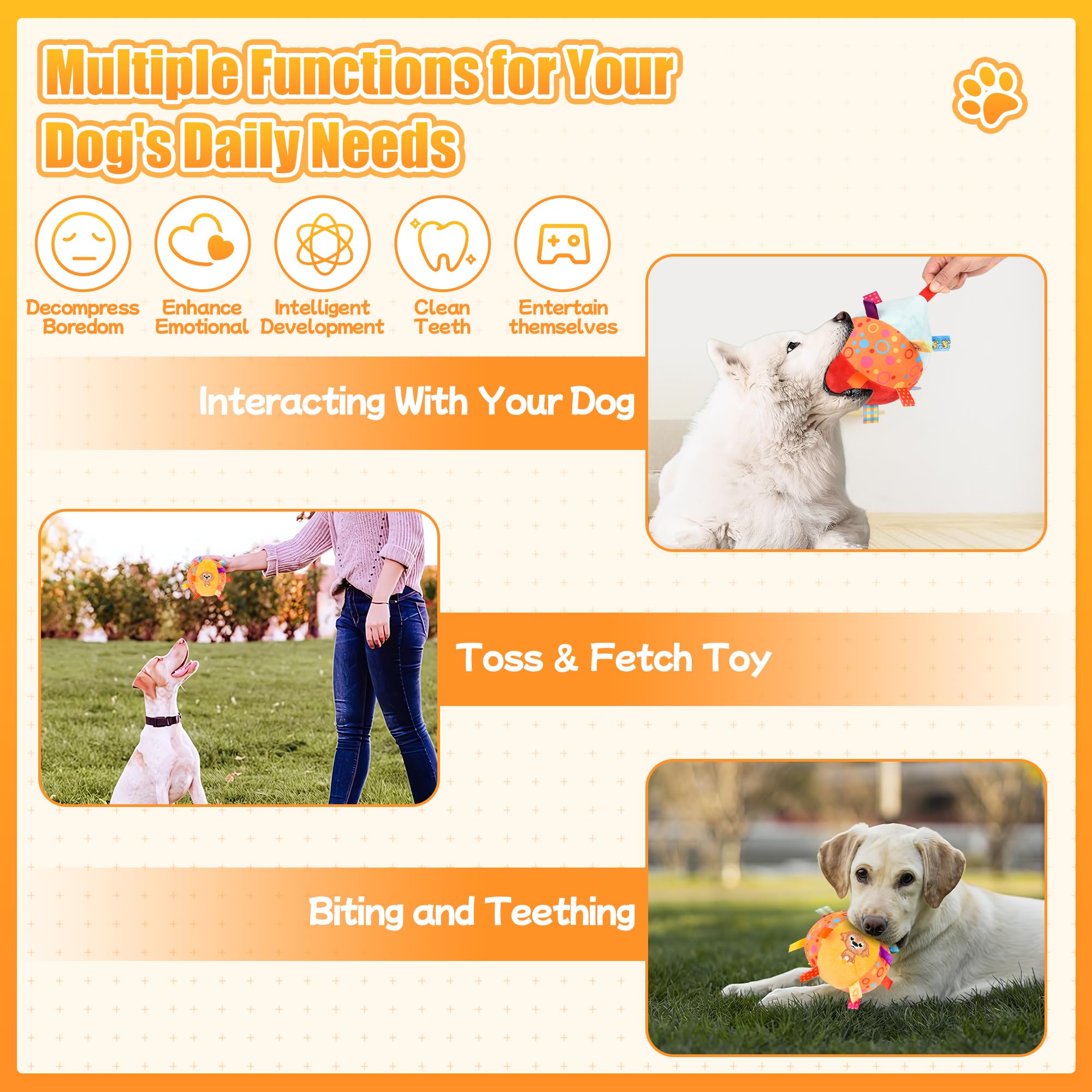 Safe and High-quality Material: Interactive Dog Toys within the 100% natural and high quality PP cotton-stuffed inside and outer surface made of soft plush material, which is food grade, non-toxic and Long-lasting enough, Won't harm your dog's gums during chewing.