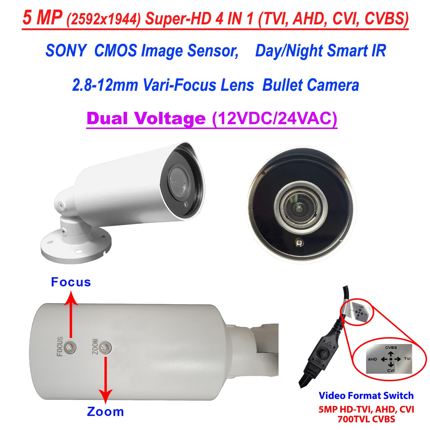 1/2.8" 5MP CMOS Image Sensor, 5Megapixel (2592x1944) Resolution; 3D Mounting Bracket; Dual Voltage DC 12V/650mA, AC 24V/3.4W; 2.8-12 mm Variable Focus Wide Angle Lens; 6 pcs IR Infrared LED Smart IR for night vision and 100ft IR range