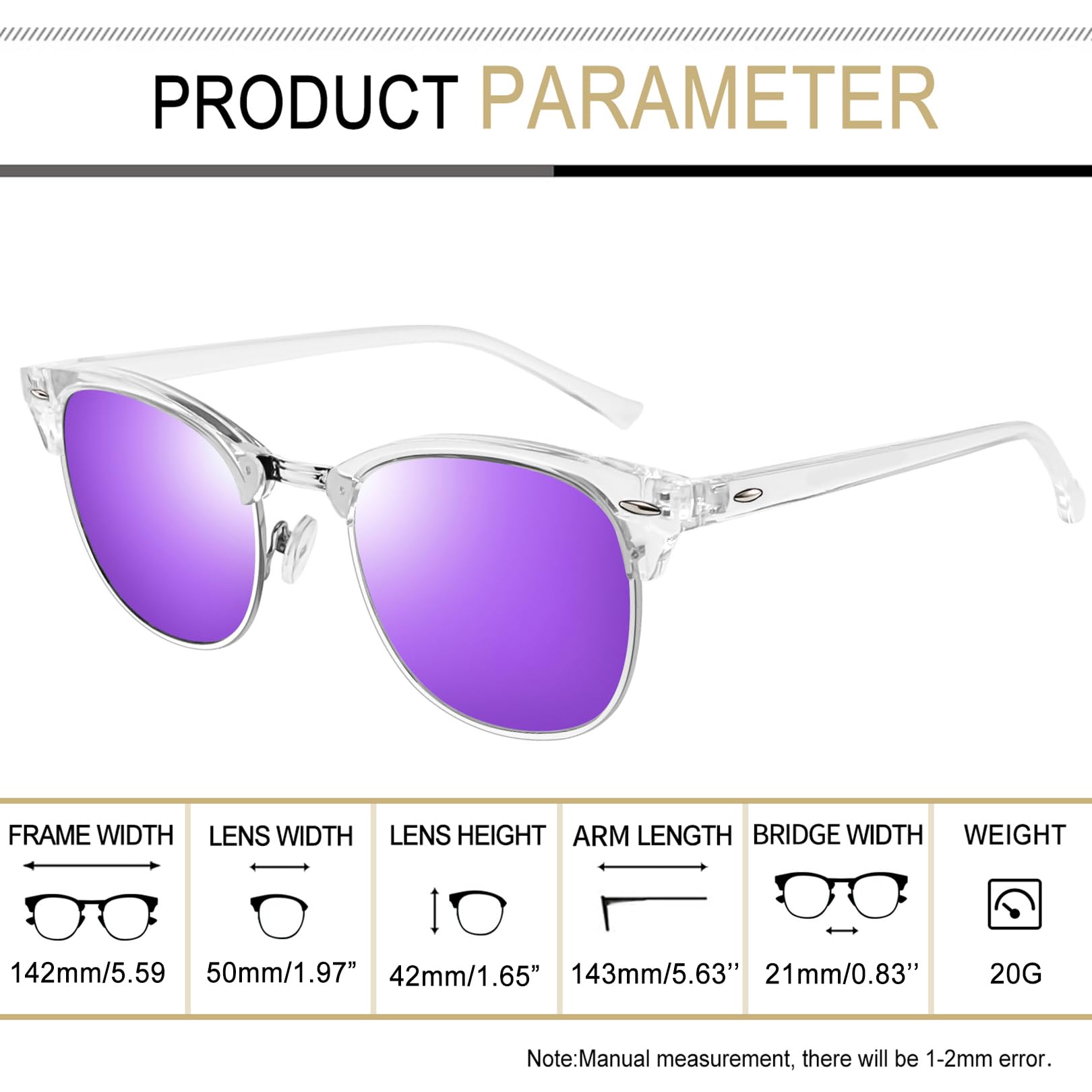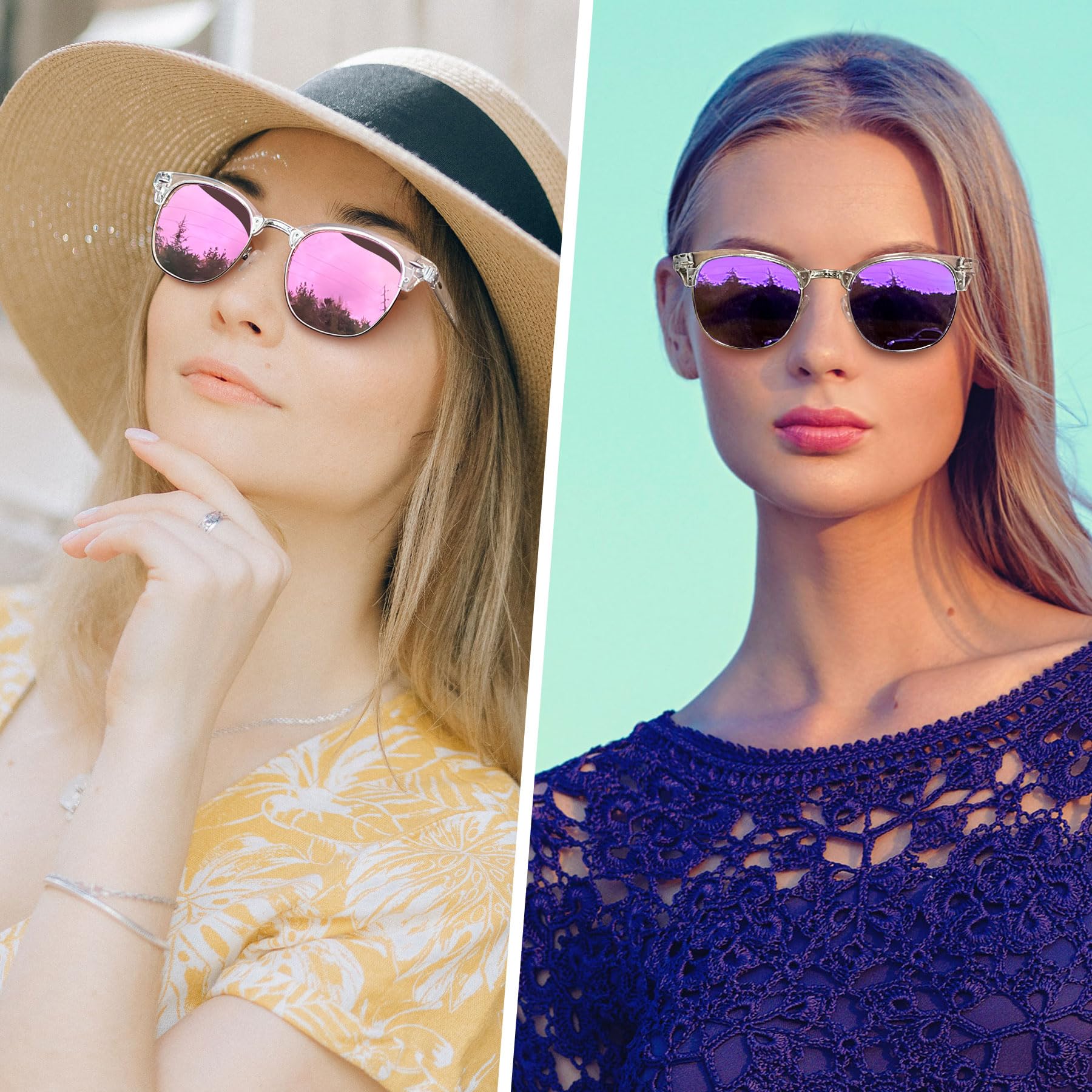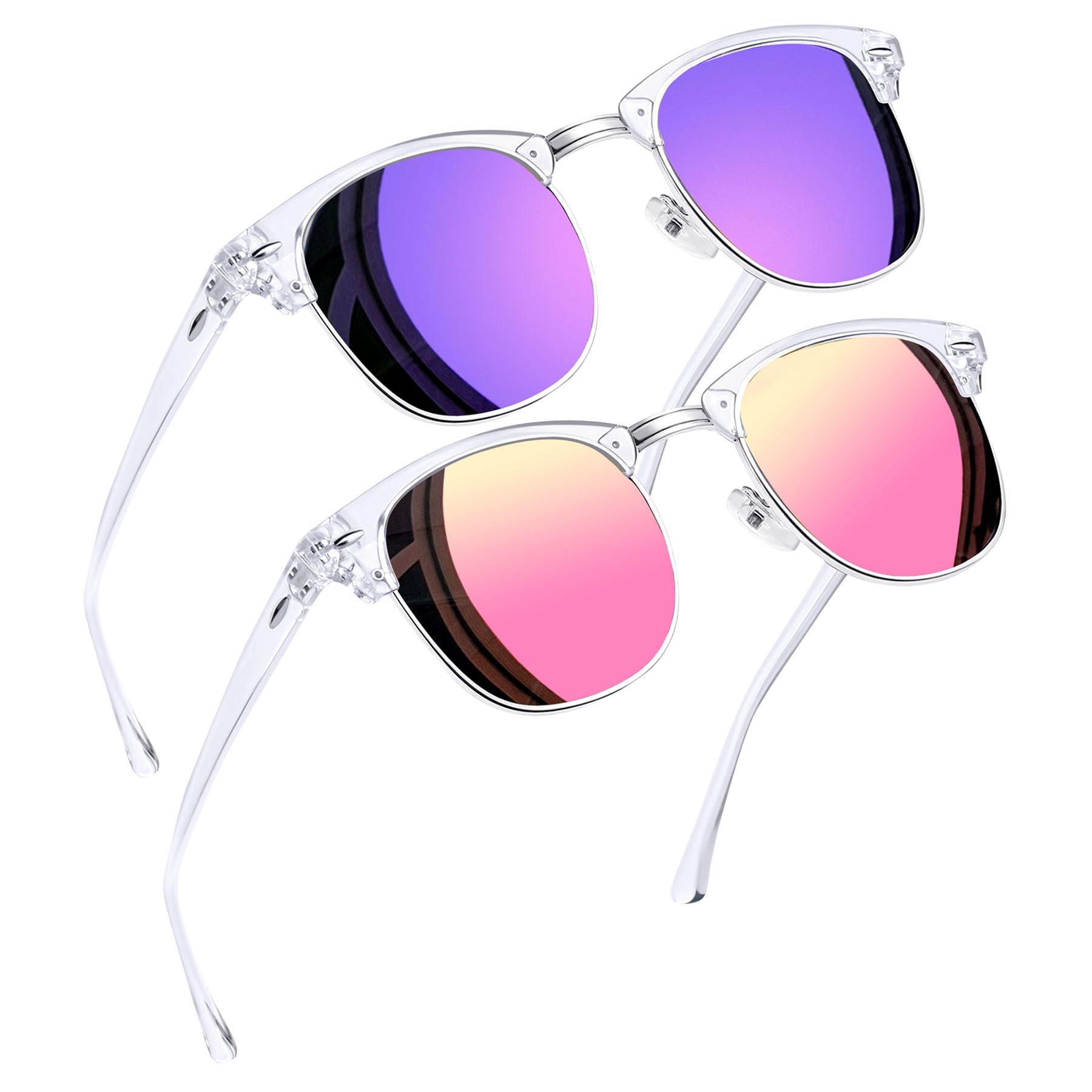 Timeless Unisex Club Master Sunglasses: Club Masters sunglasses date back to the 1950s, were popular in the 1980s, and are still a classic today. Half frame sunglasses have a solid plastic browline area, with sturdy wire metal frame, soft silicone nose pads, metal hinges, and polarized mirrored lenses make clear frame sunglasses perfect for everyday use. 2 pack sunglasses, purple sunglasses make you mysterious, pink sunglasses make you cute