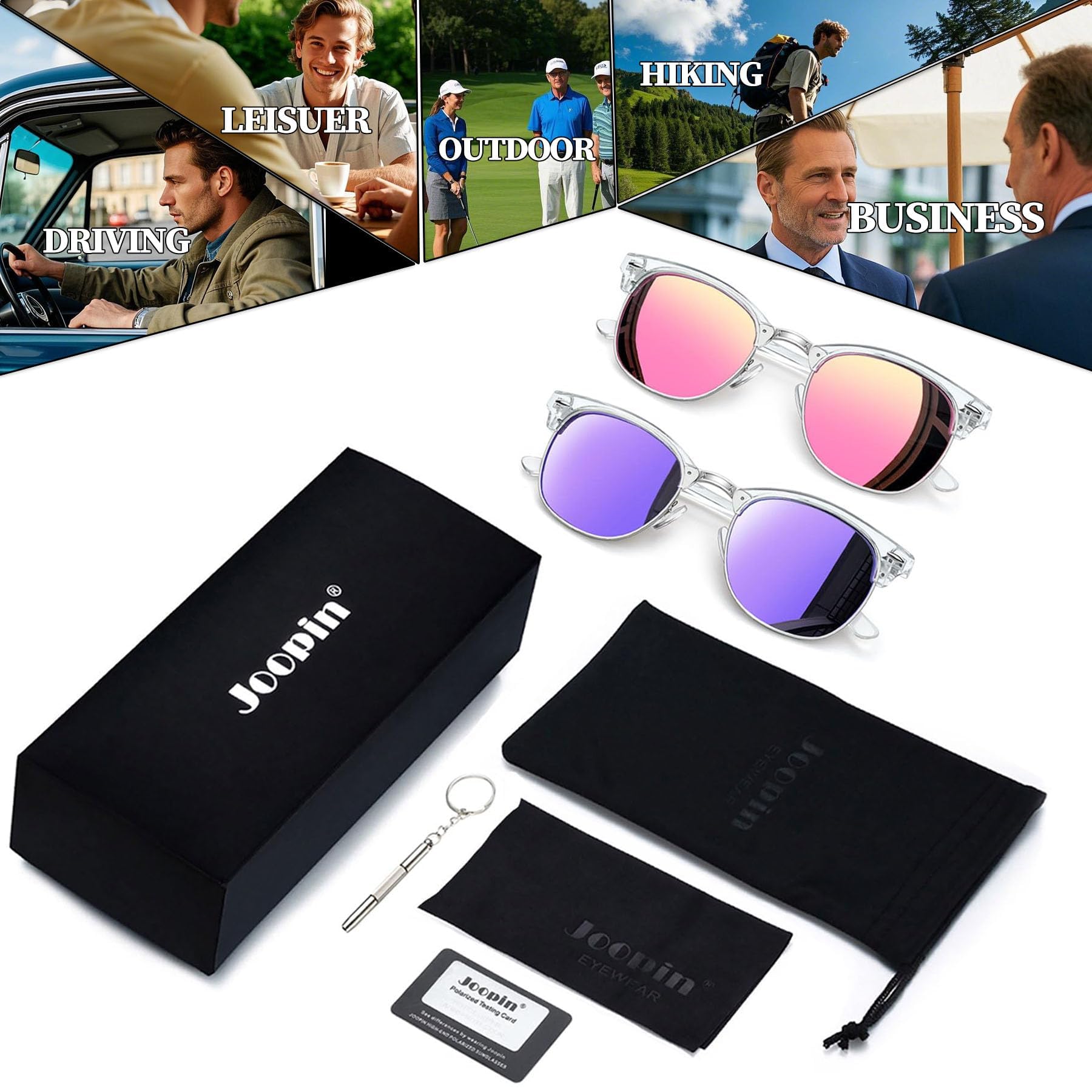 Exquisite Box Packaging: Retro pink sunglasses x 1/ purple lens sunglasses x 1 / soft box x 1/ exquisite bag x 1/lens cloth x 1/ screwdriver x 1/ polarized testing card x1. Joopin focuses on fashionable men sunglasses and women sunglasses. It is packaged already, making it a wonderful yet practical festival idea for friends and family. Click and get your quality and cheap sunglasses now