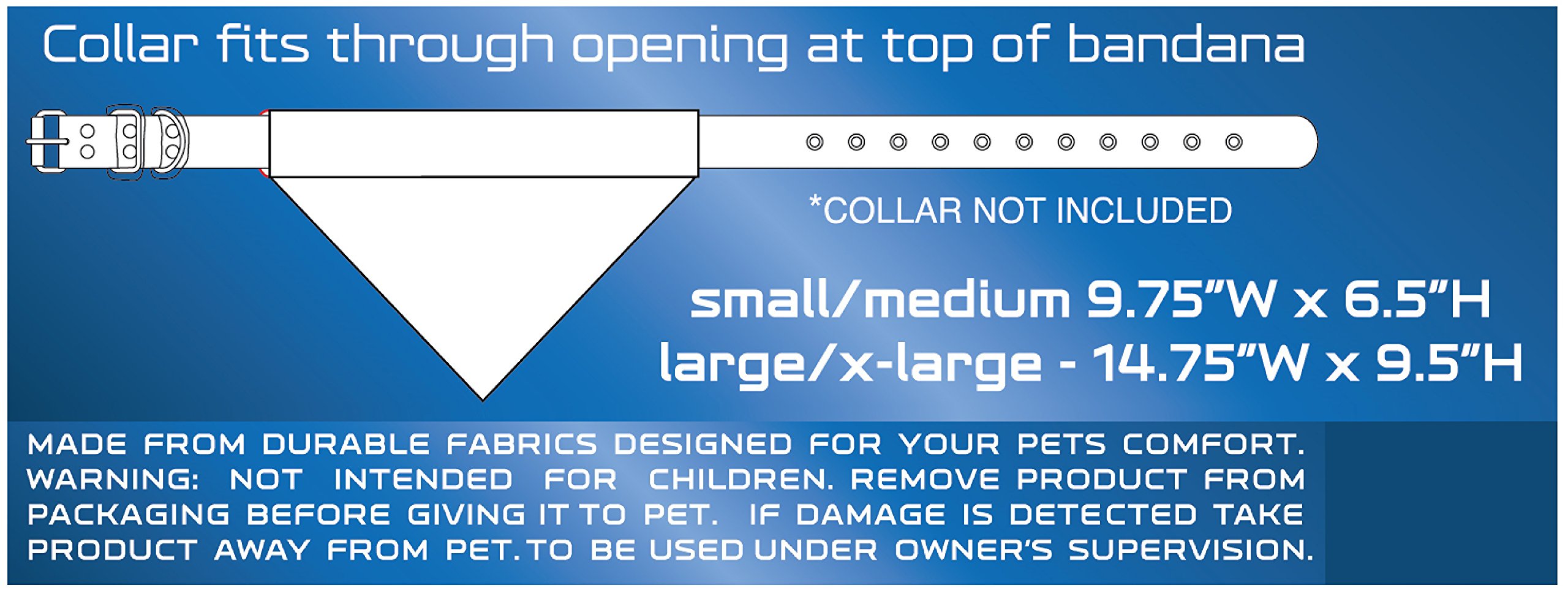 >Your pet will surely be able to show off his/her team spirit with this unique dual sided COLLEGE DOG BANDANA! >Looking for a STRONG and DURABLE DOG COLLAR?? Oh, you also want it to be COOL and Fashionable? Right? >You can now buy your sporty pup the collar of your favorite COLLEGIATE team!!! >This NCAA DOG& CAT BANDANA features a screen printed team logo and name on 1 side & an embroidered team logo on the other side! It will bring fun and excitement to you as well as to your four legged sports fan!!! >Get ready for some SPORTS with a COOL PET BANDANA that includes your favorite TEAM NAME and LOGO so that you can stand out in the crowd! Officially licensed and ready for game day! >This NCAA BANDANA for Pets is made with DURABLE & Comfortable 100% poly-cotton materials that keeps it wrinkle free and easy to clean. It features your favorite Football/Basketball Team NAME and LOGO in vibrant team color! It has a slide-through opening for your Pet Collar! >Great for parties, BBQs, tailgating and even Halloween as a pet costume. Looks even greater with our matching NCAA Pet Collar, NCAA Jersey, NCAA Toys and the rest of our NCAA Pet Collection! >Score a touchdown with this authentic PET COLLAR so your entire family is ready for game day! >SIZING & USE: This COLLEGE BANDANA for DOGS & CATS is available in two sizes, it will fit most dogs, including small dogs, medium dogs and large dogs. Choose from: Small/Medium Pet Bandana and Large/X-Large Pet Bandana. >> Please follow the illustrated Size Chart located in image #2 and match your pet's neck to the correct size! >Our LICENSED PET BANDANA comes in 50+ COLLEGIATE TEAMS: Cincinnati Bearcats, Connecticut Huskies, East Carolina Pirates, Houston Cougars, Memphis Tigers, Navy Midshipmen, Smu Mustangs, South Florida Bulls, Temple Owls, Tulane Green Wave, Tulsa Golden Hurricane, Boston College Eagles, Clemson Tigers, Duke Blue Devils, Florida State Seminoles, Georgia Tech Yellow Jackets, Louisville Cardinals, Miami (Fl) Hurricanes, North Carolina Tar Heels, North Carolina State Wolfpack, Pittsburgh Panthers, Syracuse Orange, Virginia Cavaliers, Virginia Tech Hokies, Wake Forest Demon Deacons, Baylor Bears, Iowa State Cyclones, Kansas Jayhawks, Kansas State Wildcats, Oklahoma Sooners, Oklahoma State Cowboys, Tcu Horned Frogs, Texas Longhorns, Texas Tech Red Raiders, West Virginia Mountaineers, Illinois Fighting Illini, Indiana Hoosiers, Iowa Hawkeyes, Maryland Terrapins, Michigan Wolverines, Michigan State Spartans, Minnesota Golden Gophers, Nebraska Cornhuskers, Northwestern Wildcats, Ohio State Buckeyes, Penn State Nittany Lions, Purdue Boilermakers, Rutgers Scarlet Knights, Wisconsin Badgers, Charlotte 49ers, Fiu Golden Panthers, Florida Atlantic Owls, Louisiana Tech Bulldogs, Marshall Thundering Herd, Middle Tennessee Blue Raiders, North Texas Mean Green, Old Dominion Monarchs, Rice Owls, Southern Miss Golden Eagles, Uab Blazers, Utep Miners, Utsa Roadrunners, Western Kentucky Hilltoppers, Army West Point Black Knights, Byu Cougars, Liberty Flames, Massachusetts Minutemen, New Mexico State Aggies, Notre Dame Fighting Irish, Akron Zips, Ball State Cardinals, Bowling Green Falcons, Buffalo Bulls, Central Michigan Chippewas, Eastern Michigan Eagles, Kent State Golden Flashes, Miami (Oh) Redhawks, Northern Illinois Huskies, Ohio Bobcats, Toledo Rockets, Western Michigan Broncos, Air Force Falcons, Boise State Broncos, Colorado State Rams, Fresno State Bulldogs, Hawaii Rainbow Warriors, Nevada Wolf Pack, New Mexico Lobos, San Diego State Aztecs, San Jose States Partans, Unlv Rebels, Utah State Aggies, Wyoming Cowboys, Arizona Wildcats, Arizona State Sun Devils, California Golden Bears, Colorado Buffaloes, Oregon Ducks, Oregon State Beavers, Stanford Cardinal, Ucla Bruins, Usc Trojans, Utah Utes, Washington Huskies, Washington State Cougars, Alabama Crimson Tide, Arkansas Razorbacks, Auburn Tigers, Florida Gators, Georgia Bulldogs, Kentucky Wildcats, Lsu Tigers, Mississippi State Bulldogs, Missouri Tigers, Ole Miss Rebels, South Carolina Gamecocks, Tennessee Volunteers, Texas A&m Aggies, Vanderbilt Commodores, Appalachian State Mountaineers, Arkansas State Red Wolves, Coastal Carolina Chanticleers, Georgia Southern Eagles, Georgia State Panthers, Louisiana Ragin' Cajuns, Louisiana-monroe Warhawks, South Alabama Jaguars, Texas State Bobcats, Troy Trojans, Ucf Knights, Wichita State Shockers, Albany Great Danes, Binghamton Bearcats, Hartford Hawks, Maine Black Bears, Massachusetts-lowell River Hawks, New Hampshire Wildcats, Stony Brook Seawolves, Umbc Retrievers, Vermont Catamounts, Davidson Wildcats, Dayton Flyers, Duquesne Dukes, Ford Hamrams, George Mason Patriots, George Washington Colonials, La Salle Explorers, Rhode Island Rams, Richmond Spiders, Saint Joseph's (Pa) Hawks, Saint Louis Billikens, St. Bonaventure Bonnies, Virginia Commonwealth Rams, Florida Gulf Coast Eagles, Jacksonville Dolphins, Kennesaw State Owls, Lipscomb Bisons, N. j. i. t. Highlanders, North Alab