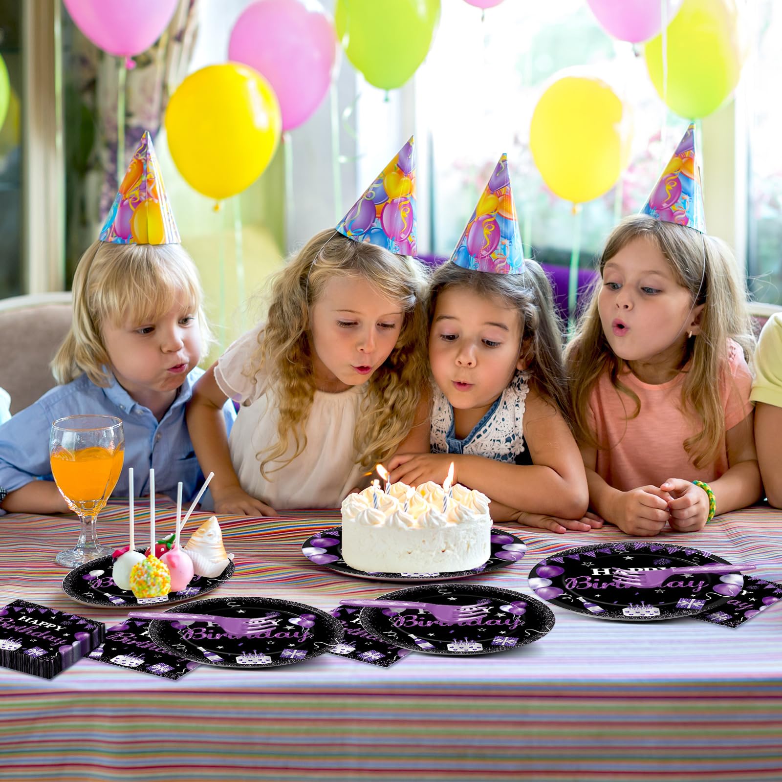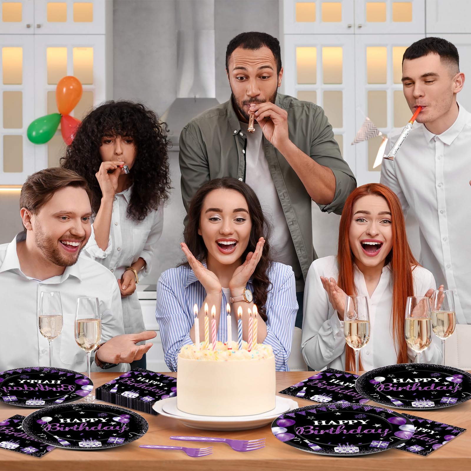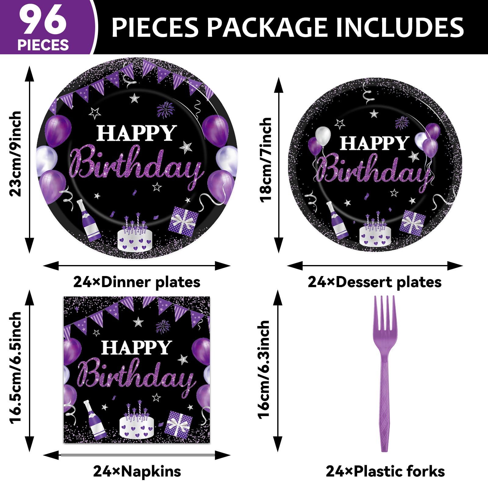 Packing content: Our birthday party tableware set includes 24pcs 9 inch purple black dinner plates, 24pcs 7 inch dessert plates, 24pcs napkins and 24pcs purple forks that can serve 24 guests at a birthday party.