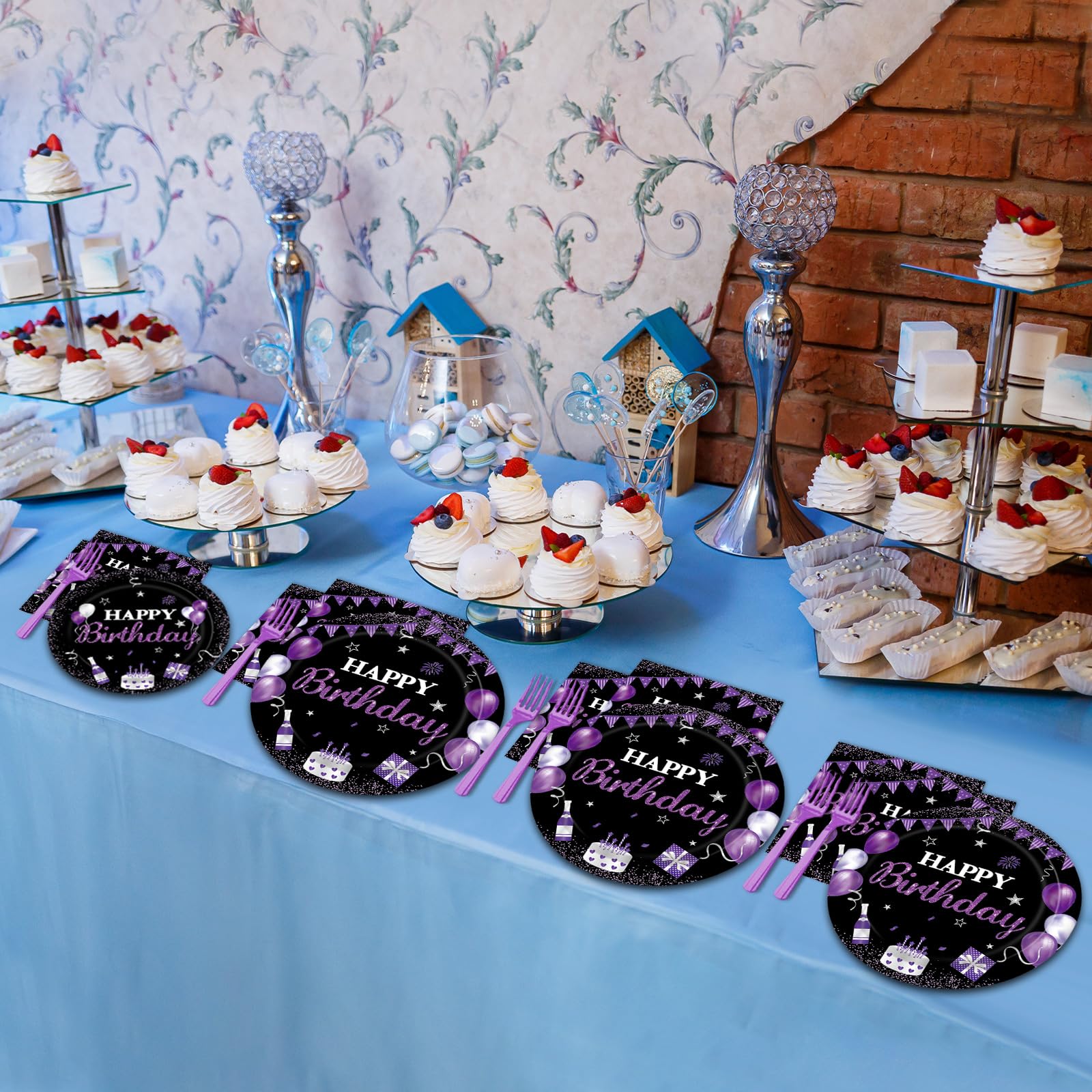Romantic atmosphere: With its charming black purple and silver colors, our purple silver birthday party decorations effortlessly create a romantic and enchanting atmosphere. Elevate your special occasions with this exquisite purple black tableware set that invites a romantic ambiance to enhance every moment shared with loved ones.