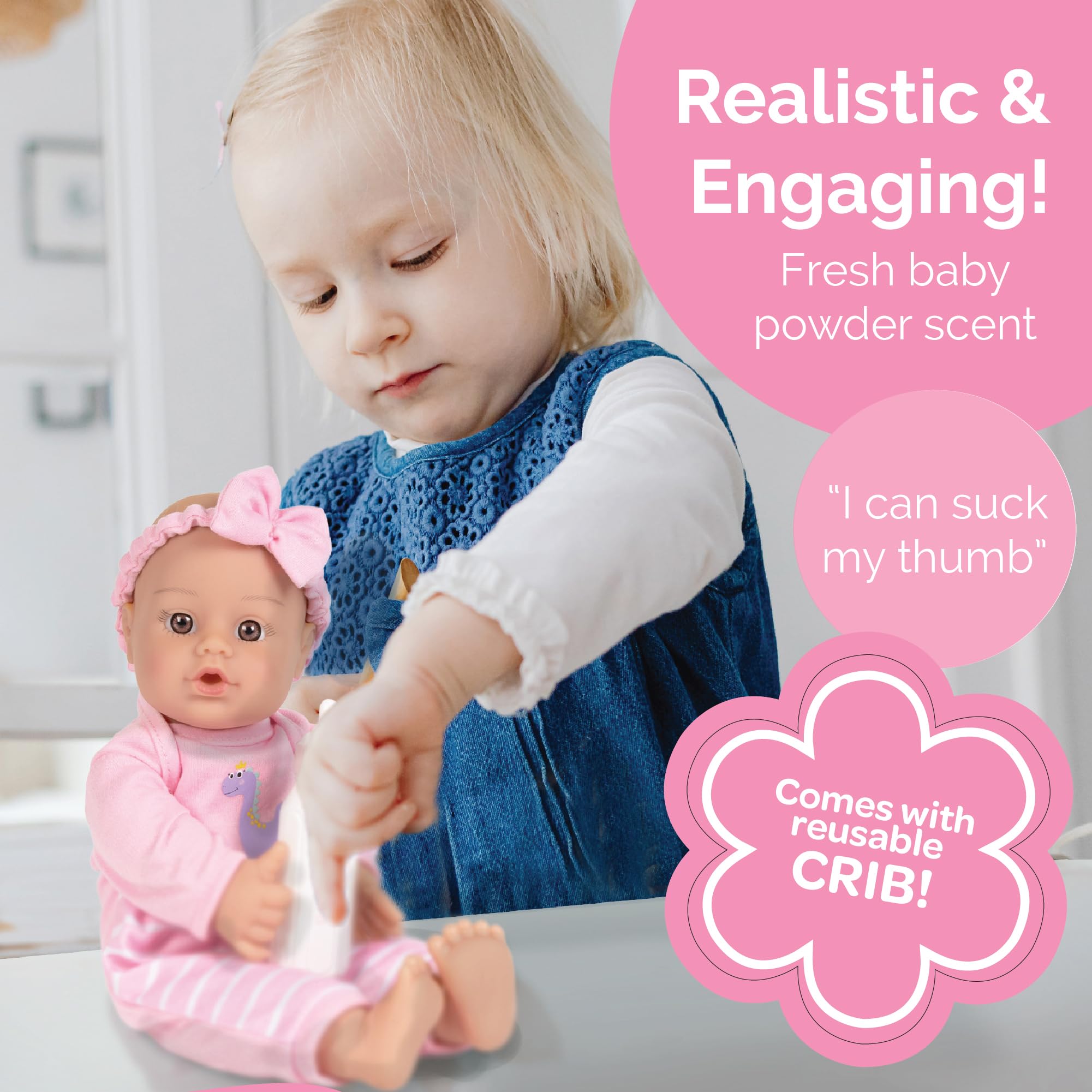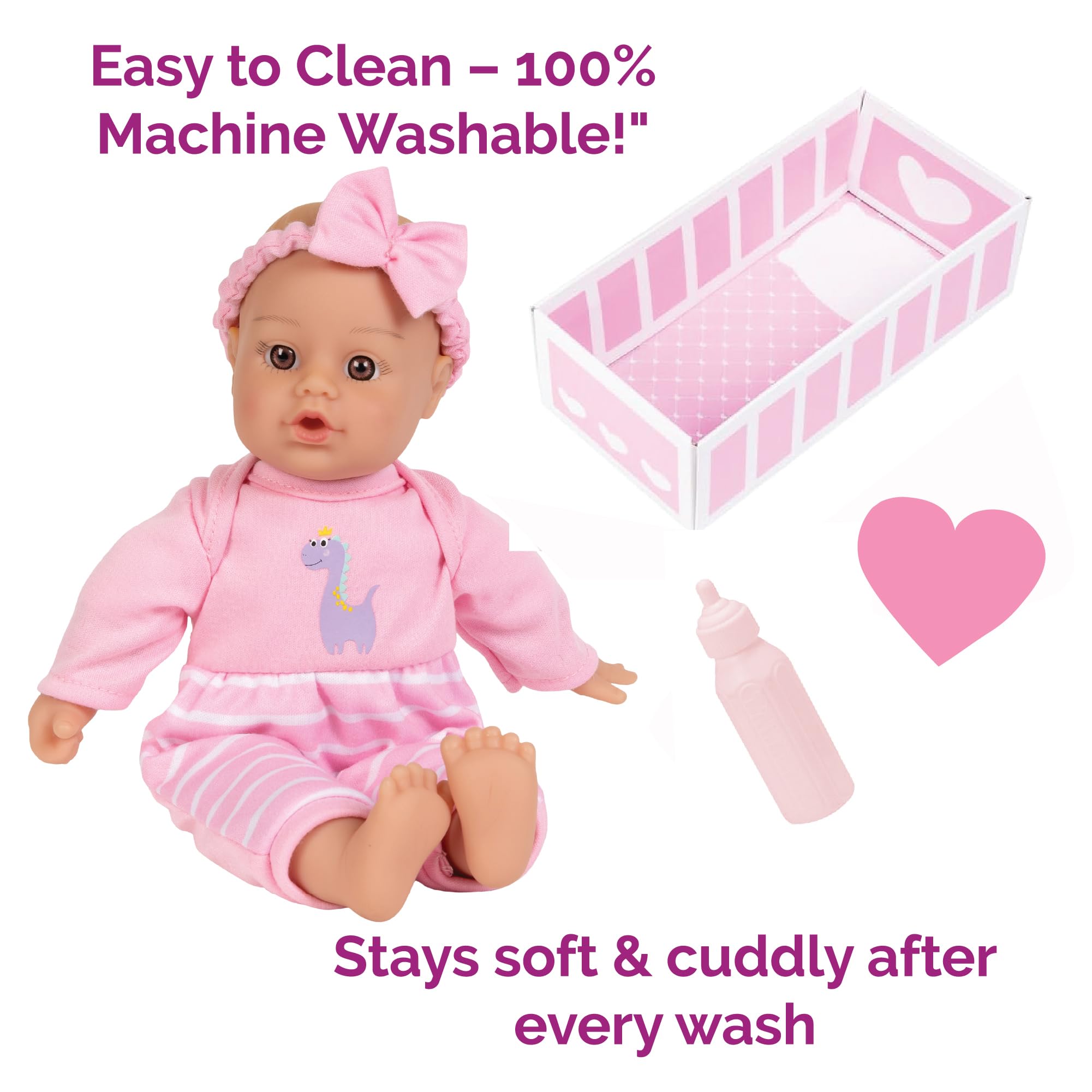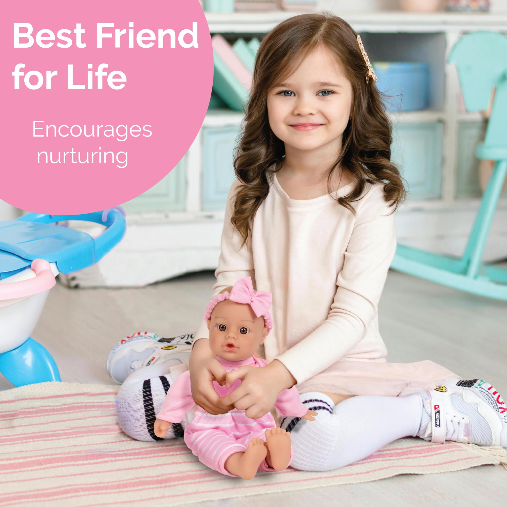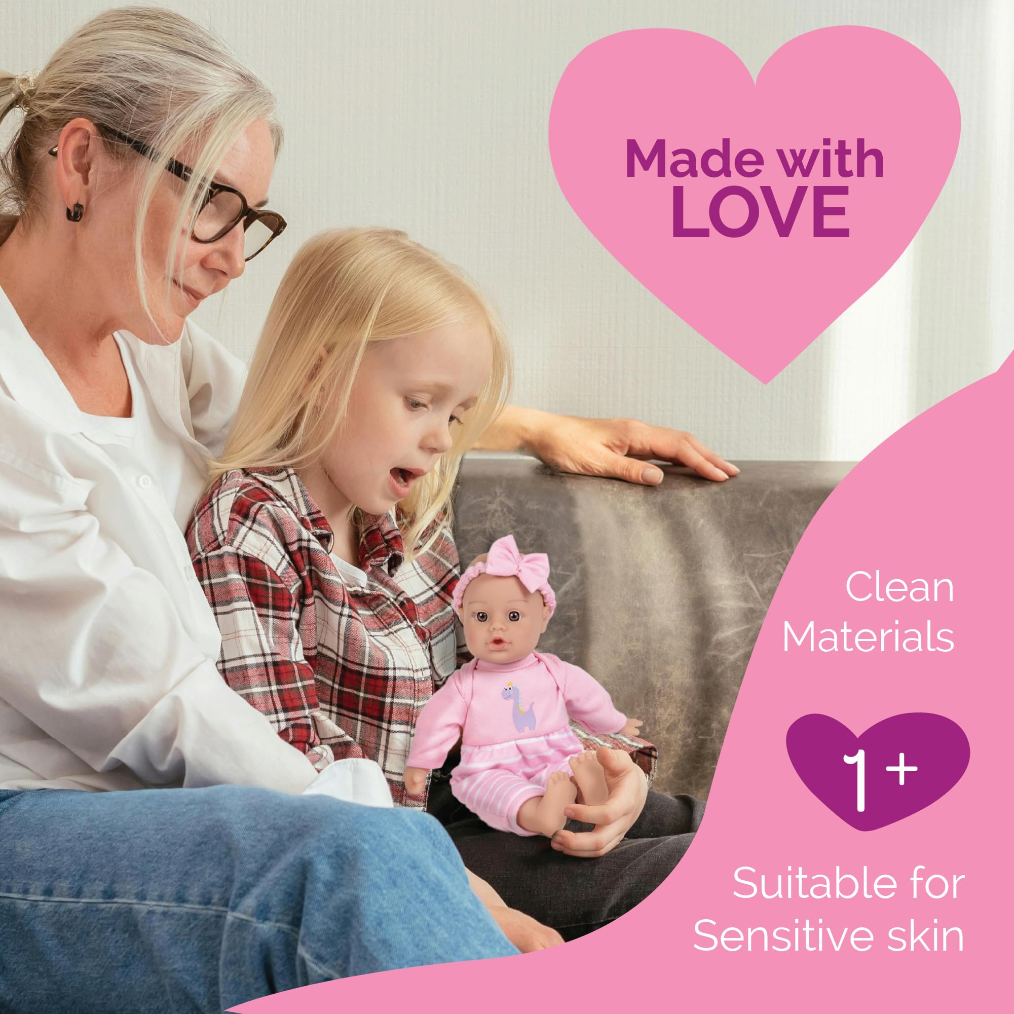 Soft & Easy to Hold: This 11” baby doll has a lightweight cloth body that’s comfortable to carry and built for durability. Its flexible design allows for easy positioning, making it great for interactive play, rest time, or travel without feeling bulky or hard to manage