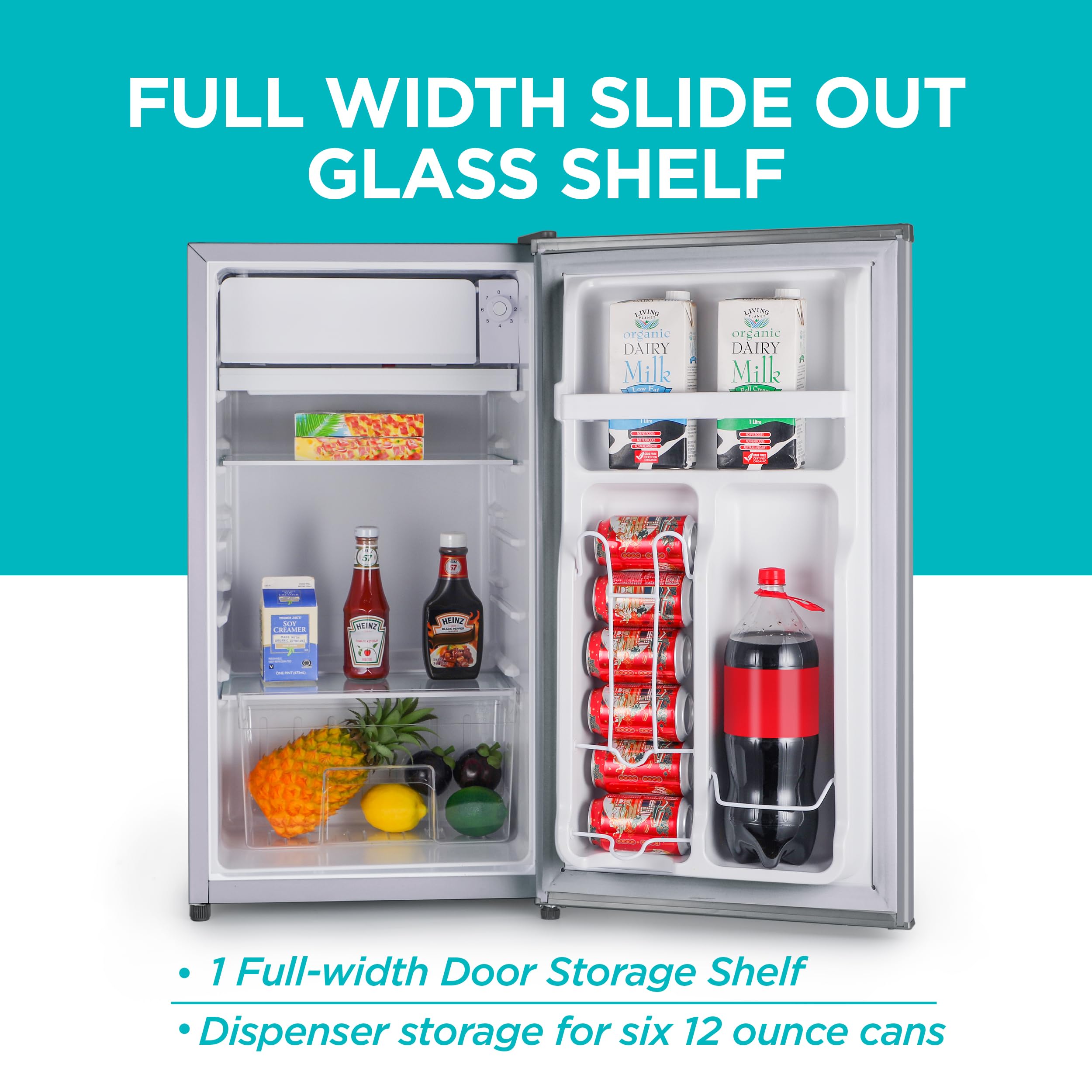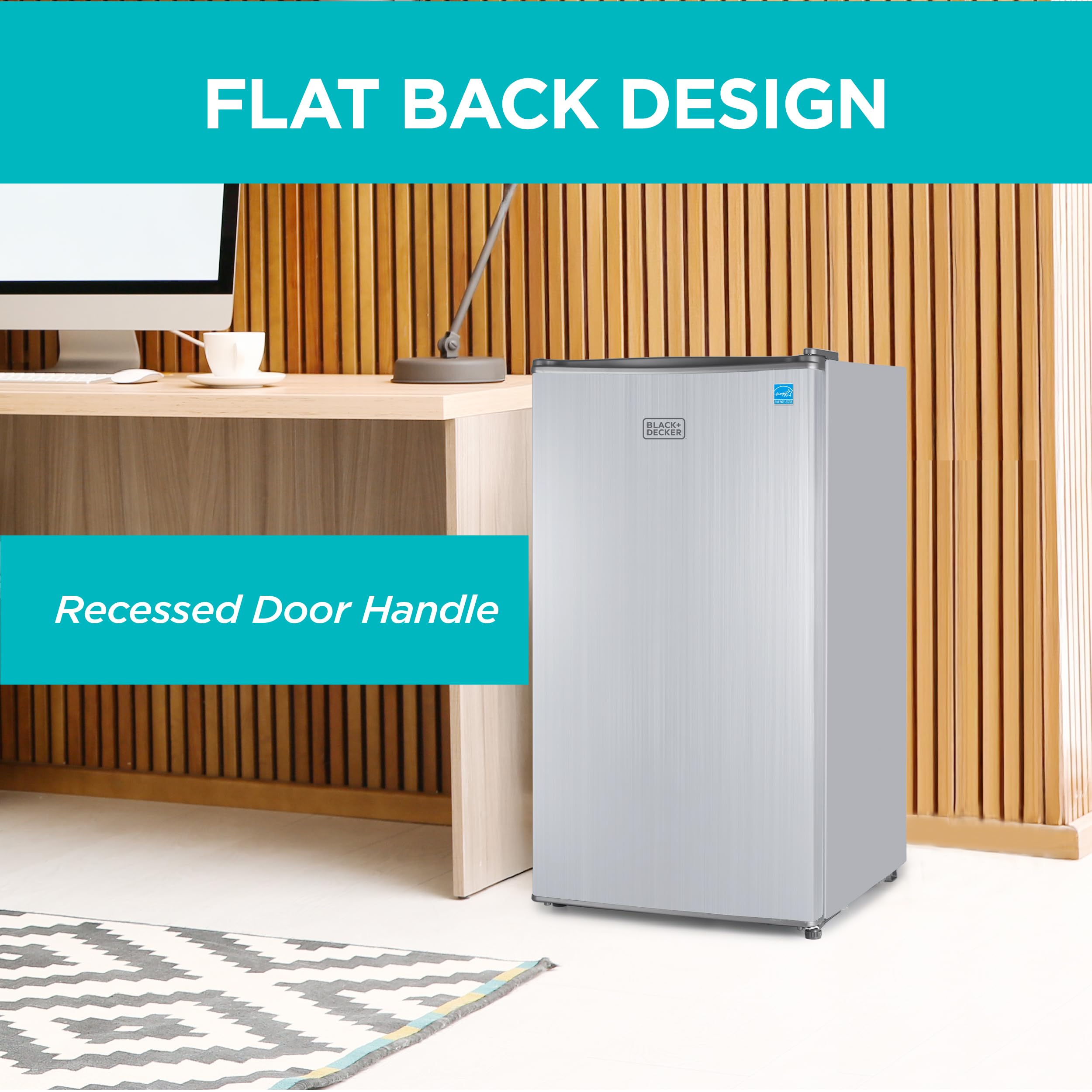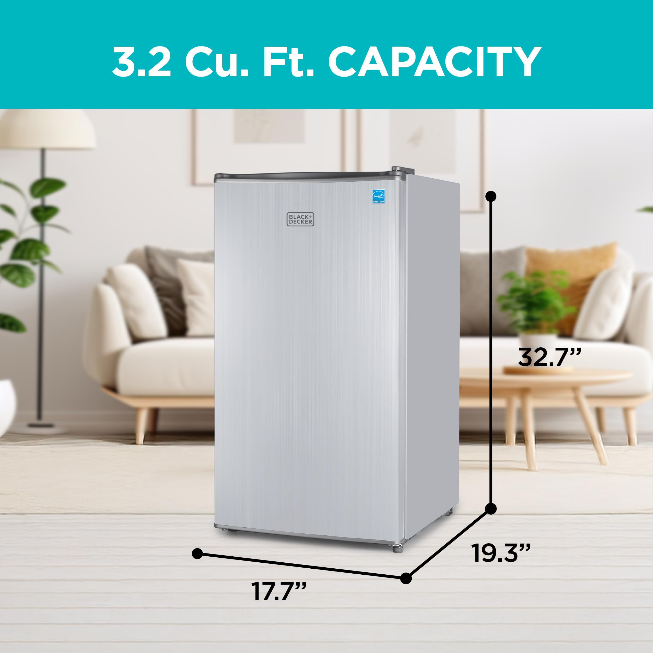 Enjoy refreshing beverages, snacks, and meals whenever you want with this BLACK+DECKER 3.2 cubic foot compact refrigerator. With fridge dimensions of 17.7” x 19.3” x 21.7” and a weight of 47.7 lbs., you can easily place this small fridge in your work office, kitchen, dorm room, RV, bedroom, and more! This fridge has manual defrost, a recessed door handle for easy opening and closing, adjustable leveling legs, reversible door, and space-saving flat back design. Our office refrigerator includes 2 full-width slide-out adjustable glass shelves, 1 full-width crisper with glass cover, as well as 1 full-width door and storage shelf. Additionally, there’s 2-liter storage and even dispenser storage for up to 12 cans of soda at one time. Now you can keep the party going knowing you have such a reliable and trustworthy new compact fridge. There’s even a true freezer (12.8” x 4.3”) at the top of the unit complete with ice cube tray to keep your drinks cold. Use this amazing compact refrigerator for frozen foods, drinks, food trays, and more. This unit takes R600a refrigerant to ensure no ozone depletion and comes with an easily adjustable temperature control. It even comes with a power cord length of nearly 5 feet. 120V/60Hz. 85W & Energy Star certified. What are you waiting for? Grab your new office fridge today and let the good times roll!