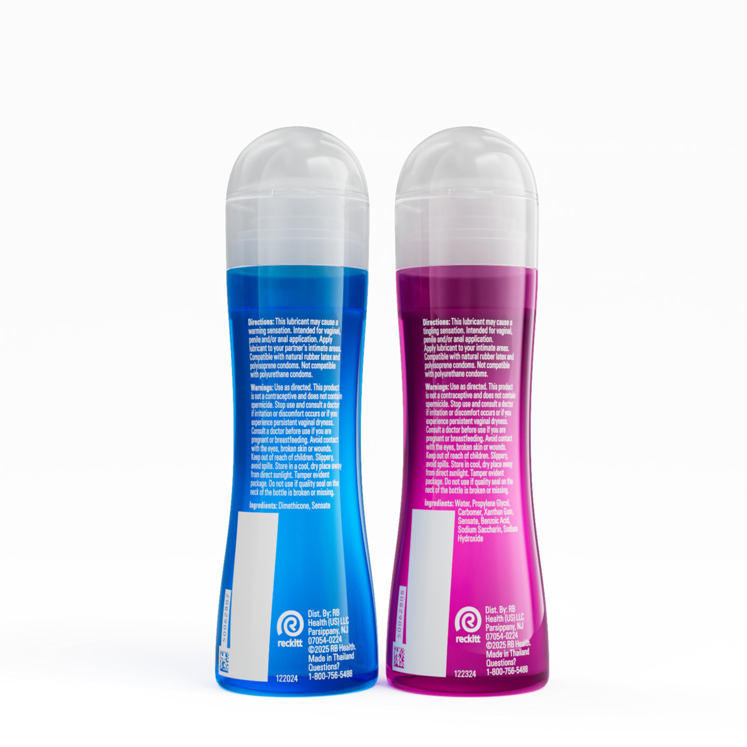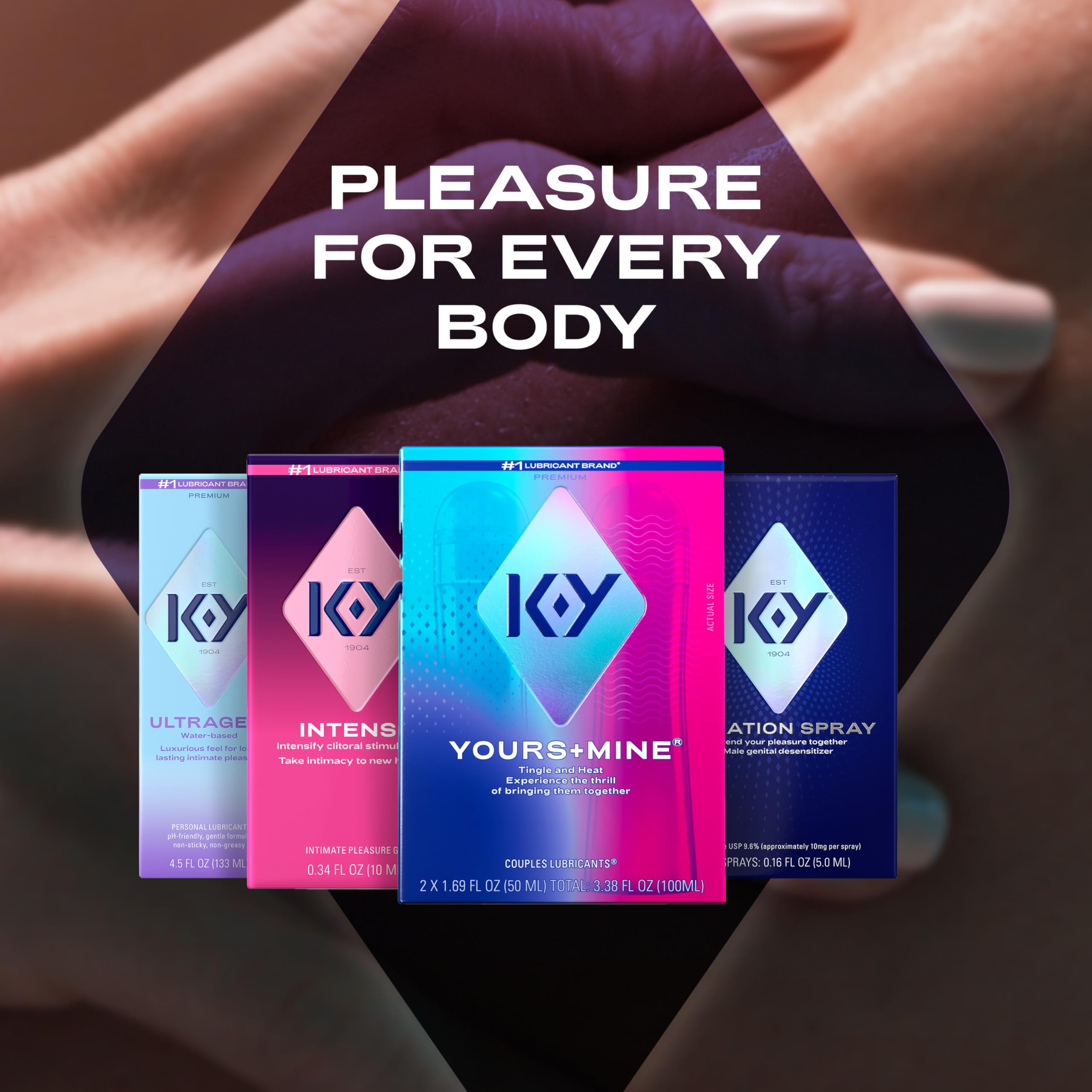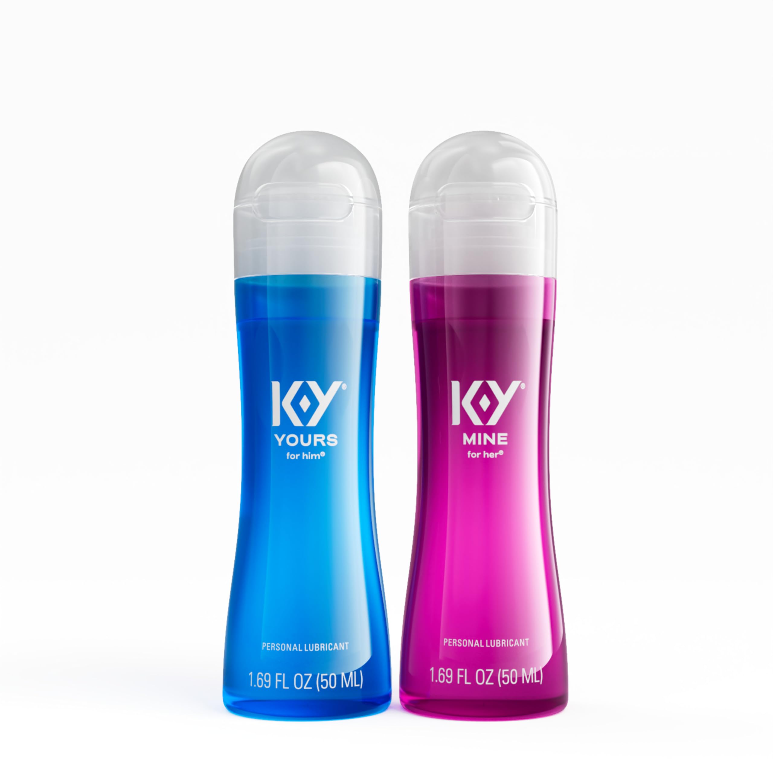 Ready to take your intimacy to thrilling new heights? Ignite the passion with K-Y Yours + Mine Couples lube for sex: the ultimate tool to spice up the bedroom for couples. Unleash your desires and experience a sensational journey with our sensorial couples sex lube. "Mine" water-based lube for women provides a thrilling, tingling sensation for her. "Yours" silcone-based lube for men provides an invigorating, warming sensation for him. When combined, these exciting personal lubricants create a sizzling chemistry that will leave you both craving more. Want to add even more excitement? K-Y Mine lube for women (pink bottle) is a great couples sex toy lube, ensuring endless possibilities for pleasure. The new formula is made without hormones or artificial colorants. Both lubes are compatible with natural rubber latex and polyisoprene condoms (not polyurethane). Take the passion with you wherever you go! Our compact, 1.69 fl oz travel lube bottles are perfect for on-the-go excitement, so you're always prepared for adventure. Whether it's your honeymoon or a quick weekend getaway, K-Y sexual lubricants are the travel accessories you don't want to forget. K-Y is the #1 Brand in Lubricants & Climax Control* & the #1 Doctor Recommended Personal Lubricant Brand**. K-Y Yours + Mine water-based, tingling lubricant for her and silicone-based, warming lube for him—your new favorite additions to your collection of sex stuff. Rest easy knowing that K-Y Yours + Mine couples sexual lubricant will arrive in discreet, plain packaging—your spicy secret is safe with us. *Nielsen POS $ L52W W/E 4.28.2023. **among vaginal lubricants & moisturizers, IQVIA, ProVoice Survey, Dec. 2023