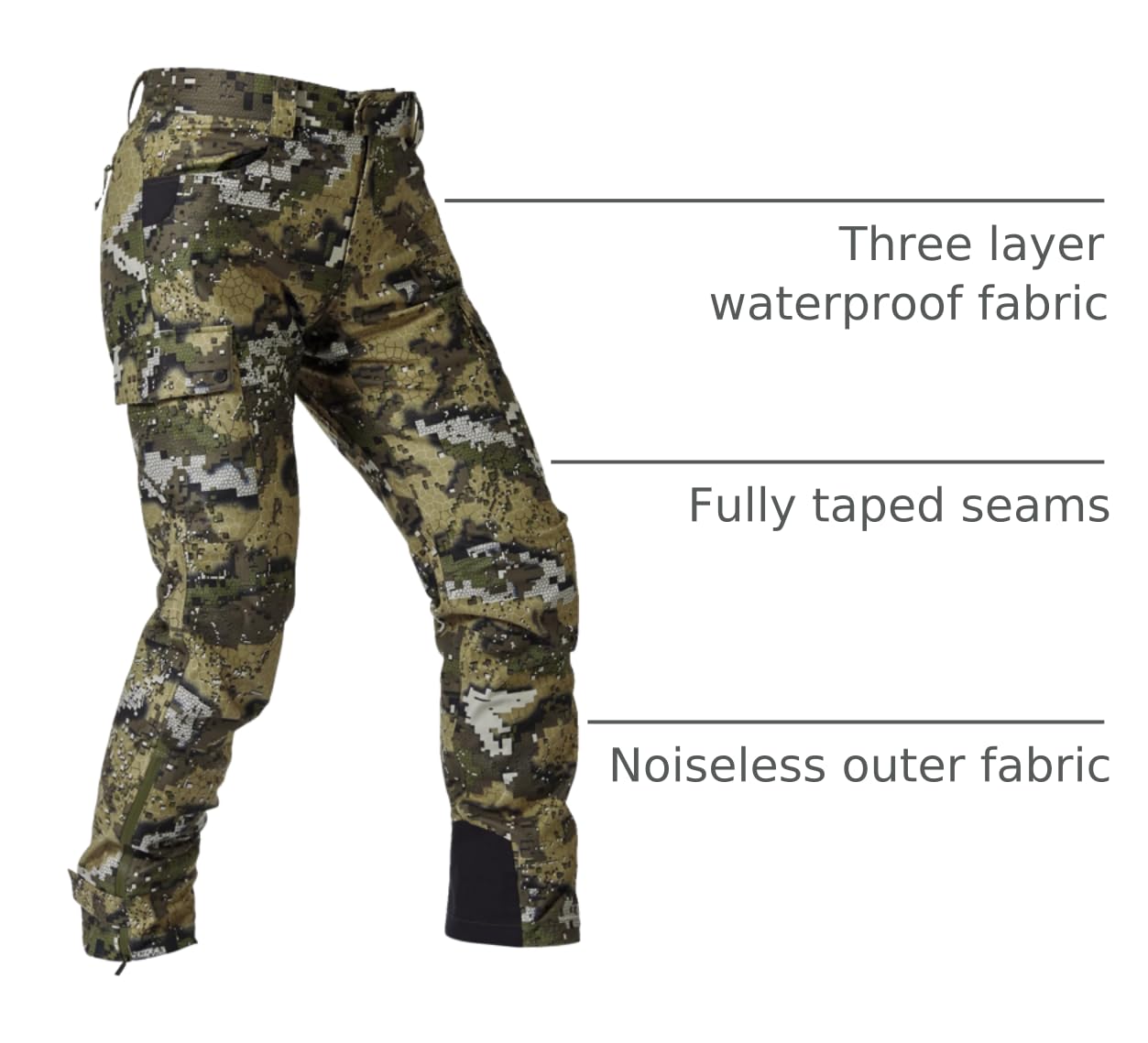 The hunting pants are made of 3 layers of fabric that are both heavy-duty and lightweight, along with fully taped seams, the pants are waterproof and breathable. Outer fabric has been designed to be noiseless, so you can move silently through the woods