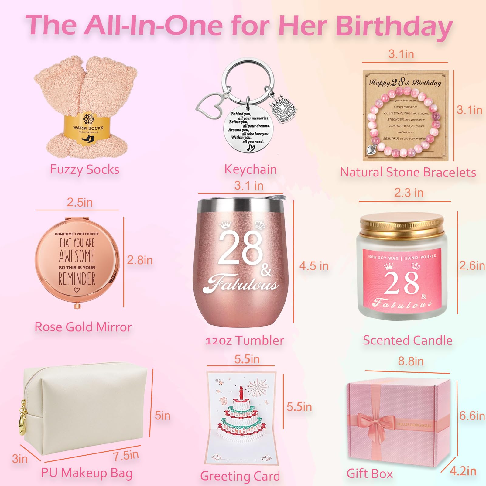 【Best Friends Gifts Box For Girls Women】 Imagine the surprise of receiving this gift on her 28th birthday. She can use candle to make her feel smoothing and is great for sleep-promoting, enjoy the happiness of making up with rose gold mirror and makeup bag and have a morning coffee or afternoon drink with her new favorite wine tumbler. A good day starts with your birthday gifts!